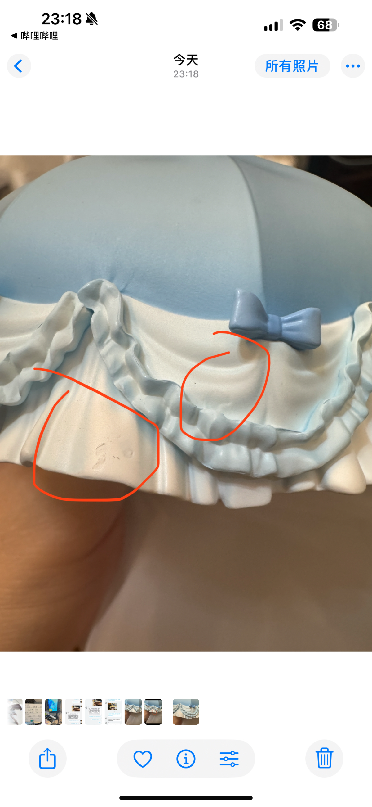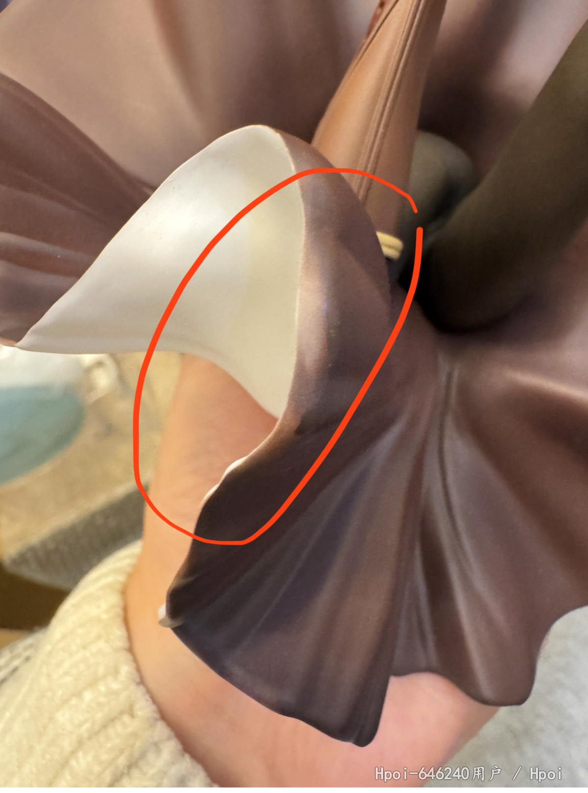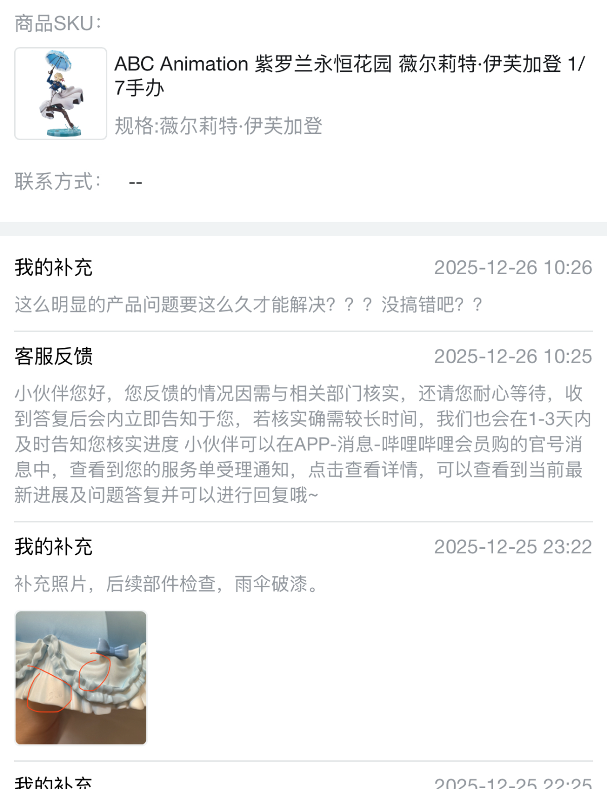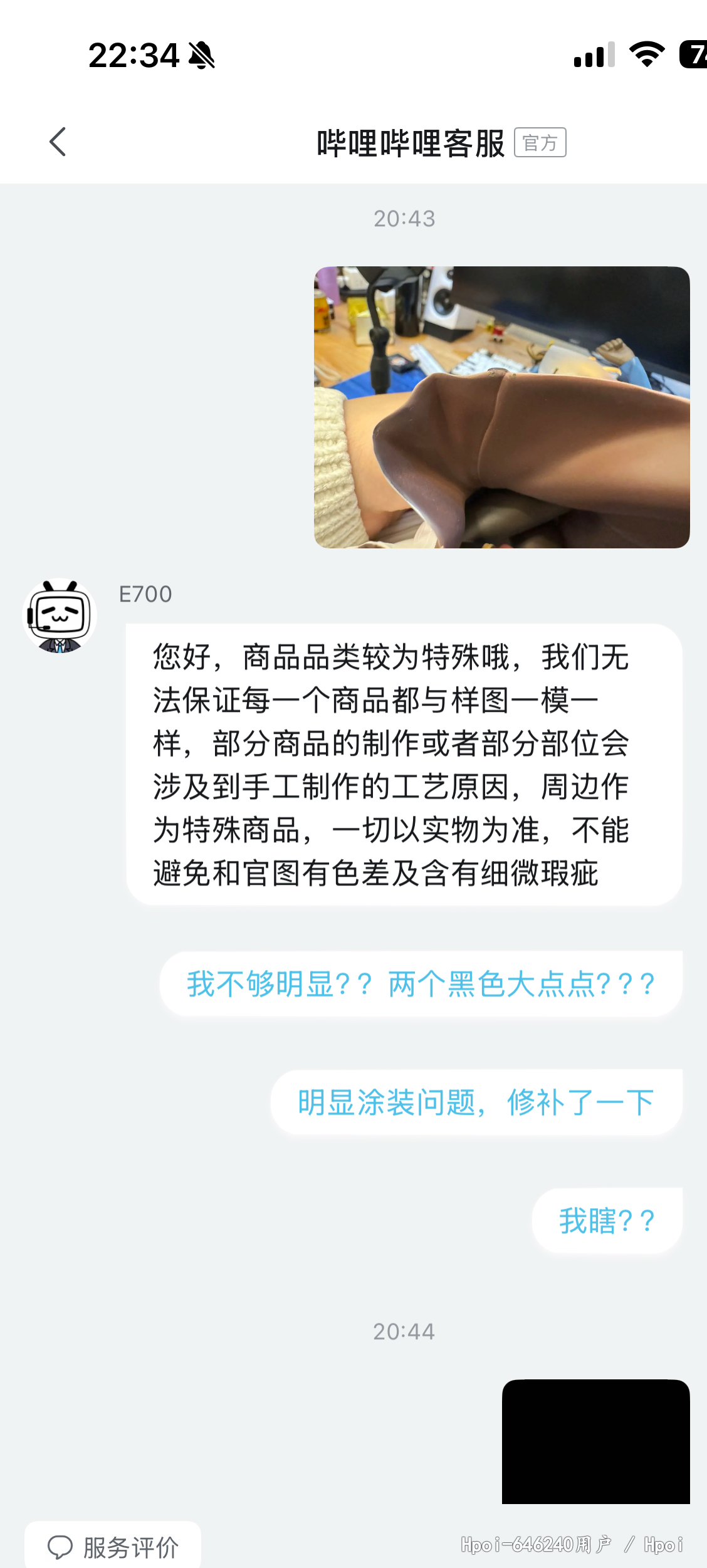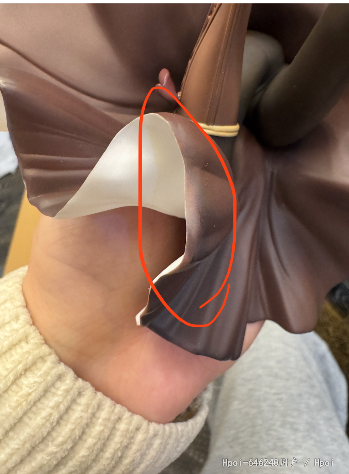 到货,内部雪梨纸被人为拆掉,箱子也存在些许破损,我反馈给hyg,说让继续开箱,开箱后内容物明显存在多处问题,客服说看不见,说是正常的,换货都不给换!这叫正常?别的位置我可以忍,这裙子边能忍?不是明显二次修补过的瑕疵品?而且裙子瑕疵位置正好在左边,正常摆放看的一清二楚。hyg真的厉害了,hyg还十几个手办没补,真是灾难!