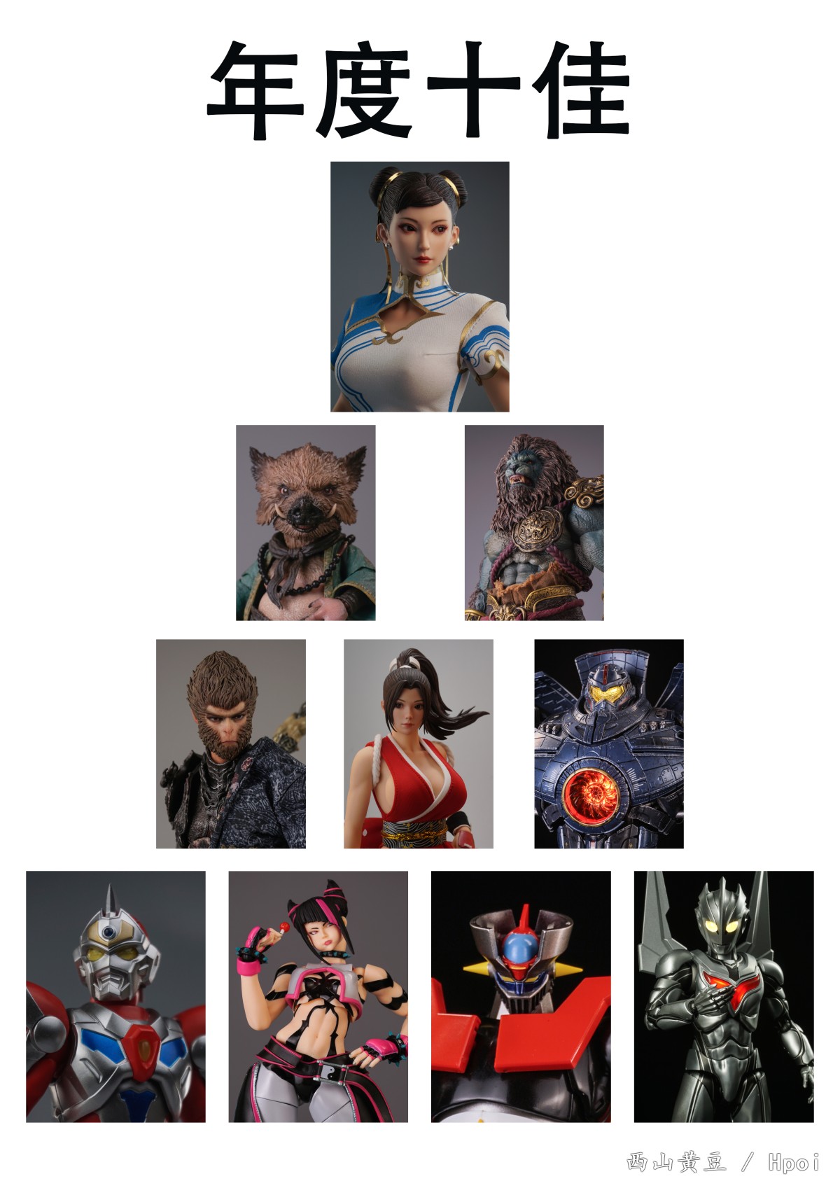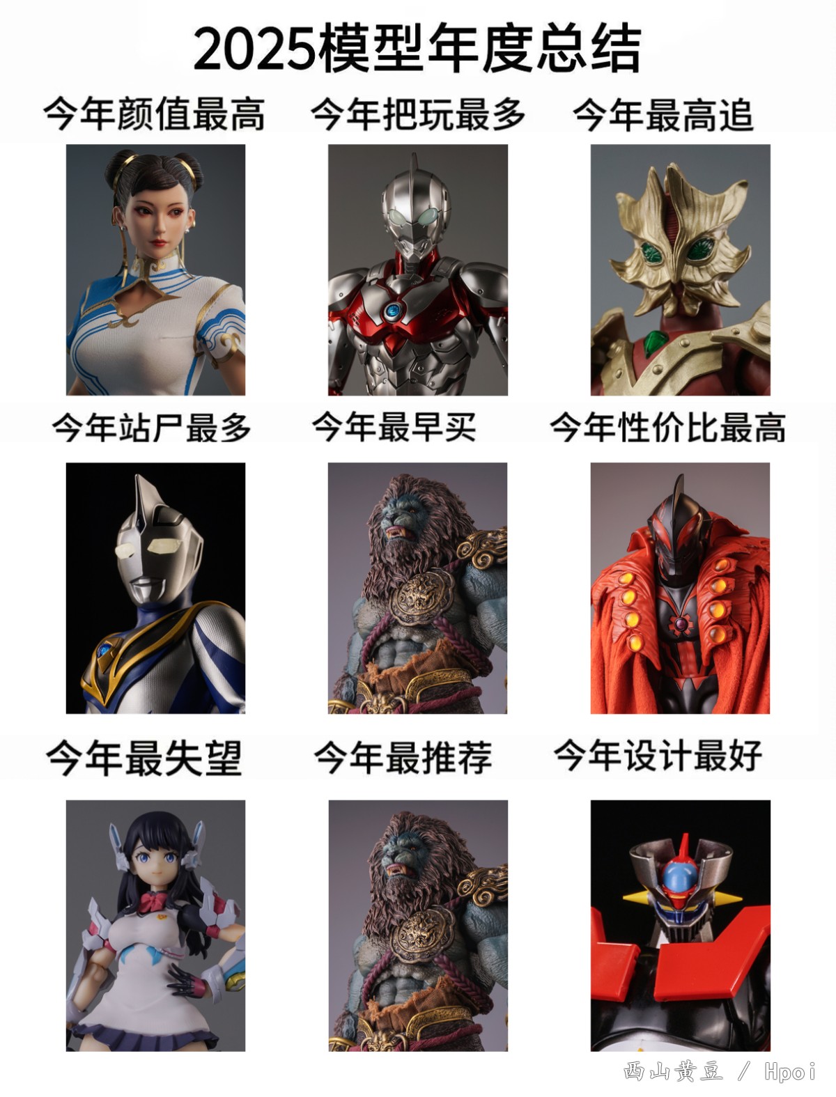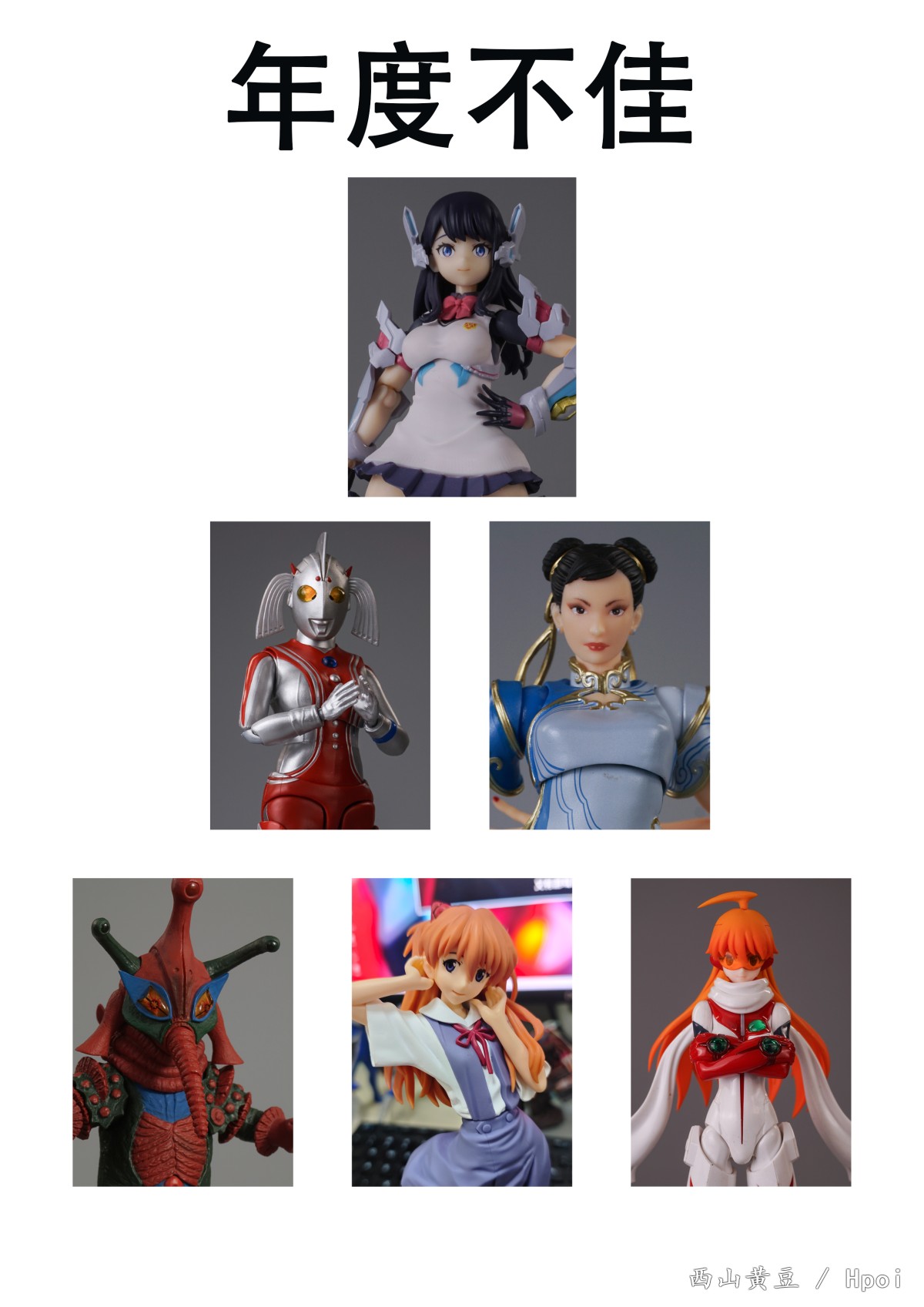 今年也是相当饱满的一年,上完网课后自己水平还是进了一大步,又回到threezero上班,玩具也是越买越多,也是做了些小东西,不过后期图是少了很多。 年度十佳:其实也没啥好说了,都是好看或者好玩的,不过也都是个人感受,很多东西都的取舍也是很主观的东西,开心才是最重要的 年度不佳:后三个其实有点勉强,不过都是期待值偏高导致的 1.hyperbody六花,第一次买这个系列,看到原画很喜欢就无脑定了,一开始还以为是拼装来的,后来知道是成品,想着应该不会差到什么程度,但是到手一玩真是大跌眼镜,胸口的桩位是怎么想到这样设计的,基本上一转就掉,无语了。 2.shf奥特之母,这款算得上是今年被骂的最多的之一了,不过大多数是造型就不喜欢,我小时候看的最多的是昭和,其实单论造型来说我还是觉得很亲切很喜欢的,但是这个可动设计真的是不明所以了,明明同样是女素体的格丽乔和卡尔蜜拉都没怎么翻车,这次奥母的可动真的一言难尽,几乎就是没办法好好摆造型的程度了。 3.海洋堂春丽,余大师延期劲作,面雕自然就不用说了,反而是最小的问题,看久了其实也还算顺眼了,最要命的还是品控和设计,大腿几乎粘死,还得自己修,抄了半天师父的胯部结构可动到最后也没有特别出众,最难崩的还是前后替换的裙摆,简直是把玩地狱,本身空间就不大,还要前后合,又扣不紧,一动就崩出来,简直是灾难。。。 4.希波利特,其实主要还是高追的问题了,本身素质也一般,放在这其实还是有点凑数的。 5.世嘉再版校服明日香,这个还是挺恼火的,本身是买了旧版的,但是看到官图那个腮红以为是增加了涂装,就又买了一个,结果是上当了。 6.moderoid诺诺,主要还是头发的颜色,可以理解拼装选一种颜色,但是素组的头发颜色调的也实在是太丑了点,本来我就懒,还得让我拿起笔来喷一次,今年也是被布鲁可惯坏了