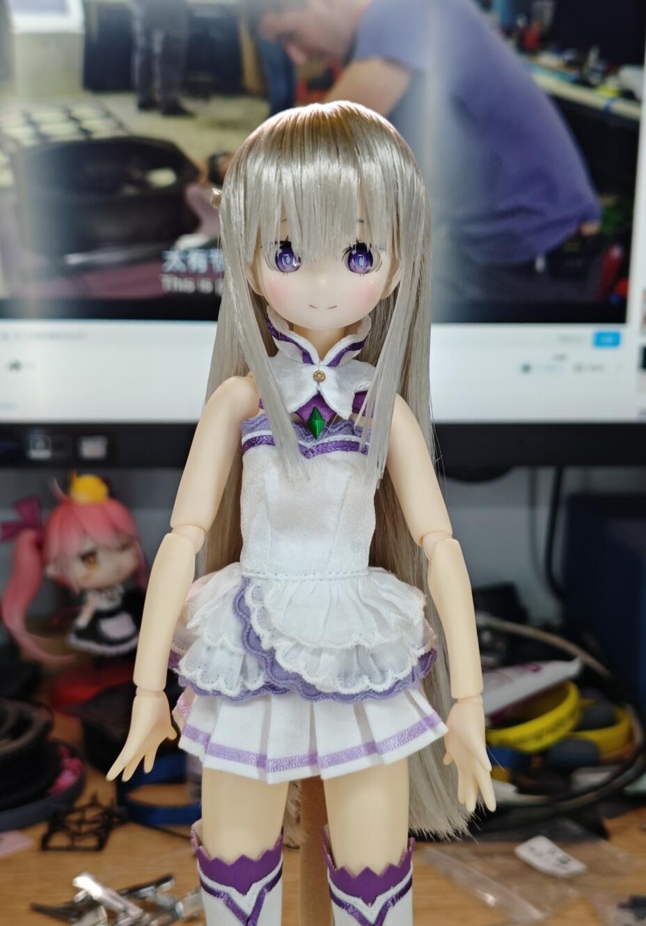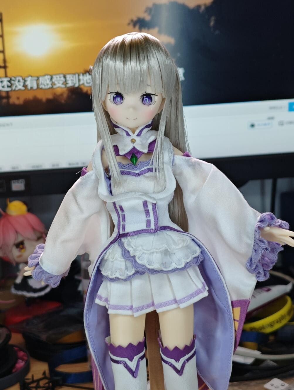 摆了个姿势,放柜子里一直没拍,因为发现照片完全没法表达出人眼中的可爱,10成只能体现个7成最多,感到非常挫败,一直考虑怎么拍的好,太深奥了。比如这玻璃眼就很值得研究,原本在手办里无效的眼神光经常会带来意外的生气,大老远就能看到眼睛上的亮光,而照片中这只是个纯白的小亮点而已……