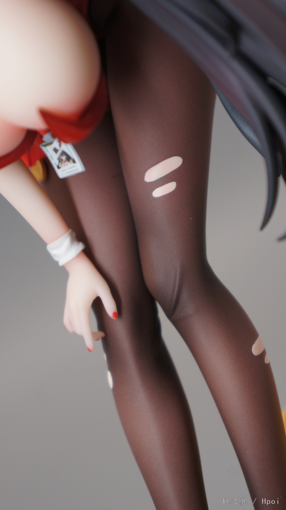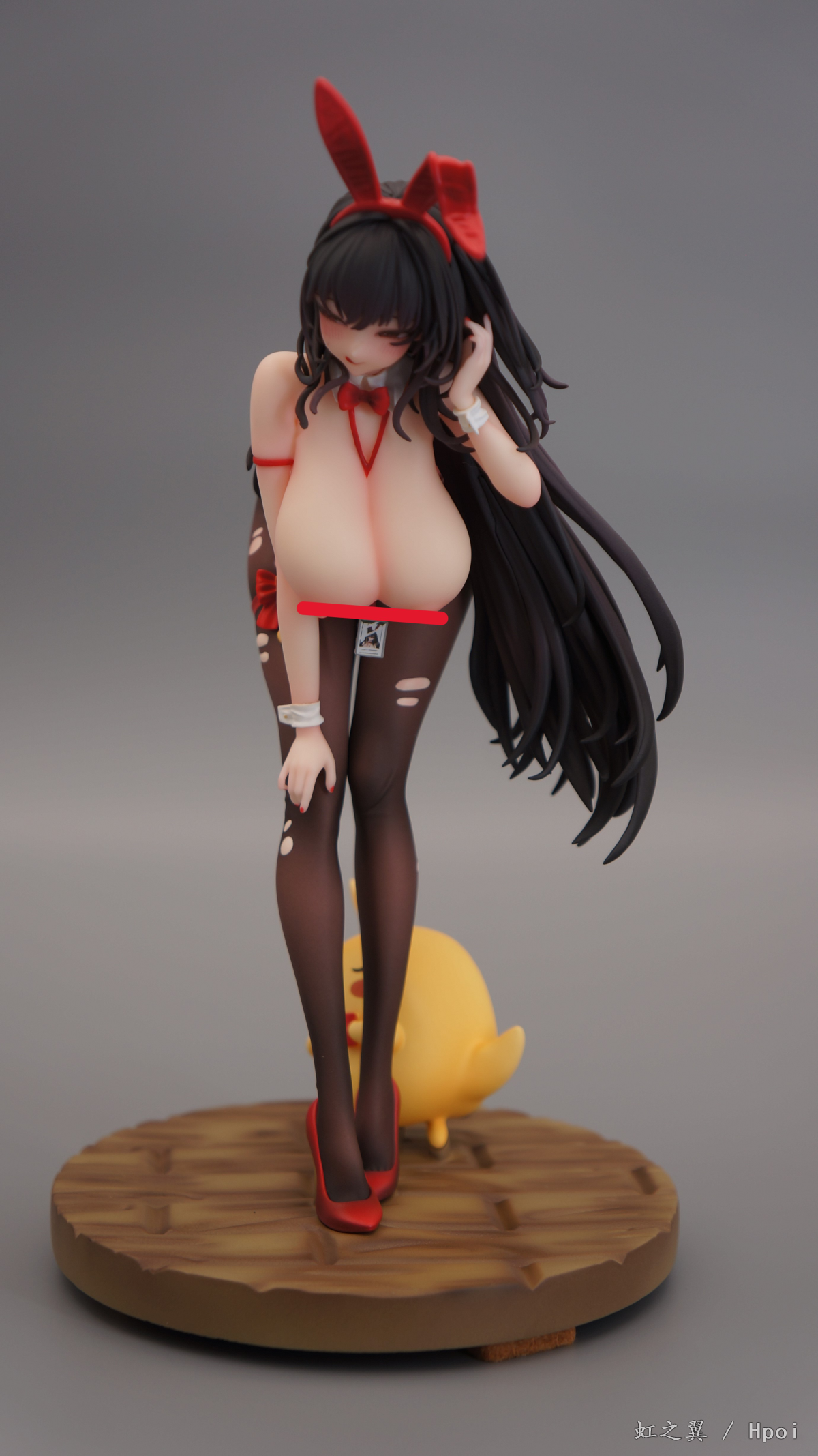 衣服和部分配件做了渐变和高光阴影效果,但是几乎完全没有进行光泽度区分处理,衣服、兔耳、高跟鞋等地方竟然都没做亮光~参考的原画里是有衣服的PU反光和头箍腿环的绸缎光泽的。裤袜上的开洞是遮盖后涂肤色,细看有黑色和肤色的重叠,而且遮盖超过一半没对准,涂装的肤色和建模留的腿肉凸出的位置有很大的偏移,没法细看。
