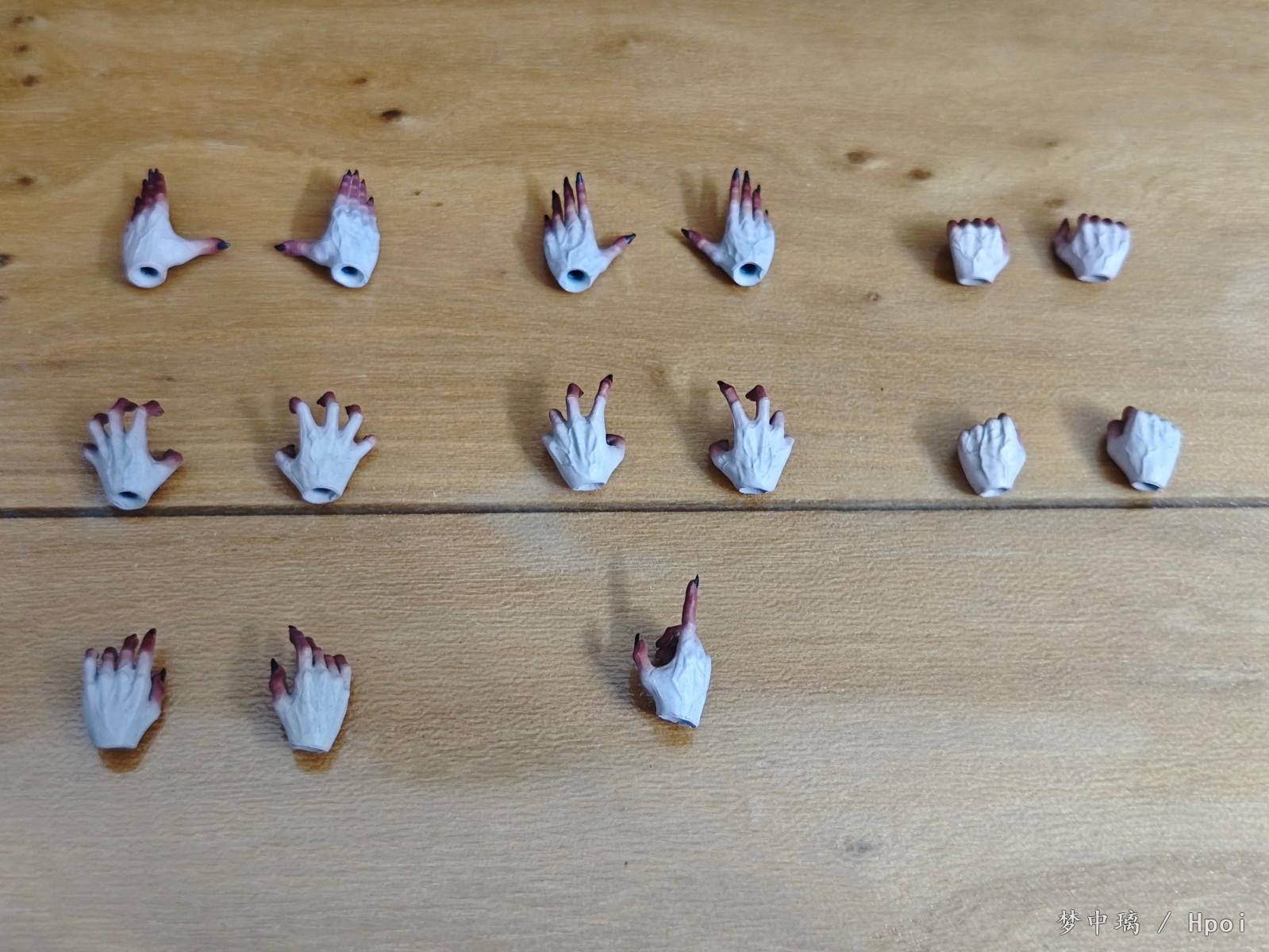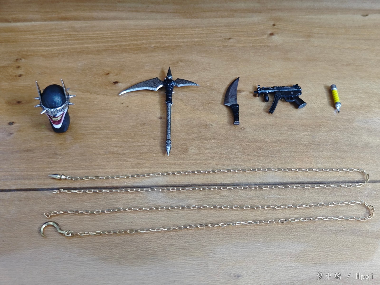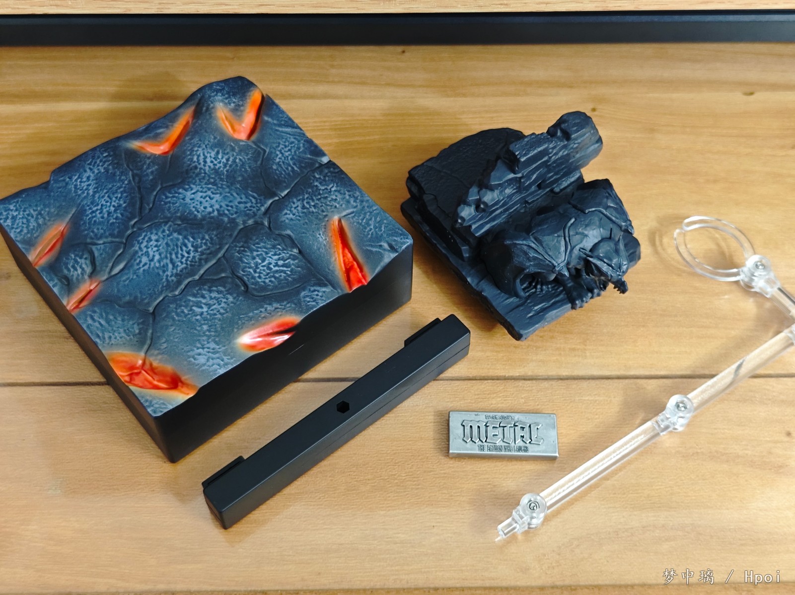 把玩过程中发现右手肘关节特别松,左大腿关节很容易脱出。替换头、头冠、手的过程都很轻松,可动也还可以。 替换手和配件的细节很不错,不过地台感觉很拉,质感很一般。