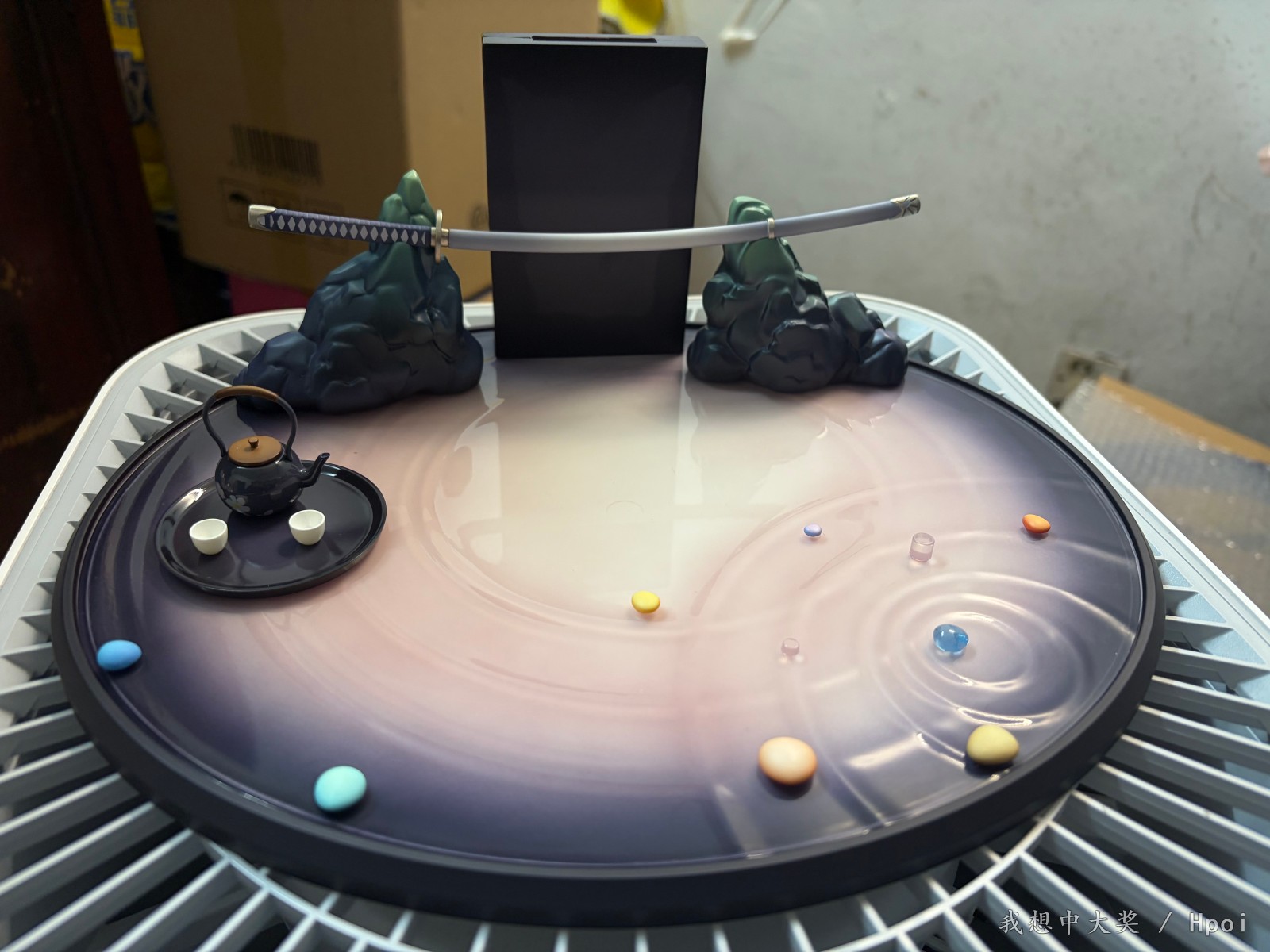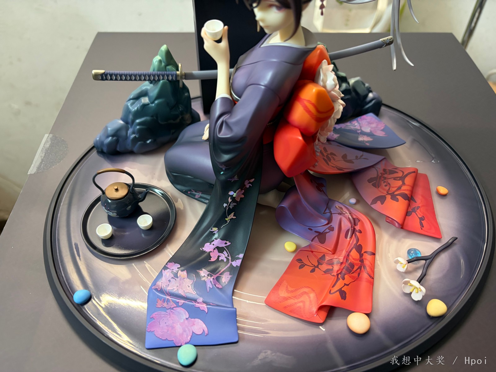 地台,假山,刀和茶具都是固定的,不可拆,我一开始还以为刀是可动的。
