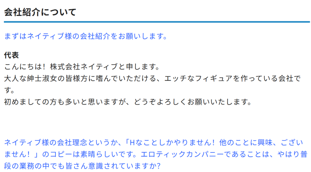 (五)关于未来展望 ——Native 未来想要挑战的事情是什么? 代表: 想增加自社产品的数量!为了保质,产品数难免会减少,我希望能更好地平衡质量与时间。 销售方面的目标是让更多国家的人购买。抛开政策禁止的地区不谈,世界上还有很多地方不知道 Native,我想把我们的手办送到全球各地。 ——作为专注 R18 的公司,未来会坚持的主题是什么? 代表: 工口、美感、感动。 制作时,我时刻提醒自己不要漏掉这三点中的任何一点。 至于“什么是工口”的追求会一直持续下去。我们会通过商品接收客户的“答案校对”,并以此为动力继续钻研。 ——最后,请给粉丝和还没购买过的人们说几句。 代表: 感谢大家阅读到最后! 手办在某种意义上是“受肉”。 心爱的角色降临到三次元世界,能让你亲手触摸到她的实体、她的全部——这种体验只有手办能做到。 如果这篇文章能让您对原画、对手办、对Native产生一点点兴趣,我将不胜荣幸。 18 岁以上的好孩子,这里刊载了包括Native在内的各大厂商的手办,有空请务必来看看! 您觉得这次在Ci-en上对手办厂商的珍贵采访怎么样?感谢所有配合的人员! (采访者:スミダ)