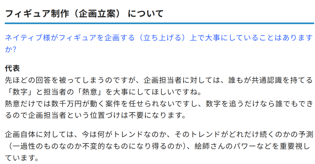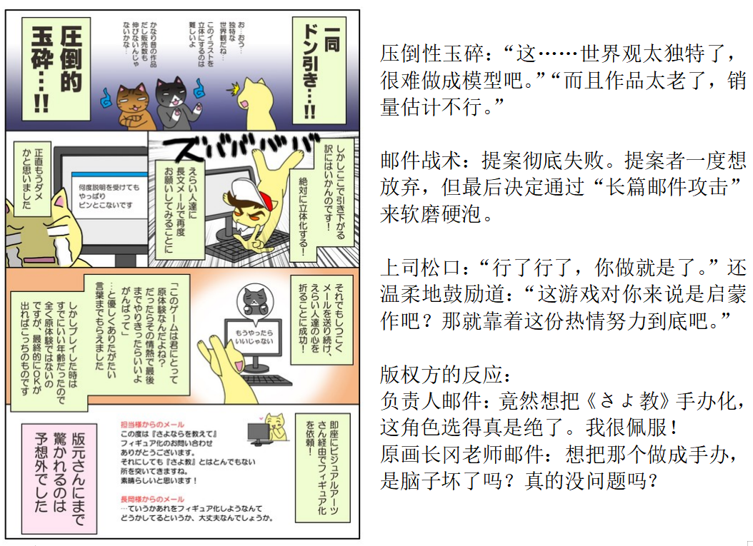 (二)关于手办制作与销售 ——手办制作是从企划立案开始的吗?请介绍一下制作流程。 代表: Native 的手办制作始于“企划”。大公司可能有专门的企划部,但Native走的是少数精锐路线,没有专门部门。通常是兼顾其他业务的同时进行企划。 制作主要有两种模式:一是“请插画师绘制原画”,二是“将漫画/游戏中的角色手办化”。选择哪种取决于流行趋势或企划人的喜好,但通常都会选择“当前热门的作家或作品”。 ——立项后最难的应该是上班族最看重的“审批”吧?获得批准的过程很辛苦吗?有没有哪部作品是您靠着“虽然很冒险但请务必让我做”这种热情硬闯过去的? 代表: 我还是底层职员时,曾把那段极其艰辛的经历画成了漫画,请务必去看一下(笑)! 为了说服上司,资料和数据固然重要,但我认为企划人的热情最终是必不可少的。现在的年轻人很多都太客气了,我希望大家能更任性一点,更坚持自己的主张!