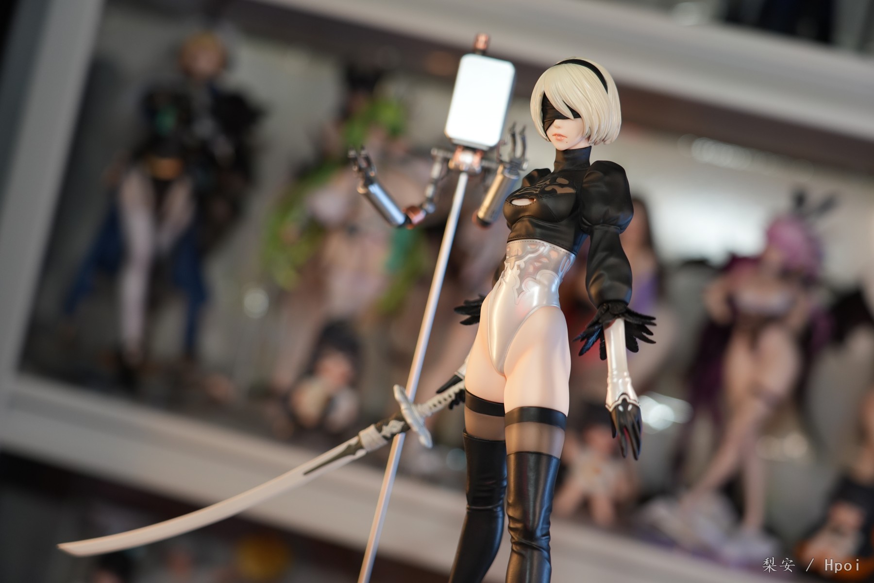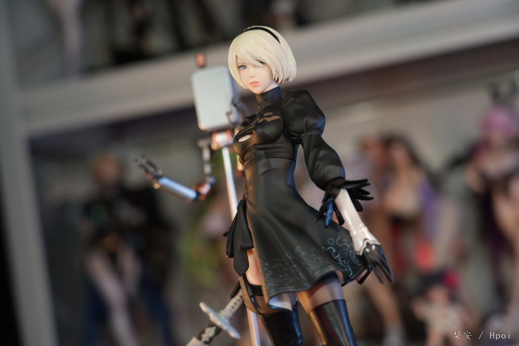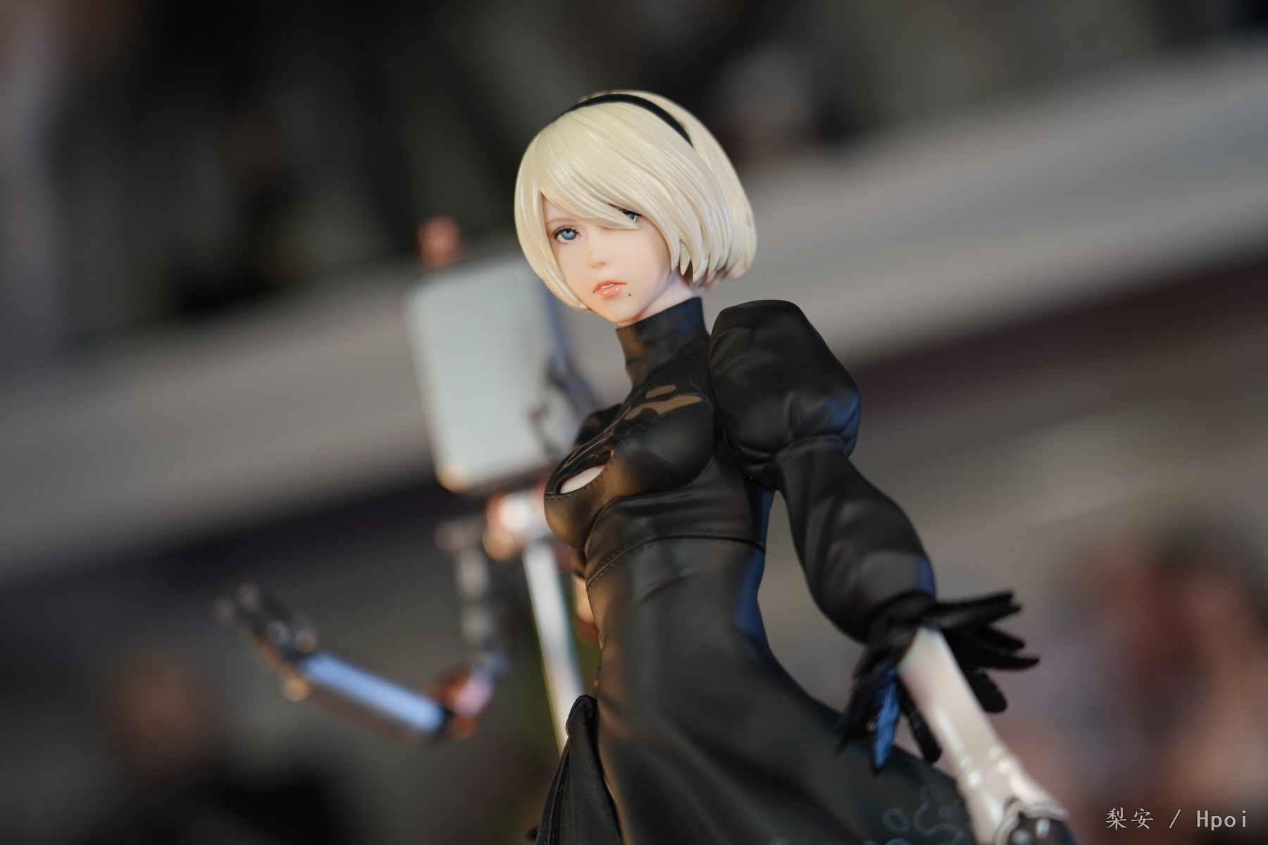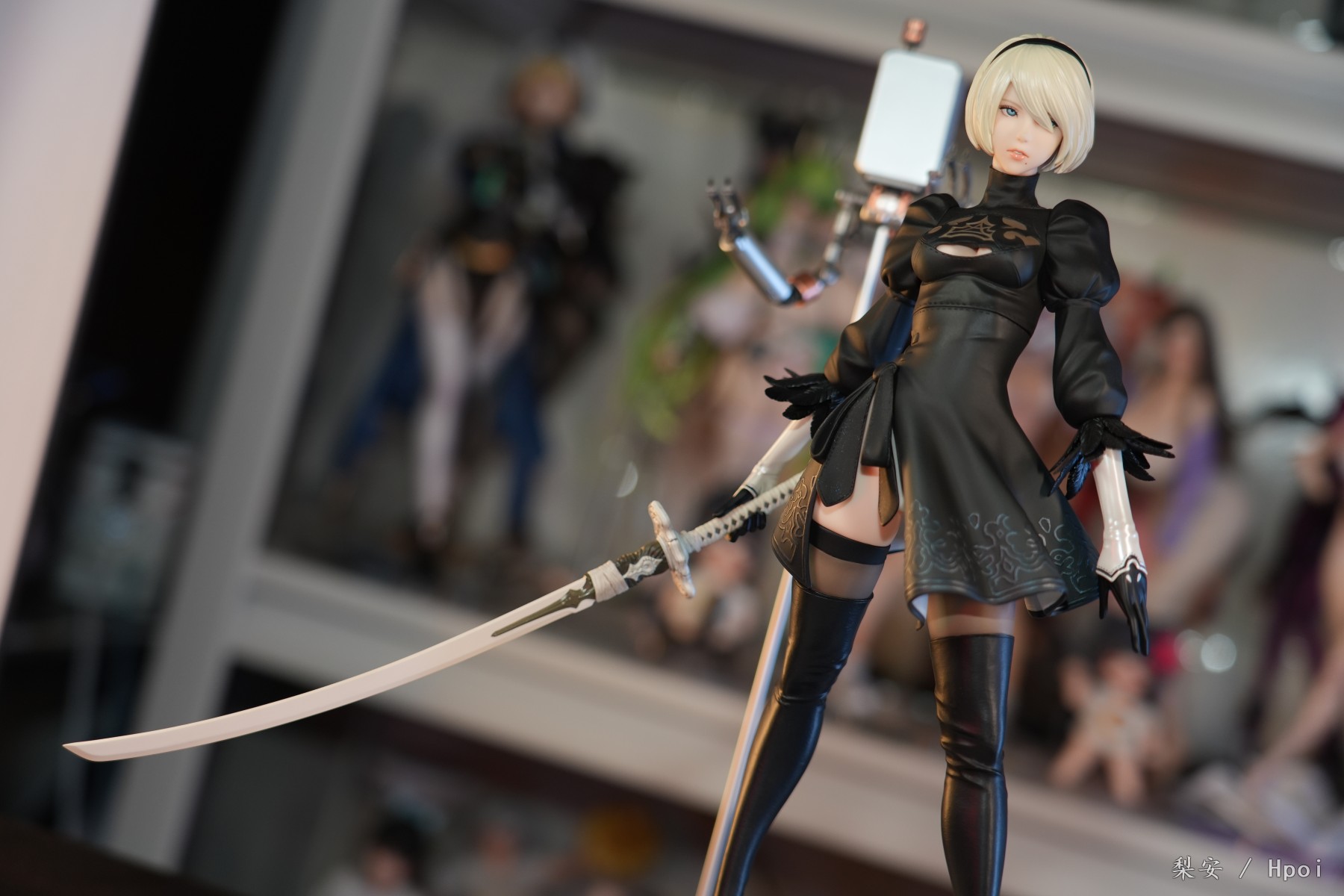 这次拍摄的2b真是太好看了,整体比例很大,腿很长,尤其喜欢这个高跟长筒靴,替换身的屁股也做得挺好的,小机器人手部可以动,有点做旧涂装,尤其喜欢眼罩头雕,看着挺好挺还原的,另外一个不戴眼罩的就有点一般了