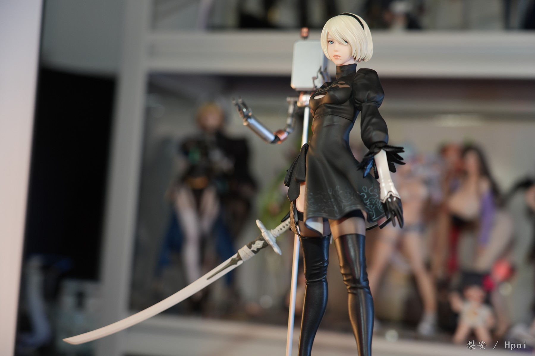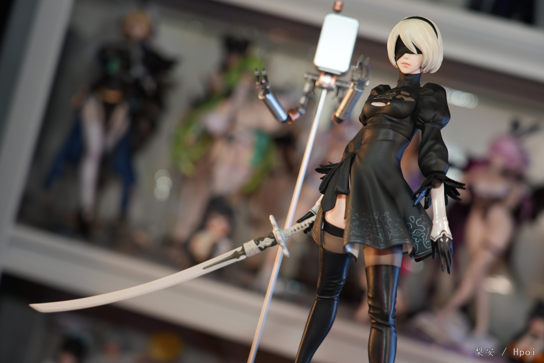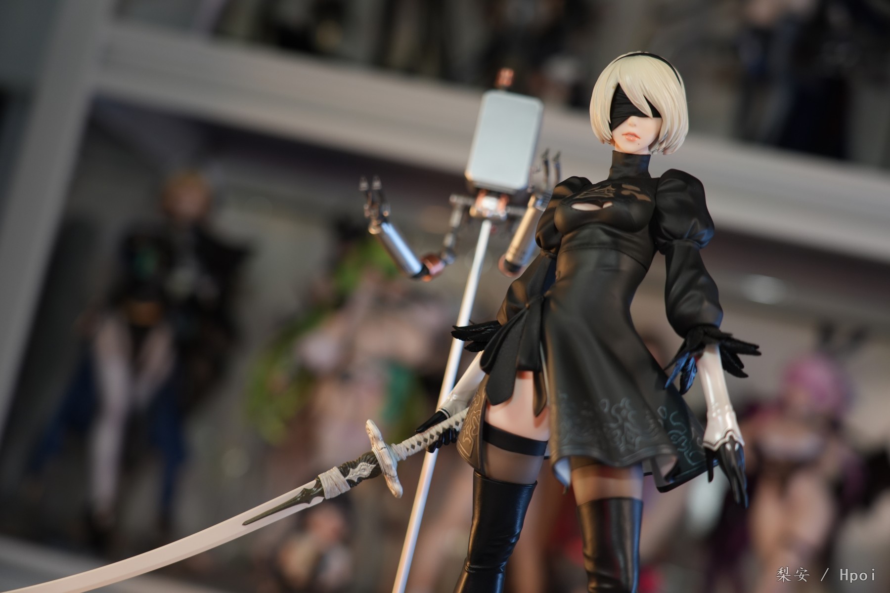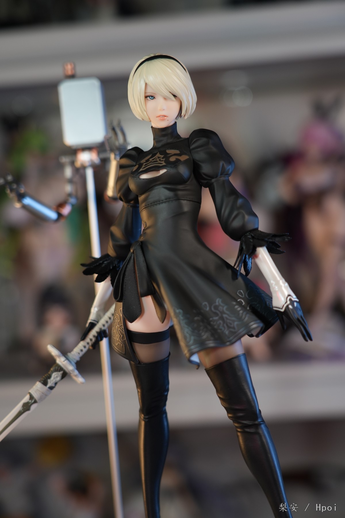 这次拍摄的2b真是太好看了,整体比例很大,腿很长,尤其喜欢这个高跟长筒靴,替换身的屁股也做得挺好的,小机器人手部可以动,有点做旧涂装,尤其喜欢眼罩头雕,看着挺好挺还原的,另外一个不戴眼罩的就有点一般了