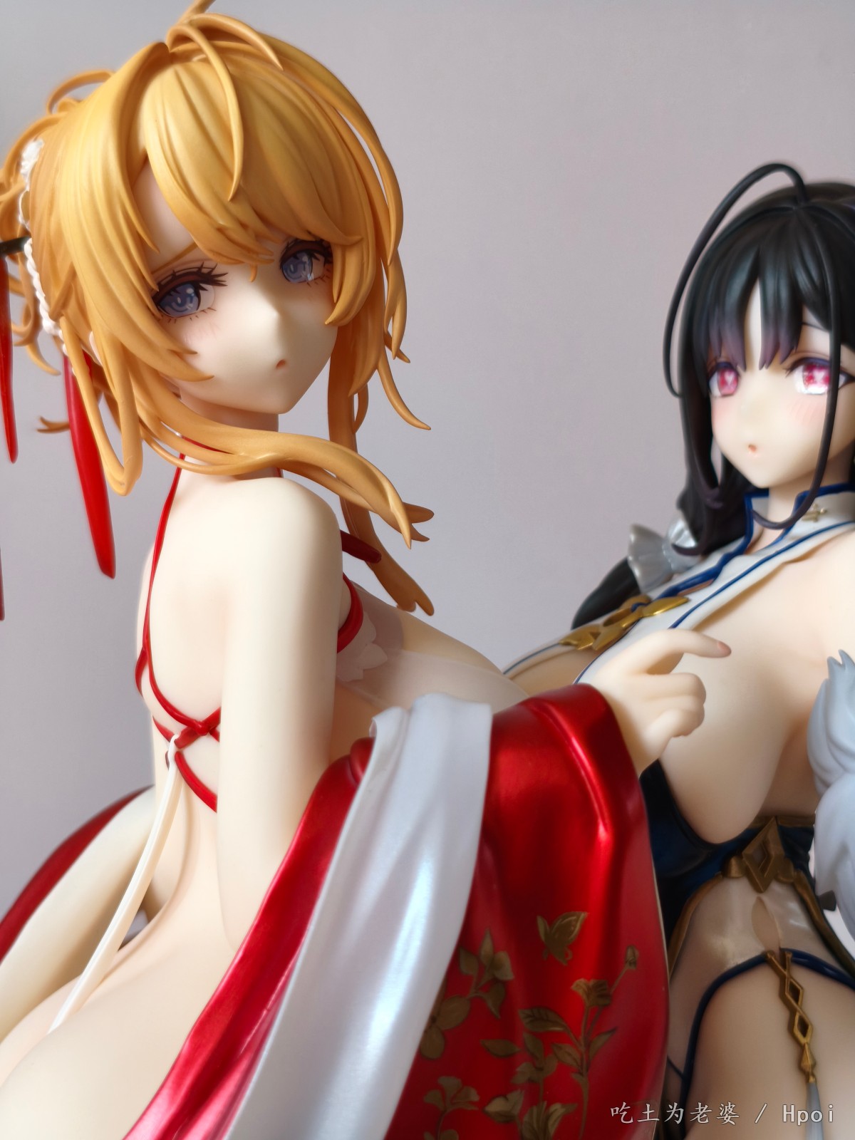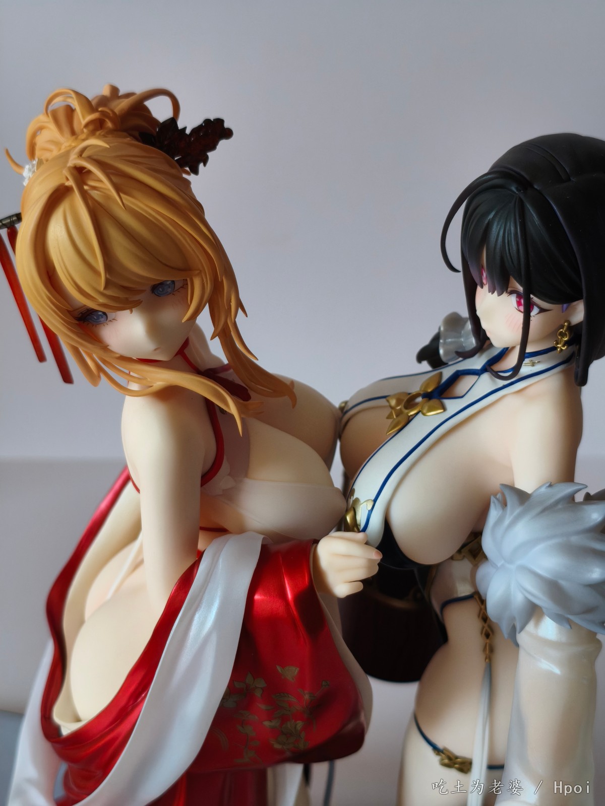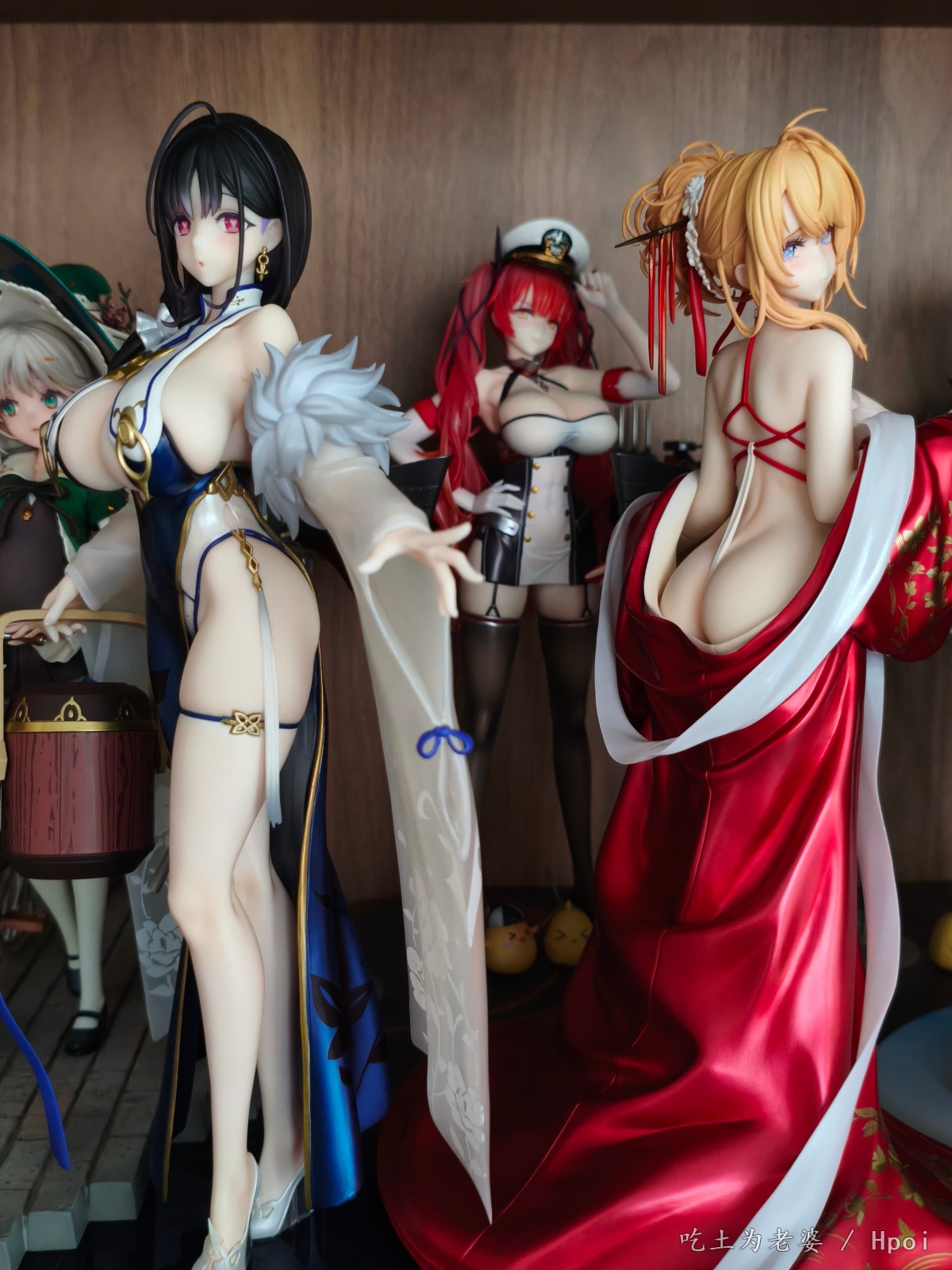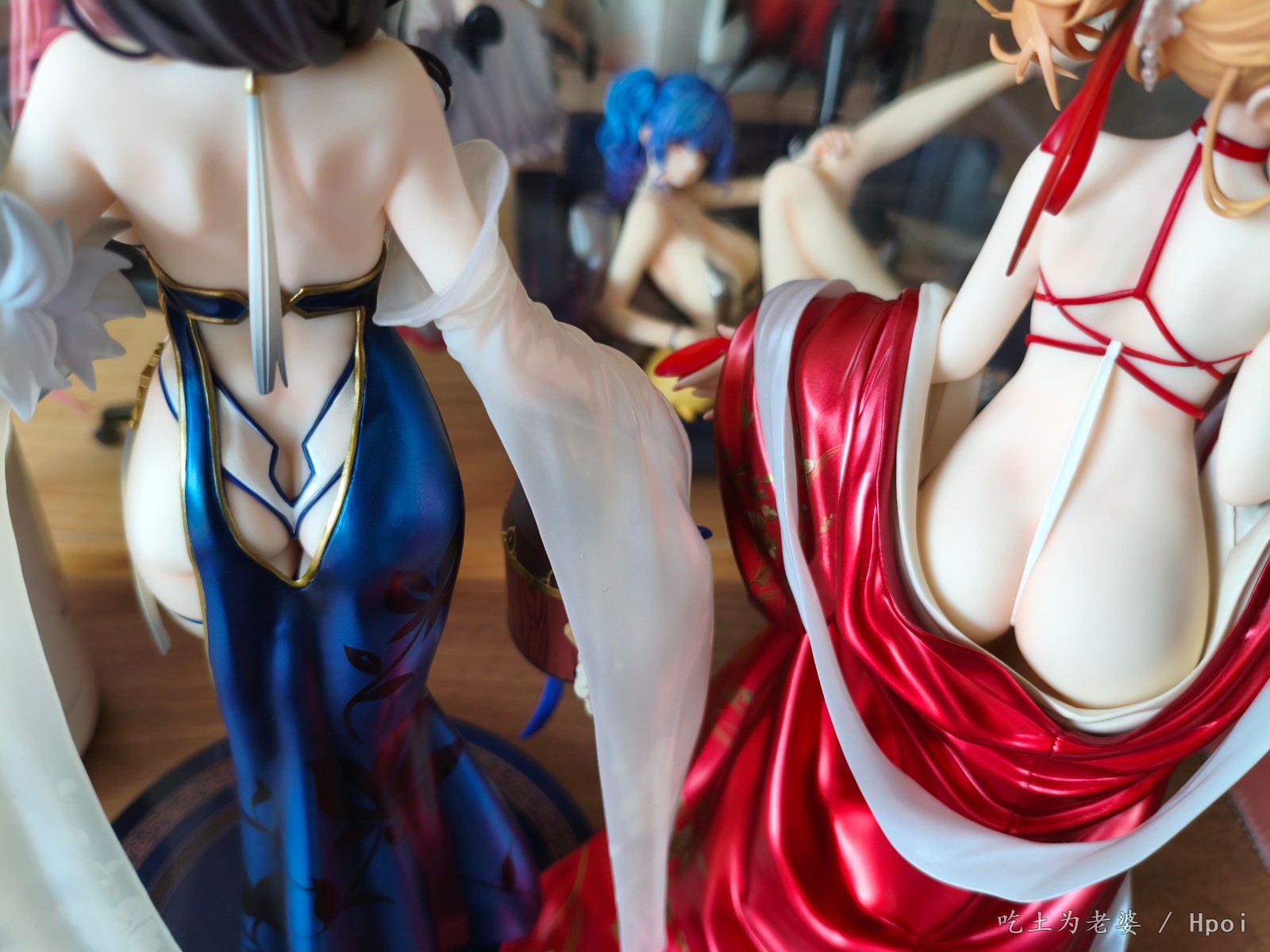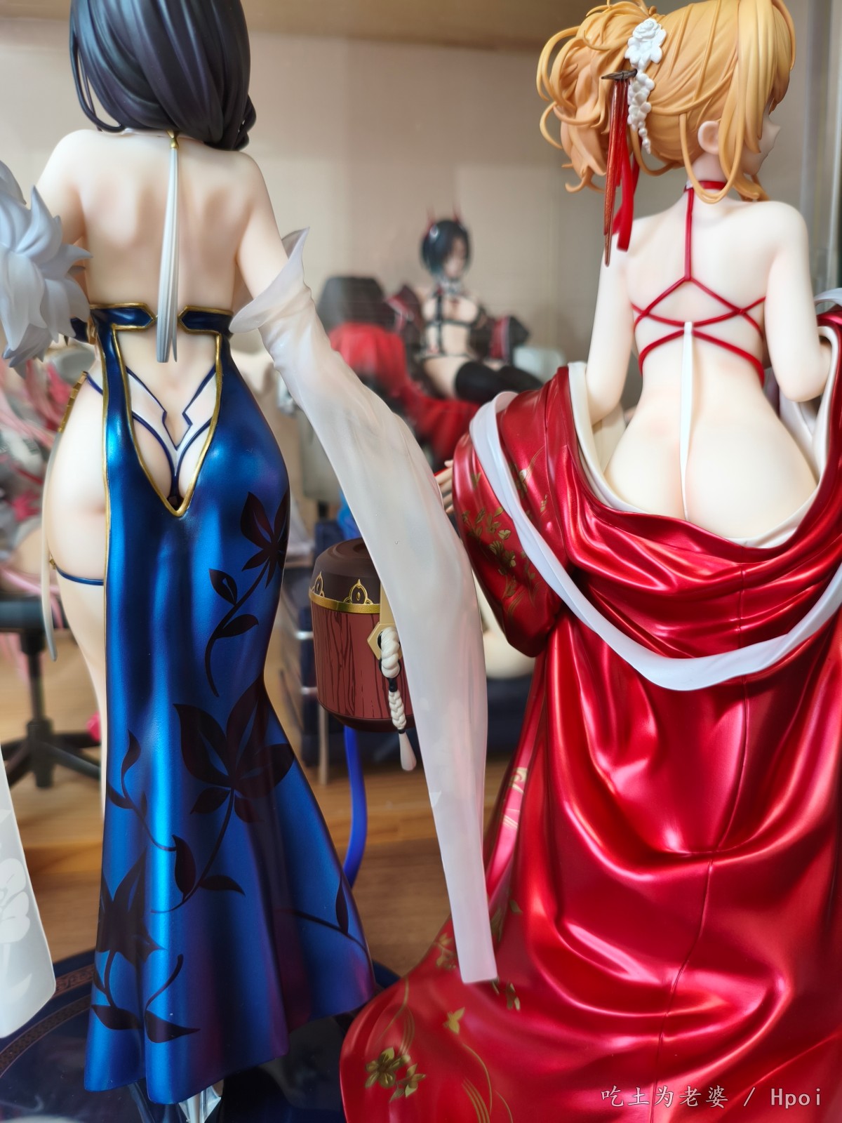 忙到周日下午才开箱,粗略看了一遍,小奖好几处,大奖没有,草草拍几张,入柜完事。 穿外套前用吹风机吹了一分钟,挺顺利的,倒是替换头很紧,安上去后不太容易拔出来。 比较大的槽点就一个,外套桩位。 外套逆天桩位,比当年凯旋有过之而无不及,正打算继续使用吹风机,转念一想,穿外套的话,不用底座也没问题啊,足够支撑人物了。索性用镊子把外套里几个桩都拔掉,瞬间神清气爽。 奉劝各位,不要把宝贵的时间浪费在逆天桩位上。 至于有人说外套上半身有大缝这个通病,我这只刚安装上去时确实有,不过用力按紧后就没了,未必是通病,可能还是品控? 小槽点就是那个白色头饰,正常观赏距离尚可,近看有点糙,比旗袍吾妻的要差一些。 入柜时,脑子一转,想到之前买的定安,都是背后别有风光,干脆放一起,别说,挺般配!