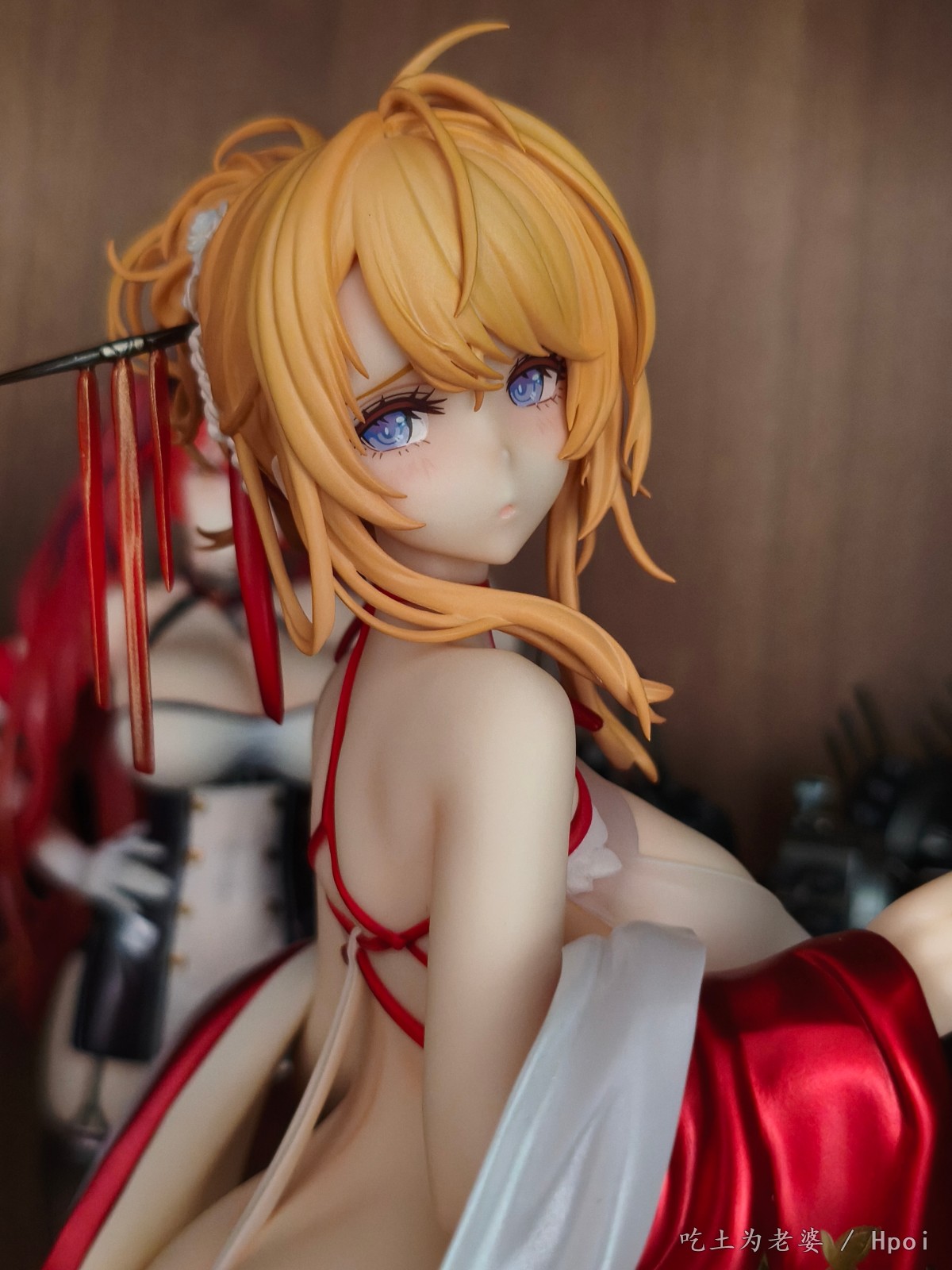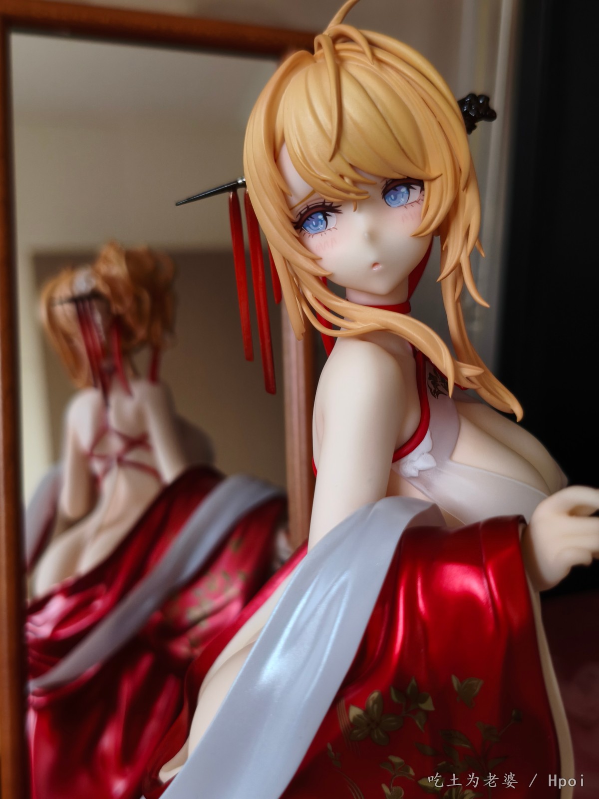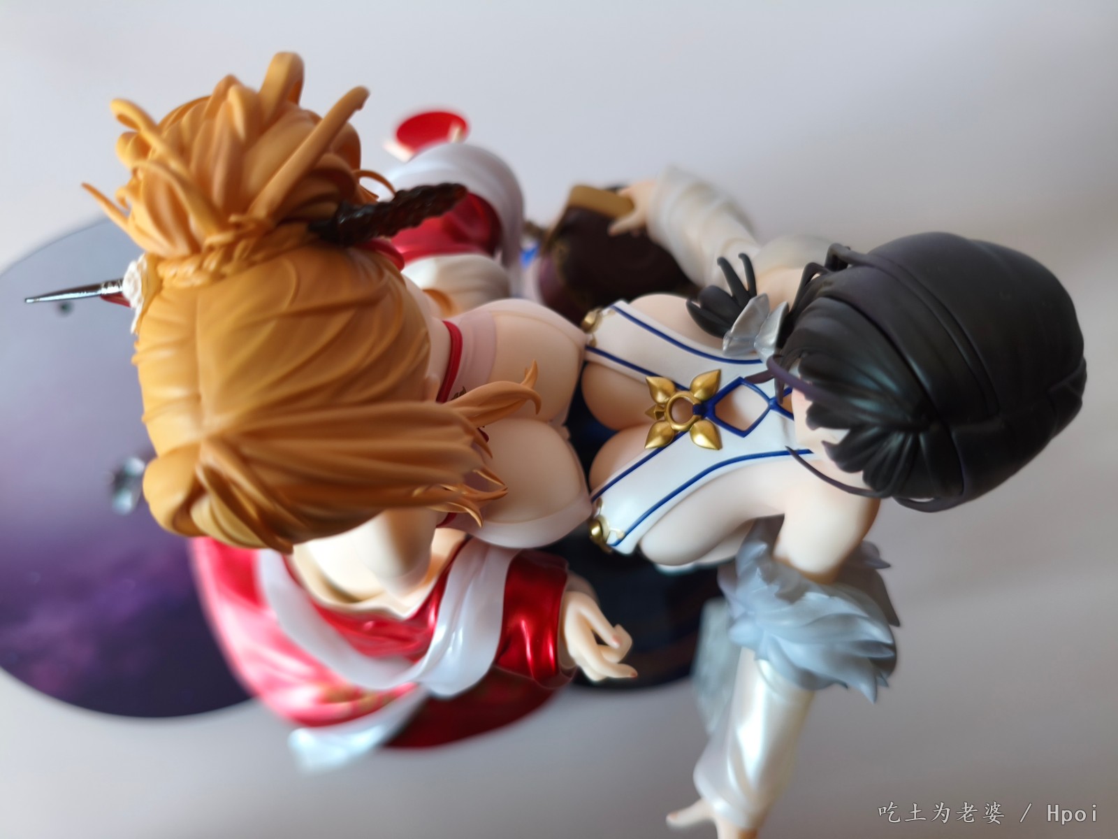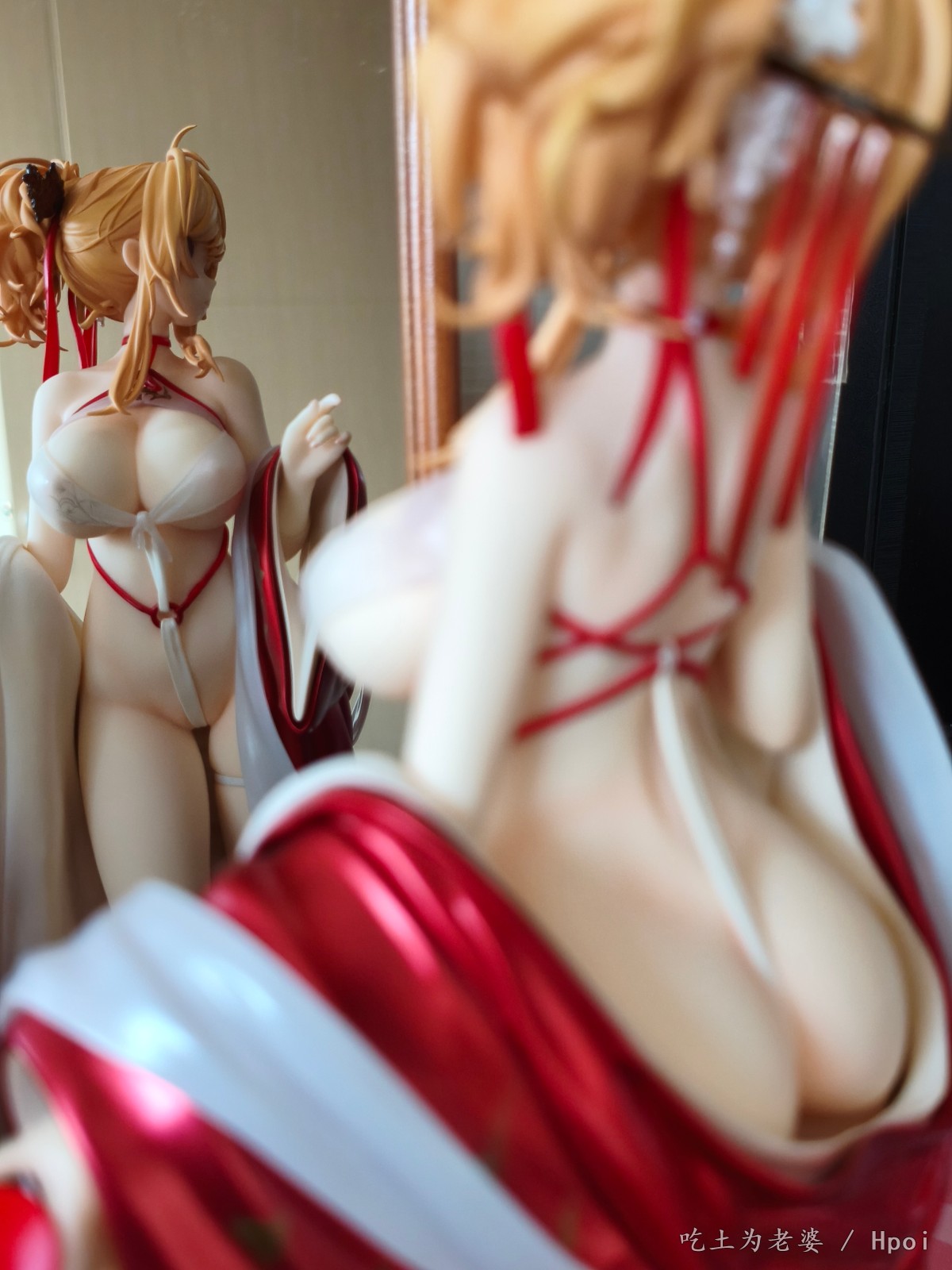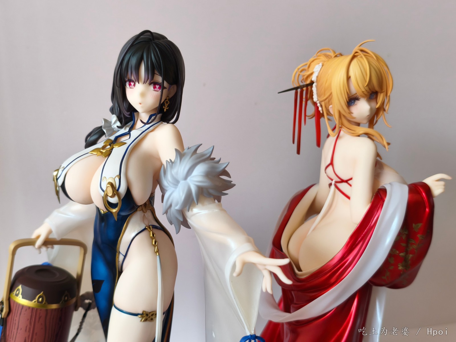 忙到周日下午才开箱,粗略看了一遍,小奖好几处,大奖没有,草草拍几张,入柜完事。 穿外套前用吹风机吹了一分钟,挺顺利的,倒是替换头很紧,安上去后不太容易拔出来。 比较大的槽点就一个,外套桩位。 外套逆天桩位,比当年凯旋有过之而无不及,正打算继续使用吹风机,转念一想,穿外套的话,不用底座也没问题啊,足够支撑人物了。索性用镊子把外套里几个桩都拔掉,瞬间神清气爽。 奉劝各位,不要把宝贵的时间浪费在逆天桩位上。 至于有人说外套上半身有大缝这个通病,我这只刚安装上去时确实有,不过用力按紧后就没了,未必是通病,可能还是品控? 小槽点就是那个白色头饰,正常观赏距离尚可,近看有点糙,比旗袍吾妻的要差一些。 入柜时,脑子一转,想到之前买的定安,都是背后别有风光,干脆放一起,别说,挺般配!