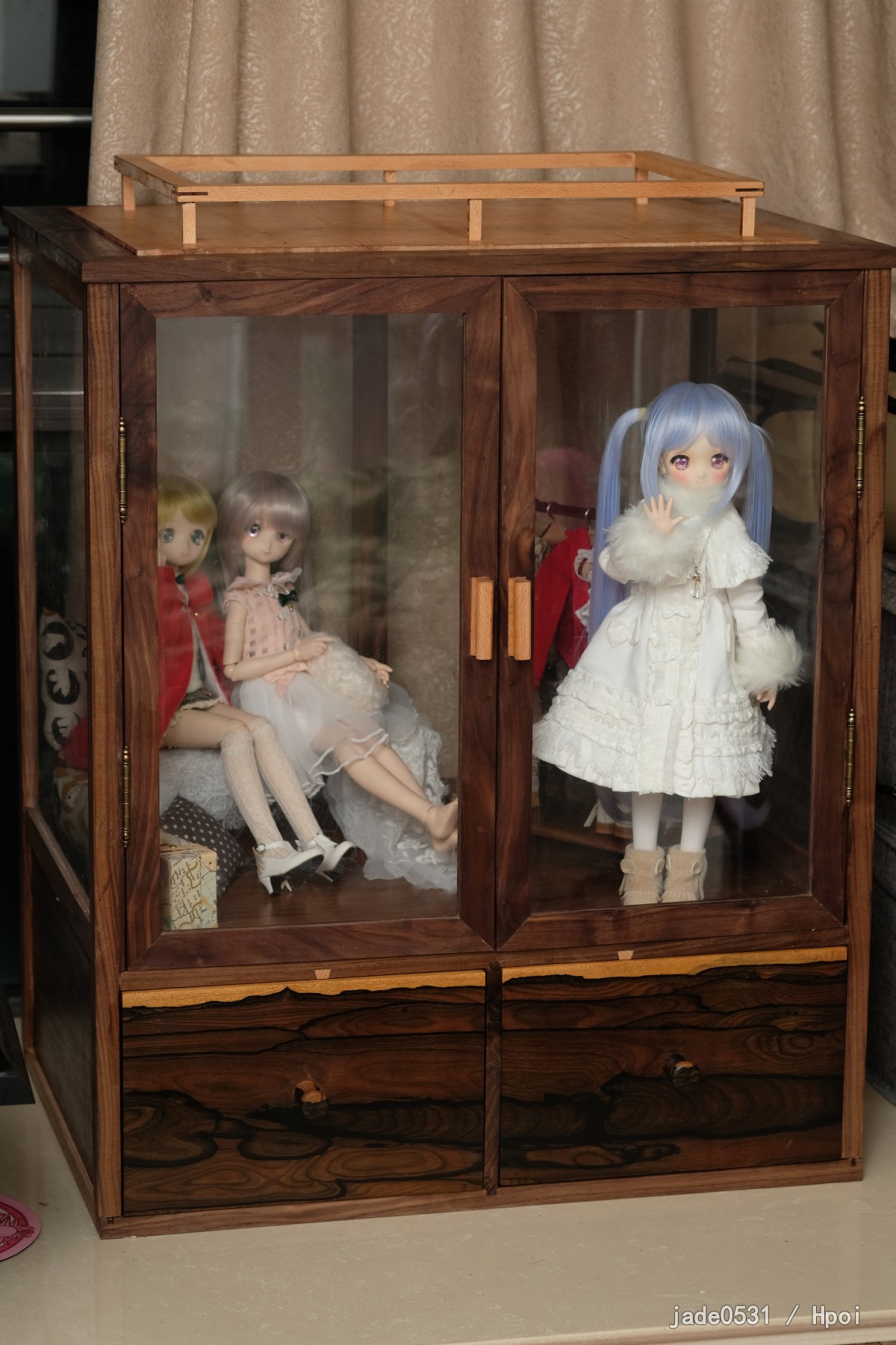 全部手工制作,过程太复杂没有记录。整体为黑胡桃木,抽屉为黑柿木,手工燕尾榫,上盖可打开