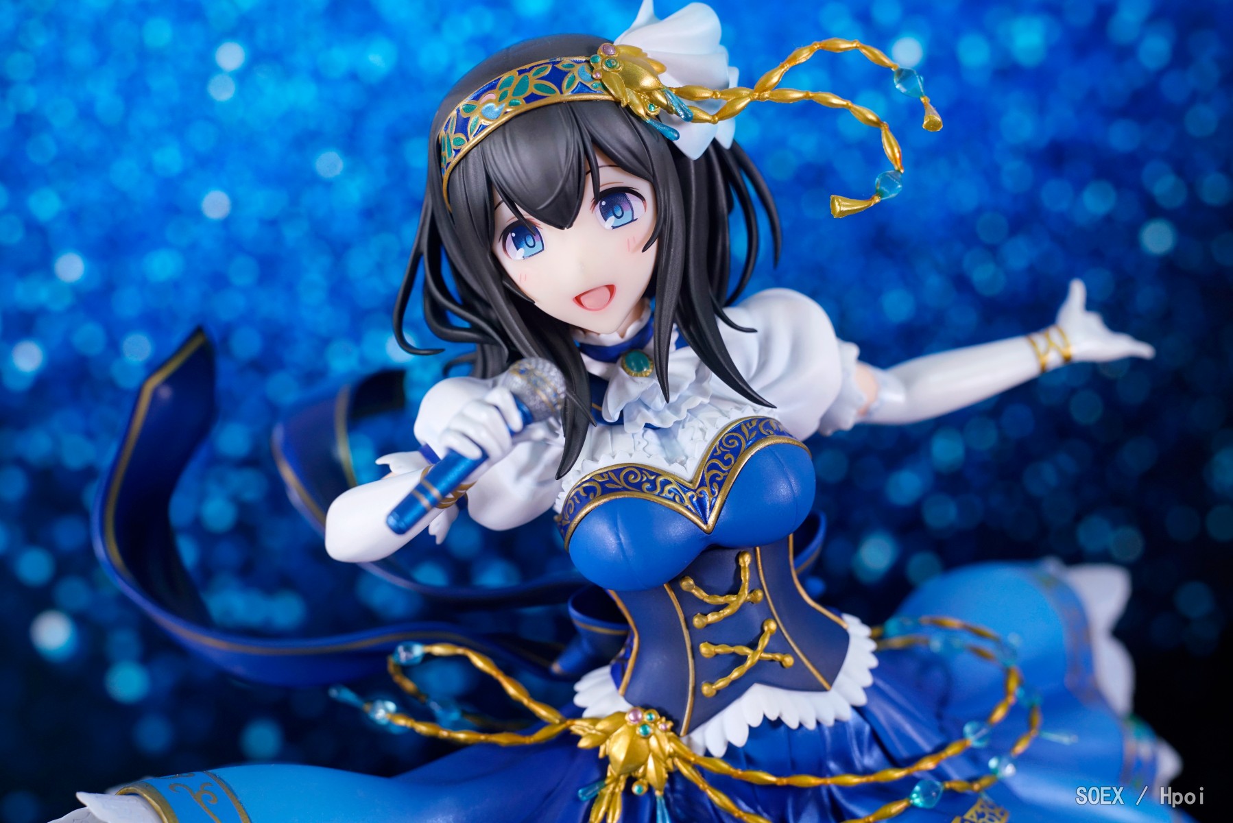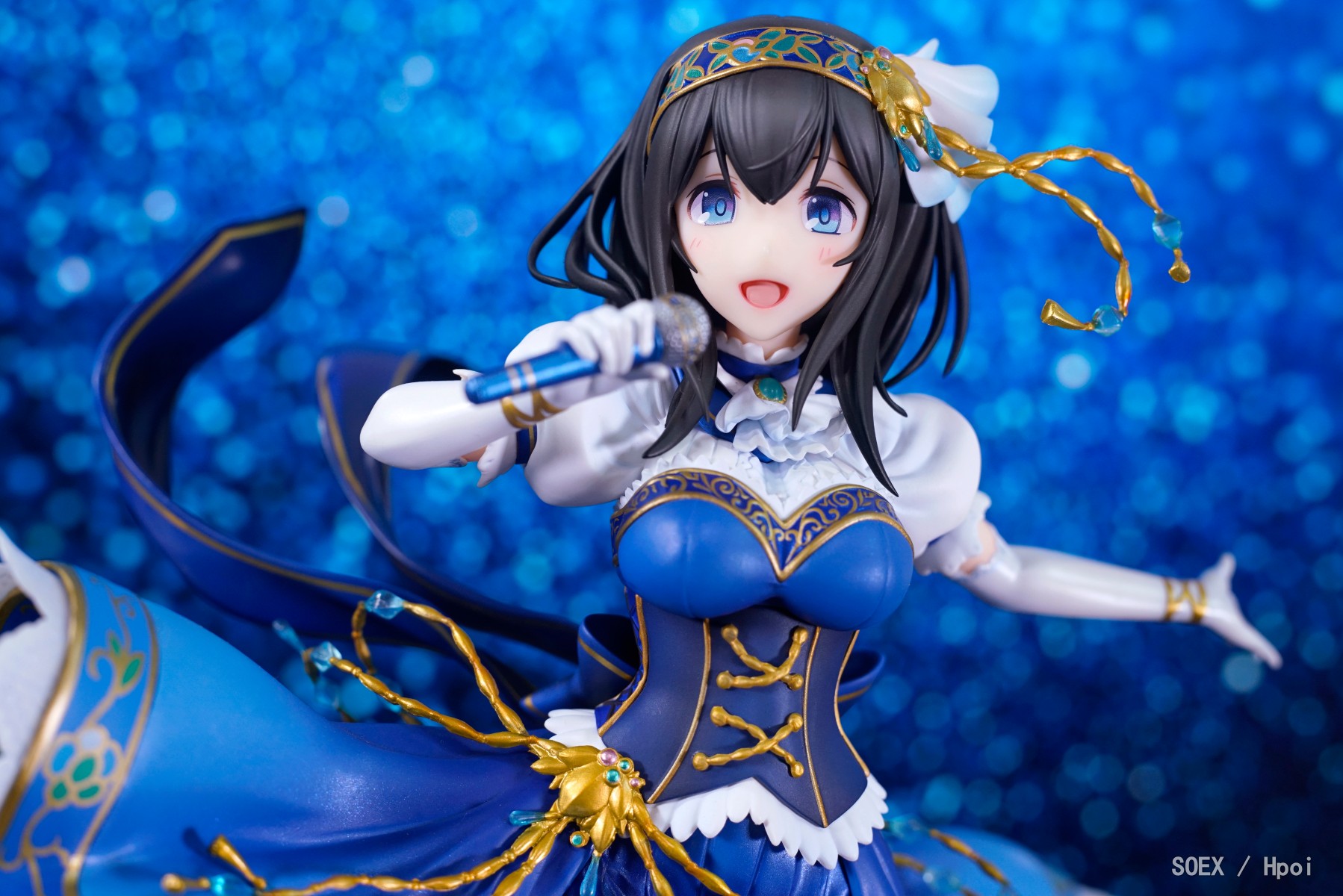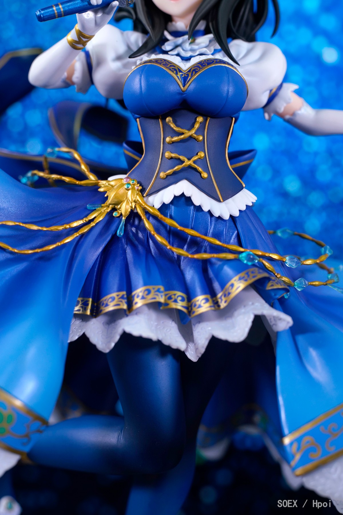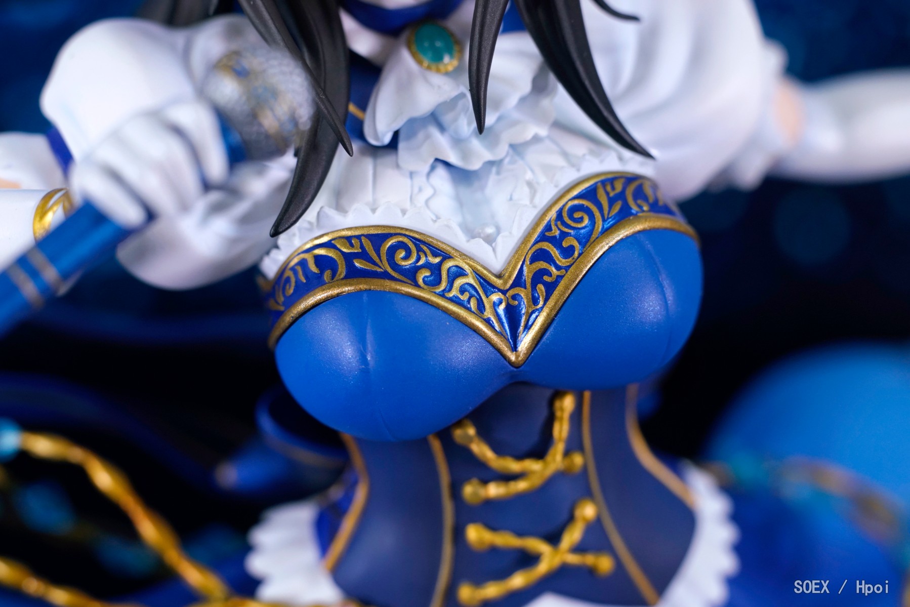 ·这款文香可谓说是典雅中又不失华丽,对原画的服饰还原度可谓十分优秀,不同位置的材质运用挺是恰当,渐变色处理也相当舒服,但若拿出此前的蔷薇暗姬版兰子作对比,这款文香的细部处理就显得比较一般了。因采取分件涂装而导致缝隙明显的印花裙边,细节略模糊还带有些许飞边的金饰,手上的无线电容麦不能单独取下,以及微妙的面相都是这款文香的主要问题。尤其是面相,自当初上色官图放出那会就被不少人诟病,实物到手之后虽然感觉没那么差,但你说它还原也不是,因为和原画对比的话确实有明显的差异;说不还原也不是,因为通过某些角度欣赏也确实是有文香接受特训后的感觉,所以基本上就是介乎在两者之间的尴尬位置(一些对此不满的P主因而称这款文香为“Blind Memories”,即“瞎了狗眼的记忆”)。后来我和住楼上的基友研究一番之后发现其实主要还是布光问题,如果像官图那样打光太过均匀会导致面部失去立体感,就如同是没了鼻子和下巴的脸一样,所以这款文香的面相在观赏上对于光线有一点要求,而观赏角度选得好的话其实加分不少;