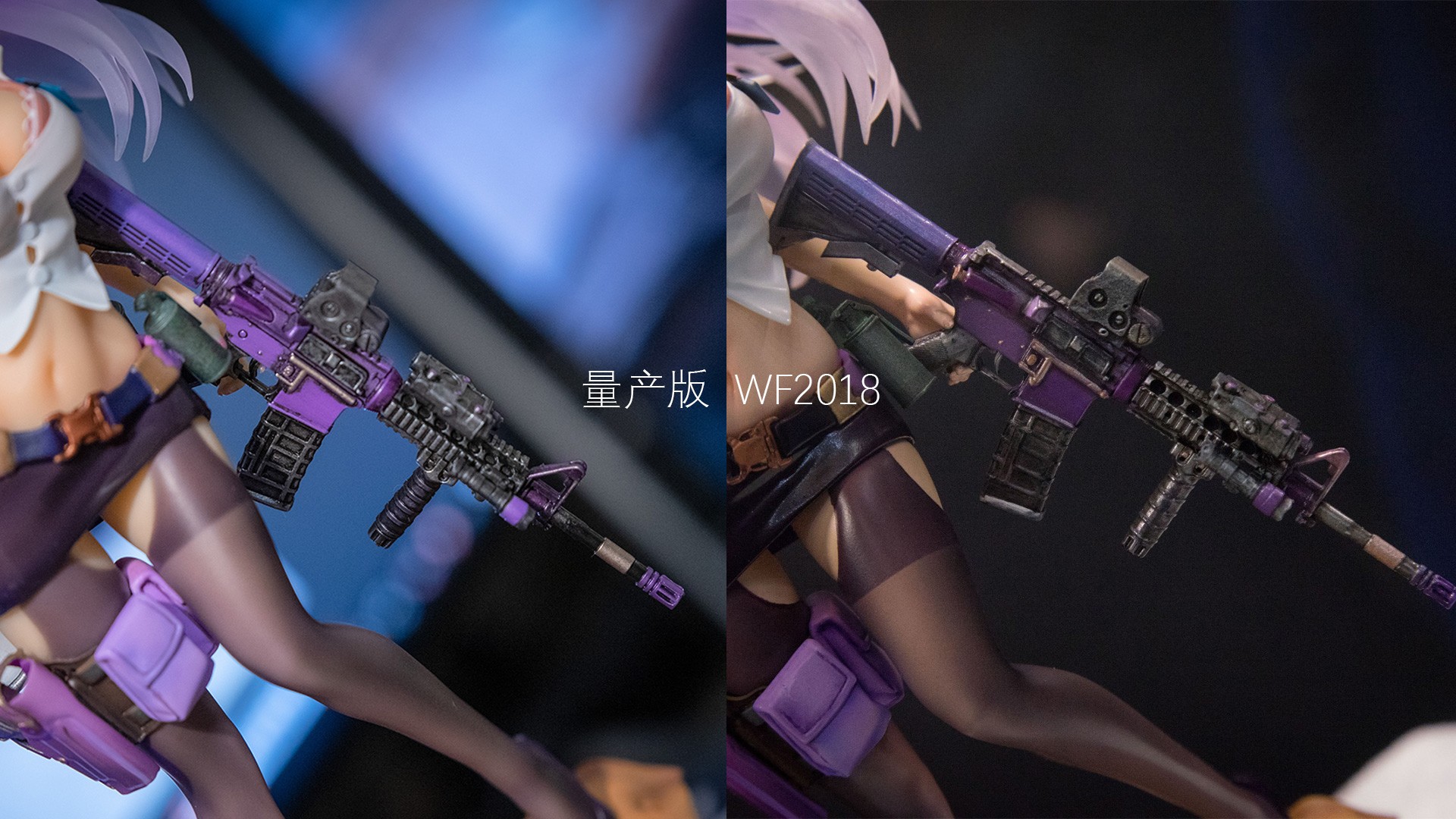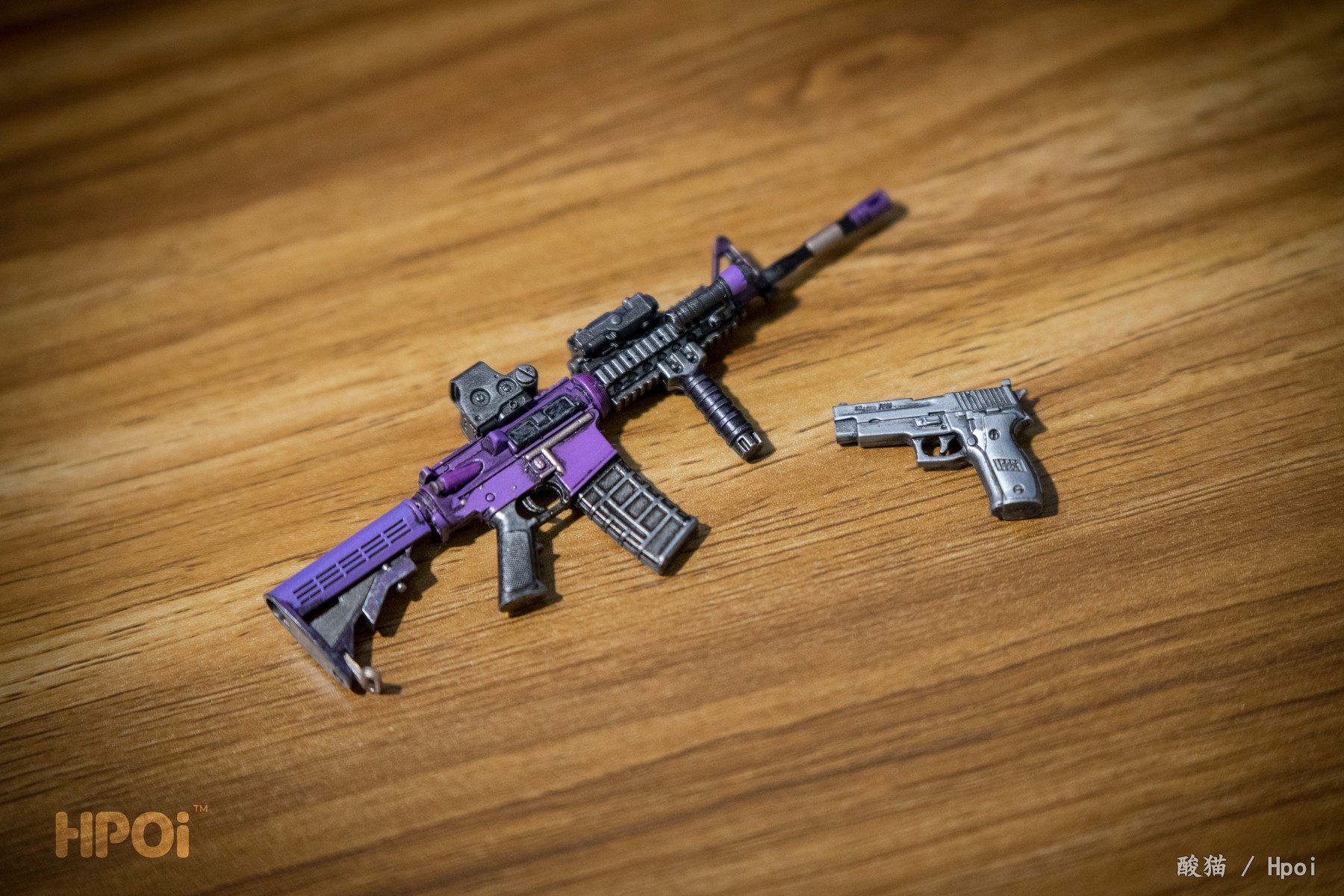 整体拿手里还比较沉,拿出来发现底座是真的重,放桌上还是挺稳的。damtoys毕竟兵人本业,M4和P226发挥稳定,不过康起来M4的配色和当时WF展上的原型有点差别(明显感觉上导轨变成紫的了)。