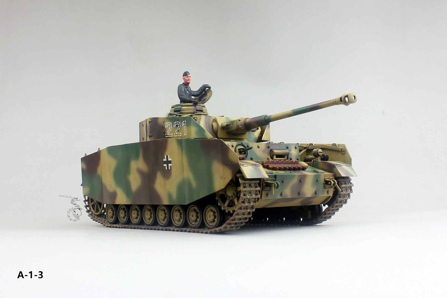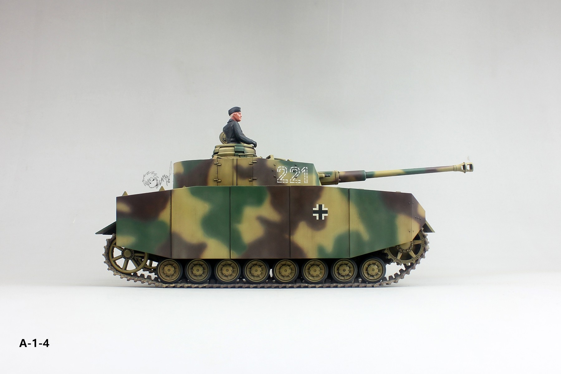 图A-1-1→A-1-19:德国国防军Pz.kpfw.IV中型坦克H型(早期型),水岛努娱乐向动画《少女与战车》主角“军神”西住美穗的完全同款座驾,虽然是一款性能中庸的坦克,但在军神车组神一般的操作之下,在比赛中屡屡超越战车性能极限,拳打百夫长,脚踢P40,视45度坡于无物,与老鼠潘兴谈笑风生......成了战车道中神一般的存在(笑)。模型选用的是田宫于1996年首次发售的板件(编号:35209,入手难度:无,制作难度:小),履带采用的是AFV战鹰出品的40公分III-IV号通用活动履带(入手难度:极大,制作难度:大),涂装为35209封绘。(这里需要说明一下,虽然水岛努的动画中把西住军神的IV号H称作“D型改”,事实上D型是改不出H型的,能改出H型的至少是G型的中后期型,至于为什么改不出,限于篇幅,这里不一一详述,想知道的可以留言给我)