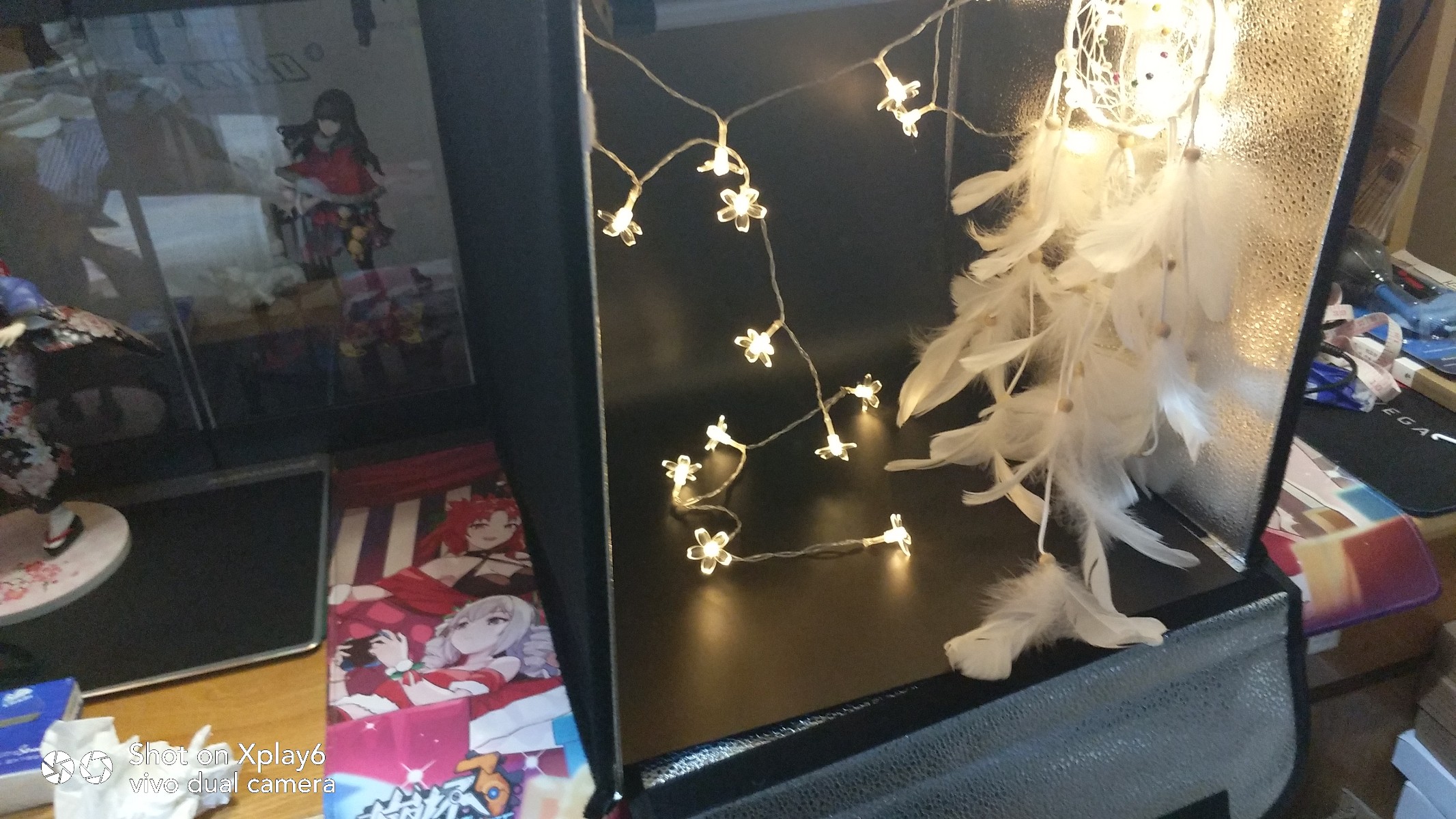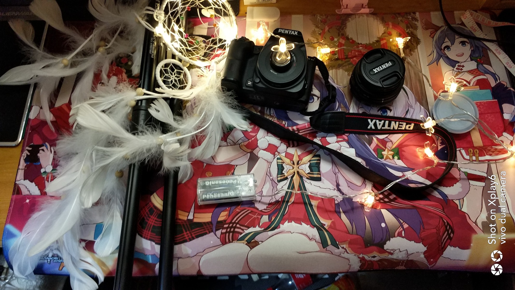 我的好兄弟 PENTAX-KS2,三脚架,还有我的新的好兄弟,PENTAX-DA40xs定焦镜头(后面几张都是用它拍的),以及樱花形状的灯带,还有看起来蛮廉价的羽毛。