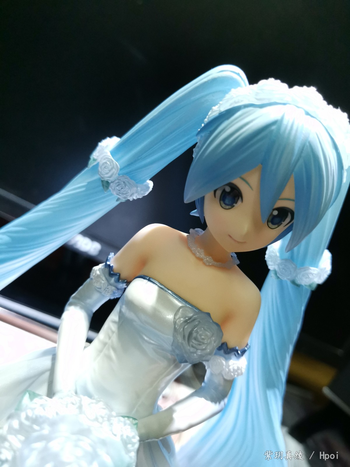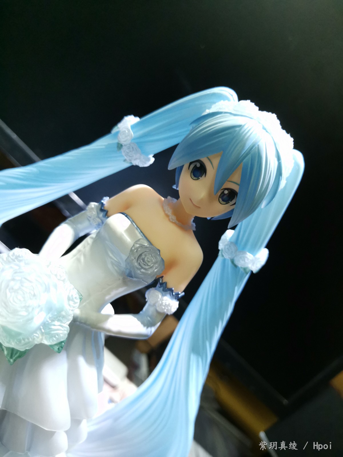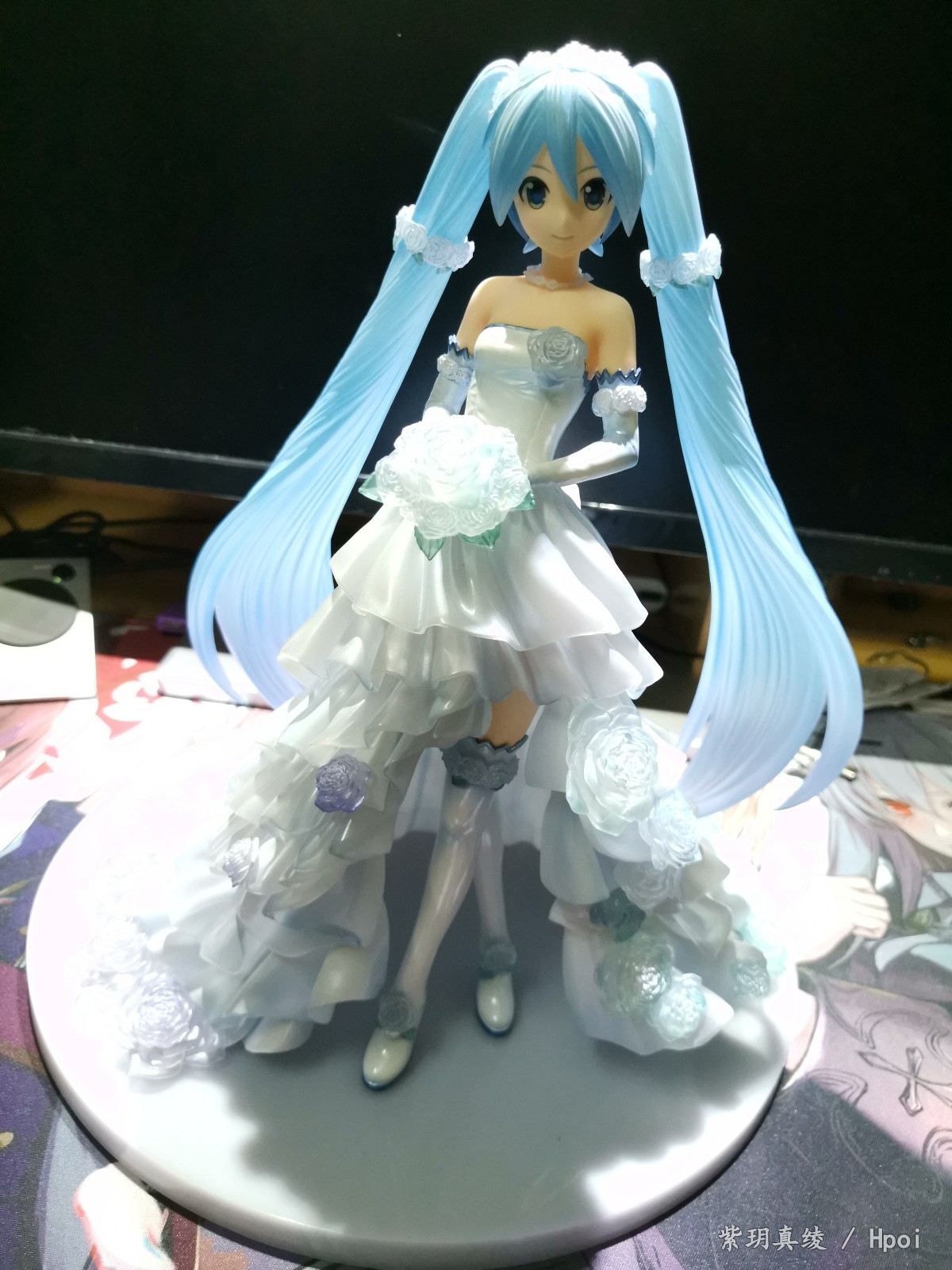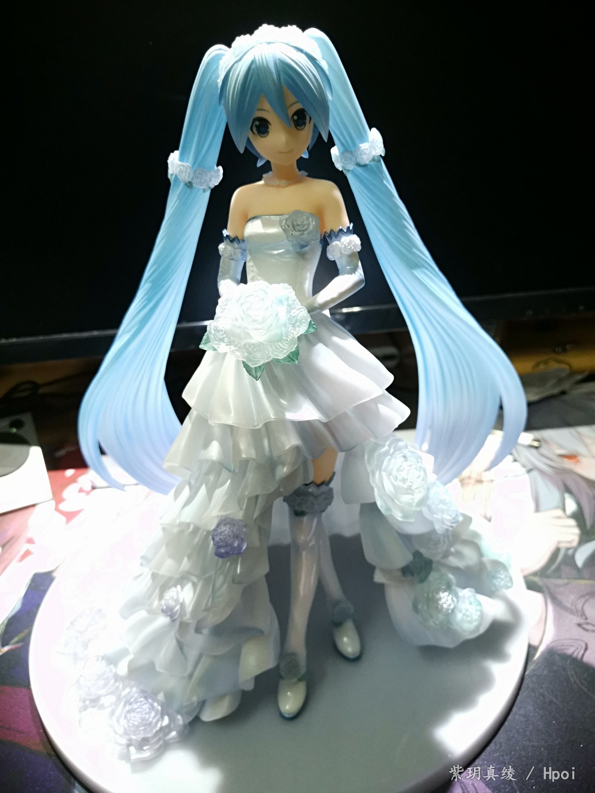 拍的不好别见怪啊,手机渣。LED灯照上去后,自己看婚纱裙是白色带点蓝,但手机拍的照片有点偏黄,婚纱裙和头发带点透明,灯光聚集在公主殿下身上上就会很好看。底座直径25厘米,公主殿下加底座高25厘米,有点占地方,我自己也要整理柜子了。