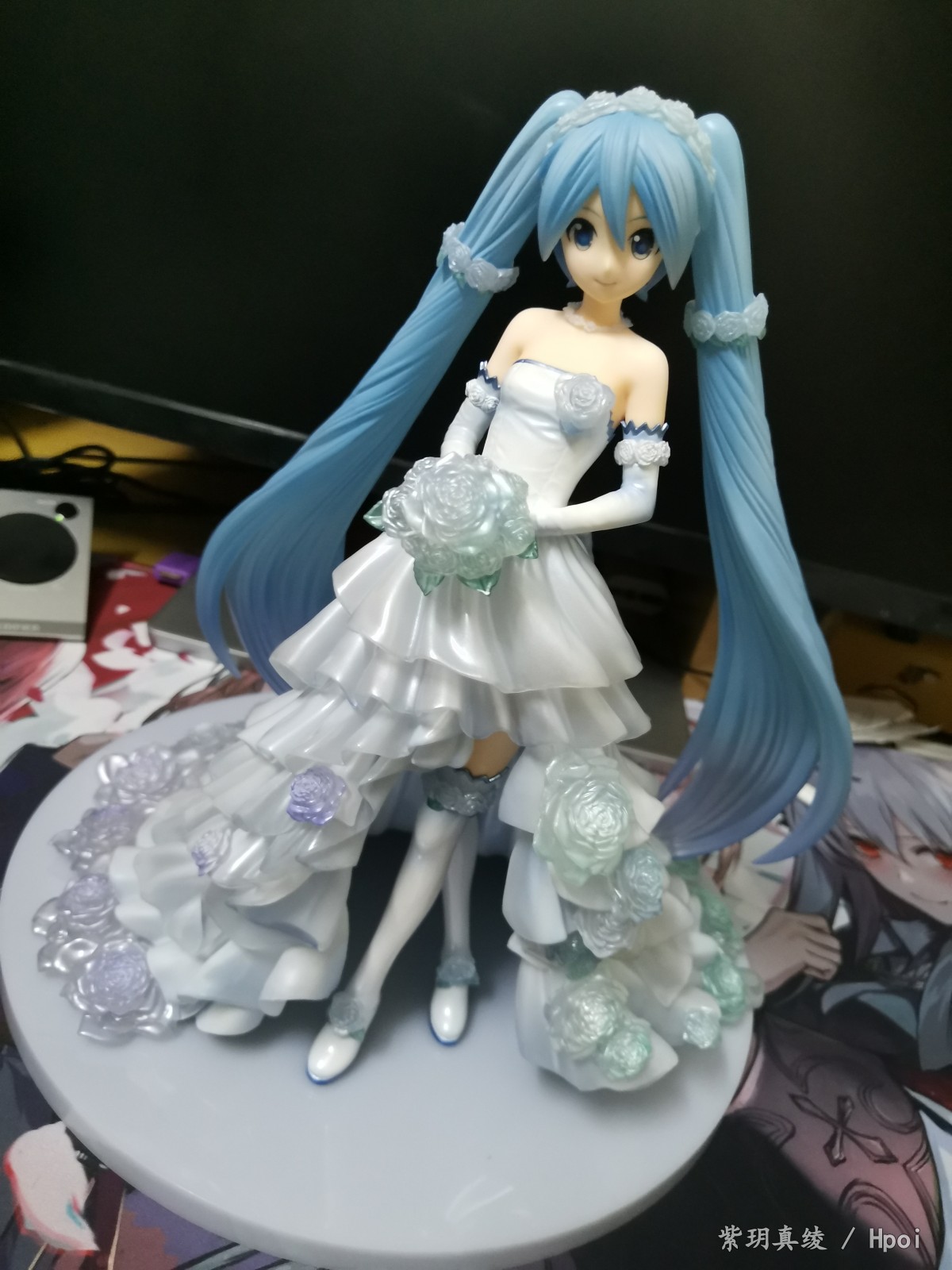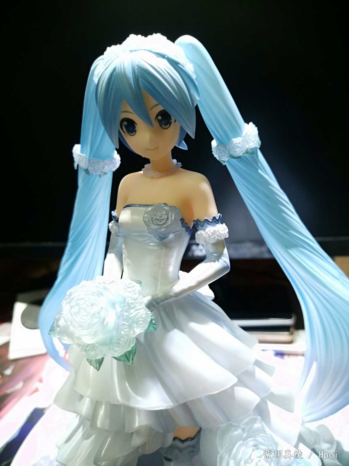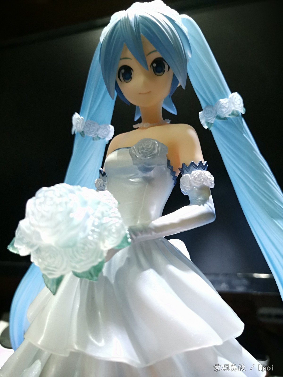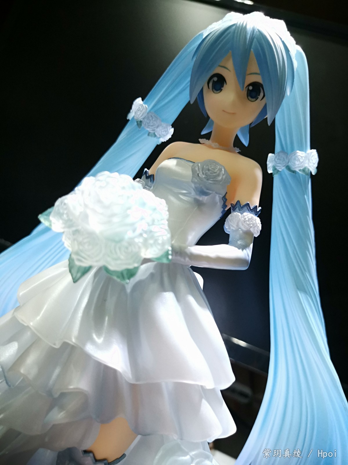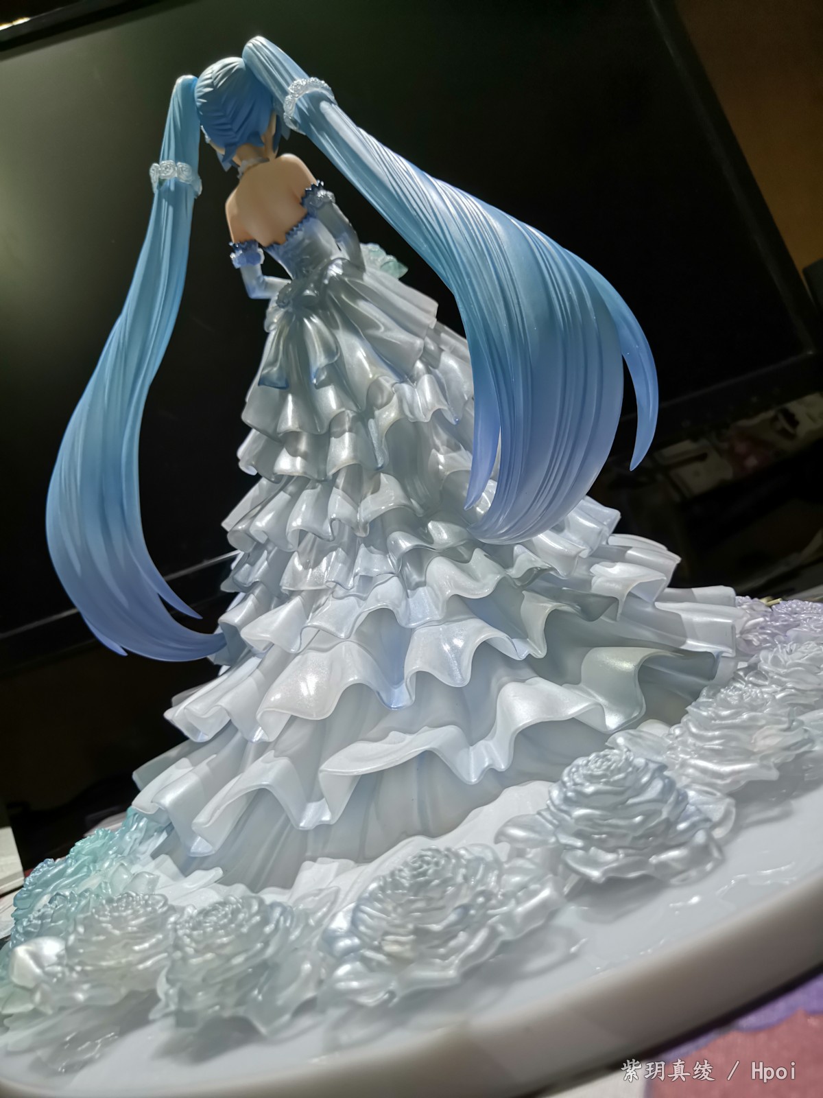拍的不好别见怪啊,手机渣。LED灯照上去后,自己看婚纱裙是白色带点蓝,但手机拍的照片有点偏黄,婚纱裙和头发带点透明,灯光聚集在公主殿下身上上就会很好看。底座直径25厘米,公主殿下加底座高25厘米,有点占地方,我自己也要整理柜子了。