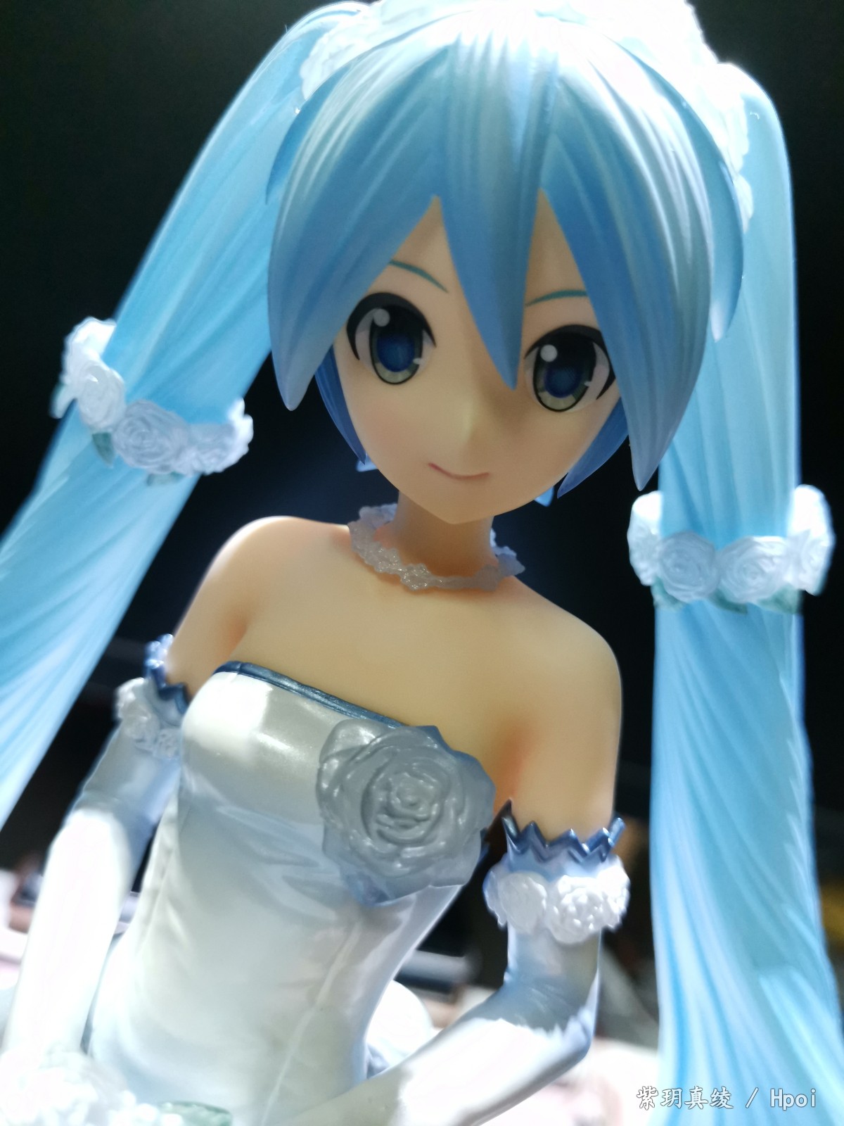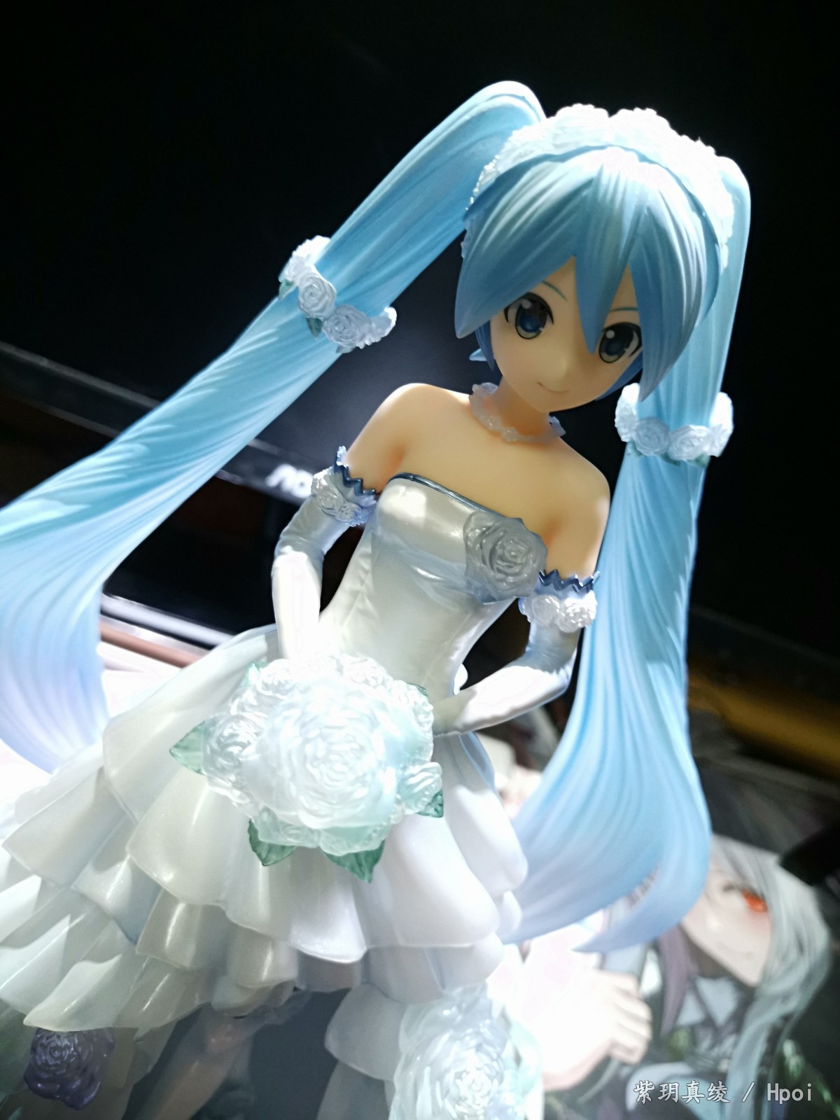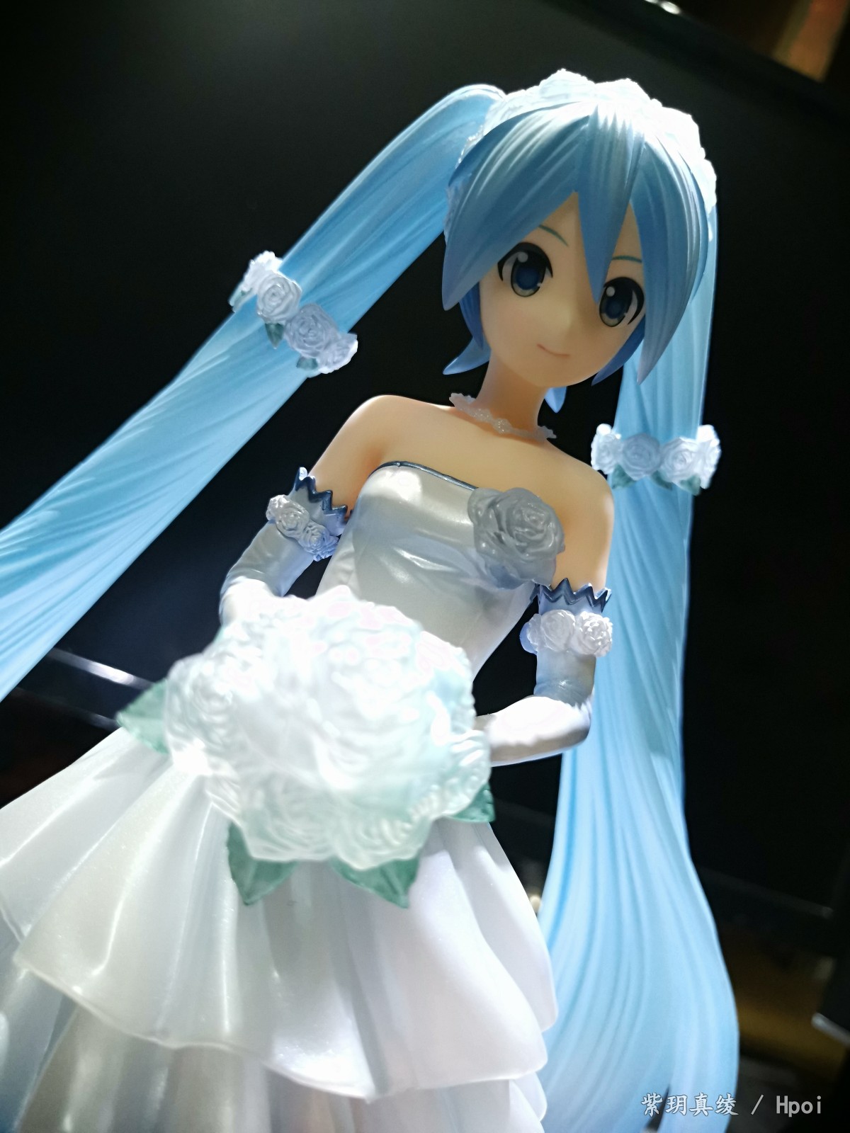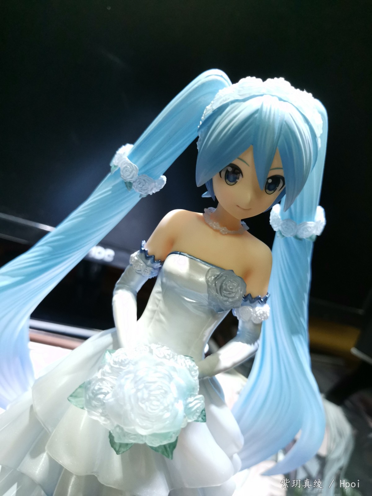拍的不好别见怪啊,手机渣。LED灯照上去后,自己看婚纱裙是白色带点蓝,但手机拍的照片有点偏黄,婚纱裙和头发带点透明,灯光聚集在公主殿下身上上就会很好看。底座直径25厘米,公主殿下加底座高25厘米,有点占地方,我自己也要整理柜子了。