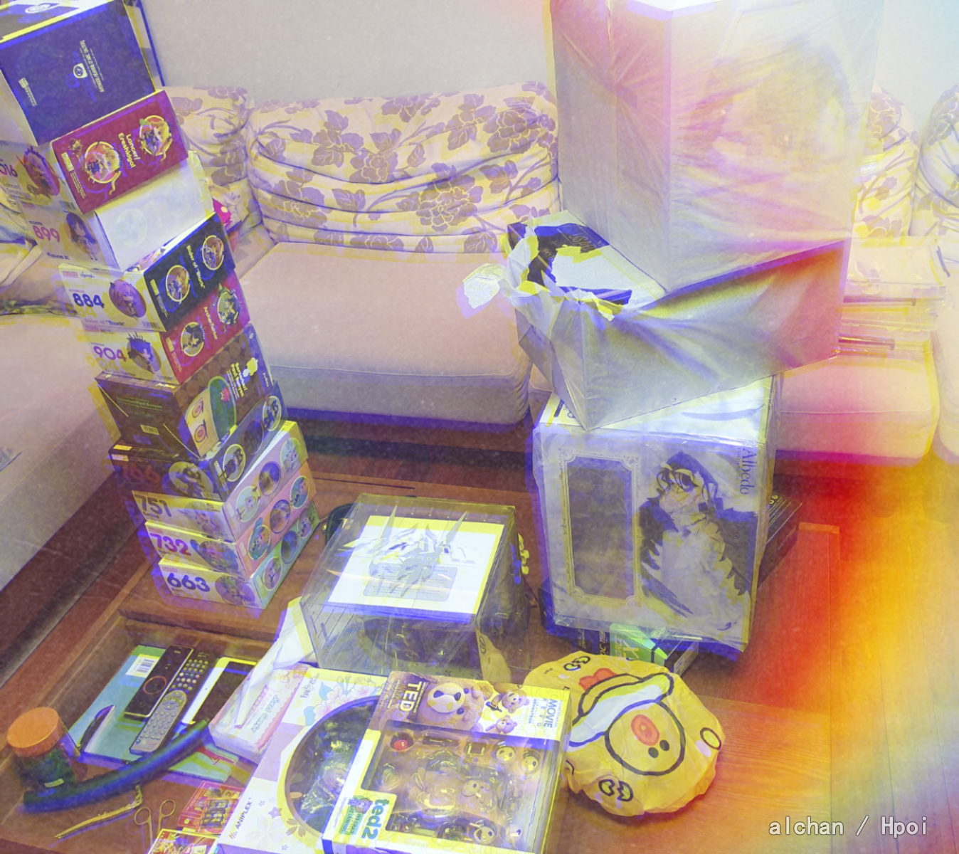 前几天回家了 今天收拾屋子 发现娃娃都被塞进了衣柜里 然后我藏的羞羞的东西都被翻出来换了地方...不知道以后要用什么样的表情去面对偶尔会来家里给我收拾房间的人... 黏土攒了好多没拆 新的显卡到了 是大姐姐给我买的 照片照的好丑 用手头一个vapowave效果的软件加了滤镜后更丑了