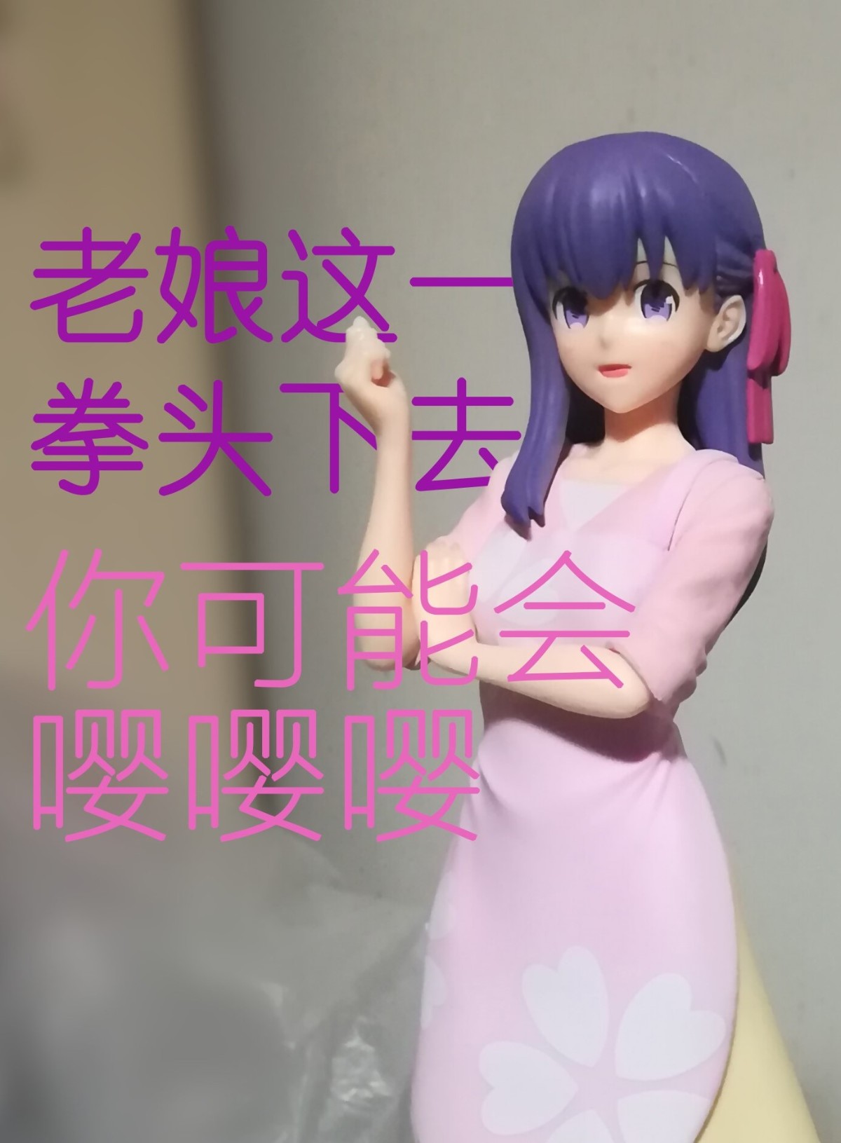 手办本身,造型很可爱,做工就差了,相当景品。分模线很明显,尤其是衣袖上。颜色搭配不复杂所以溢色问题倒是没有。脸崩不崩看个人吧,按照武内脸来看确实不像,但就卫宫饭的画风来看还原的很好,做出了那种萌萌的感觉。算上邮费还不到一张的价格,我是比较满意的。