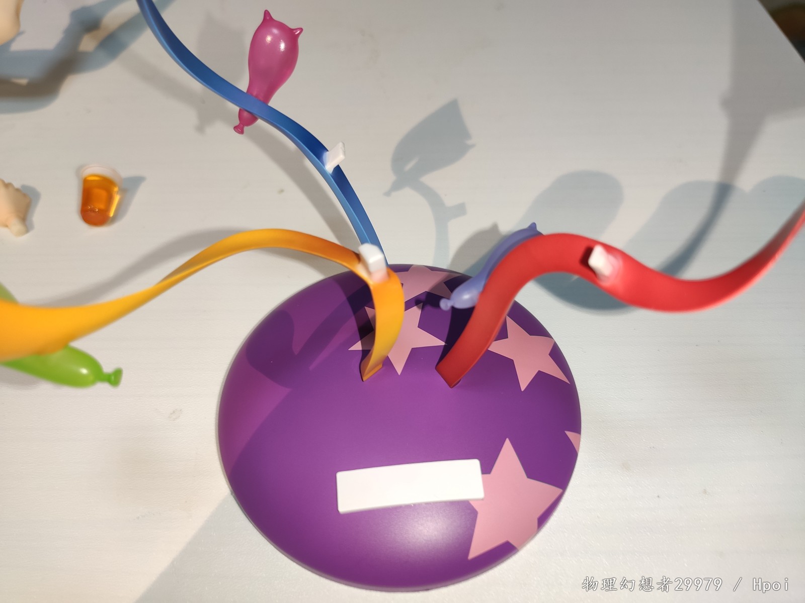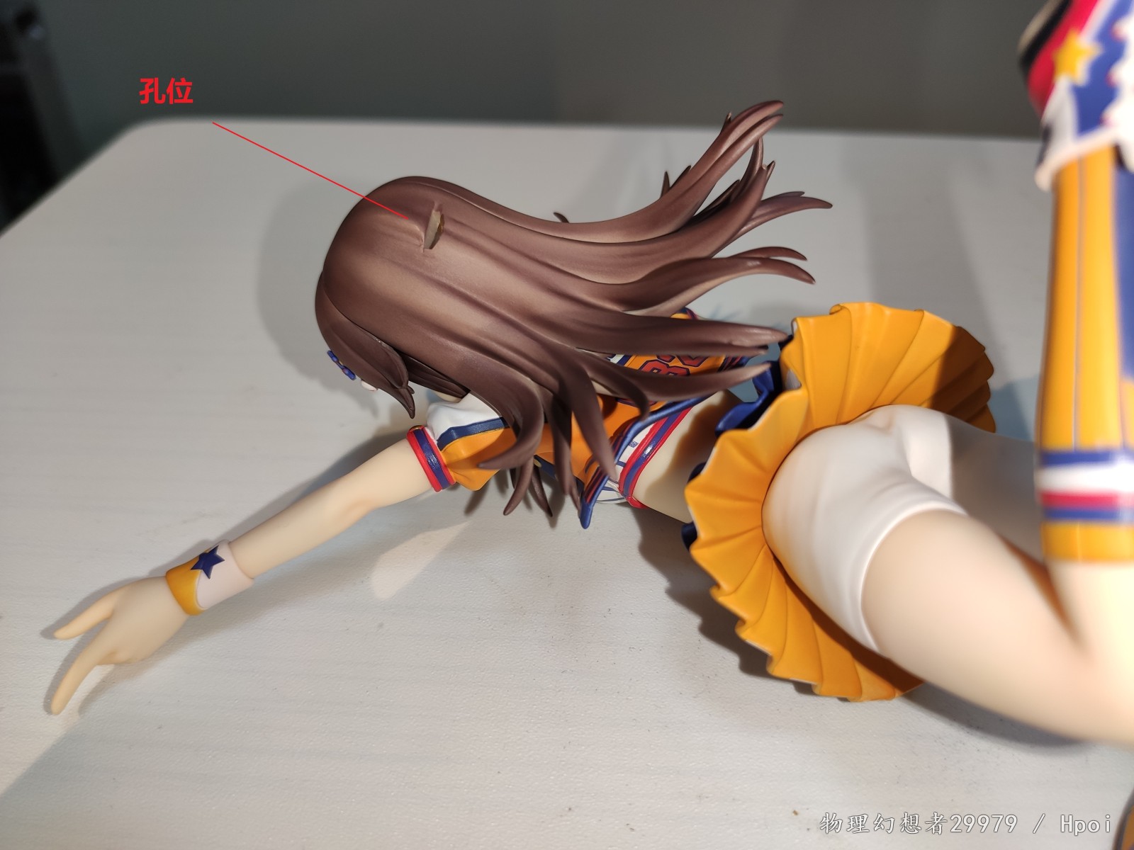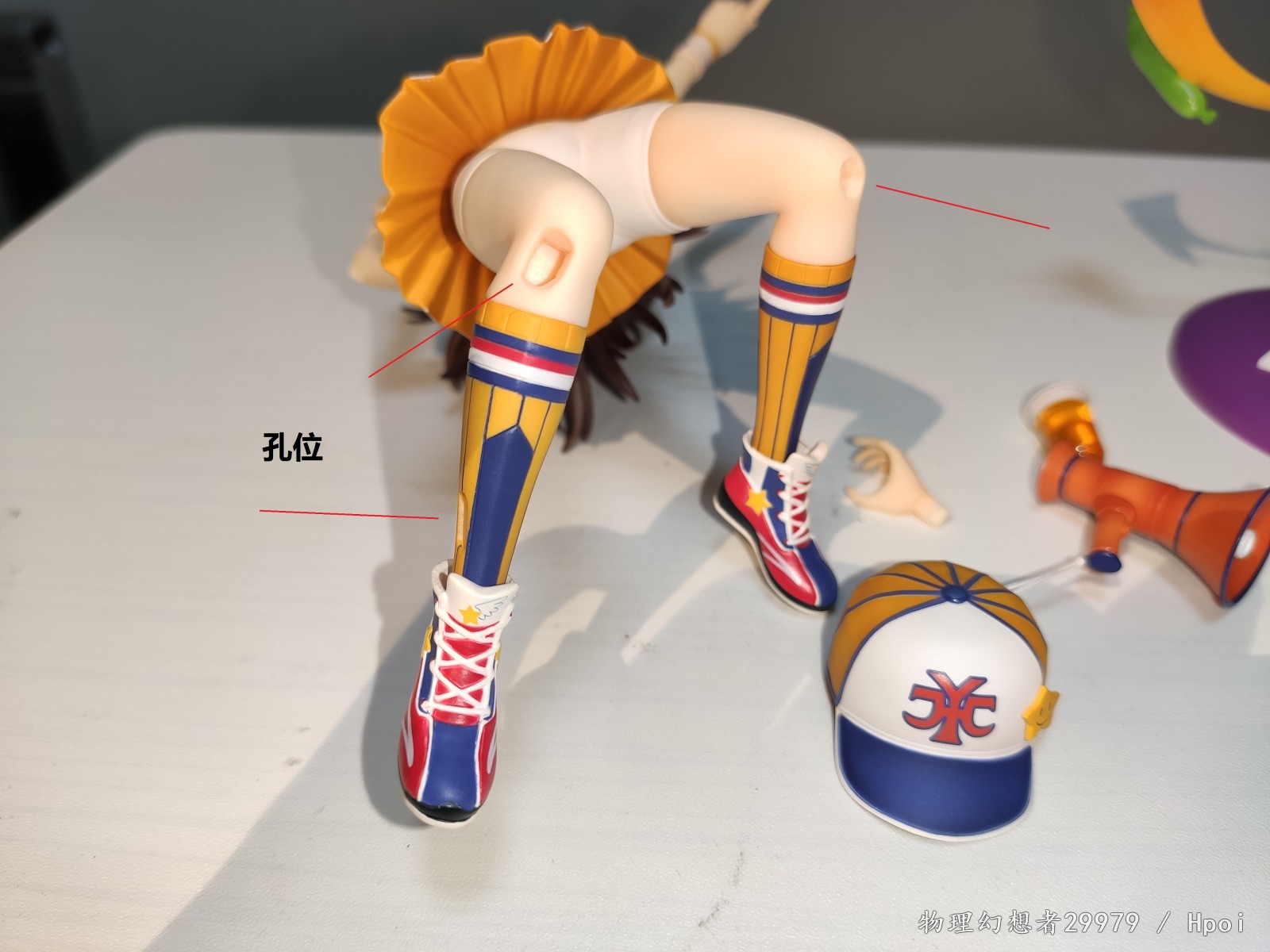 手办选用的动作背景来自游戏的SSR CG。可以看出还是有点复杂的,即使我买的是没有特点表情的普通版他的配件也不少,还多了一个符合友纪酒豪属性的酒配件可以用。普通版和特典版除了替换表情应该都一样。所以头部都是可以分离的,无可避免的头上有缝。为了完成这种复杂的场景,损失也不小,如图所示,腿上3个插孔,头上1个。插法见如图说明书。虽然是运动短裤,但是不妨碍DD社保。因为嫌麻烦(且符合原CG),大部分是用拿扩音器的道具姿势拍的。
