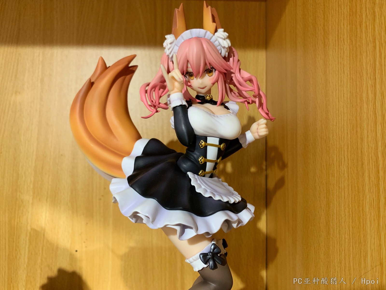 白色荷叶边蝴蝶结,黑丝加黑色小高跟;被手臂挤压变形的乳袋,还有面颊绯红带着坏笑的女仆人妻狐。