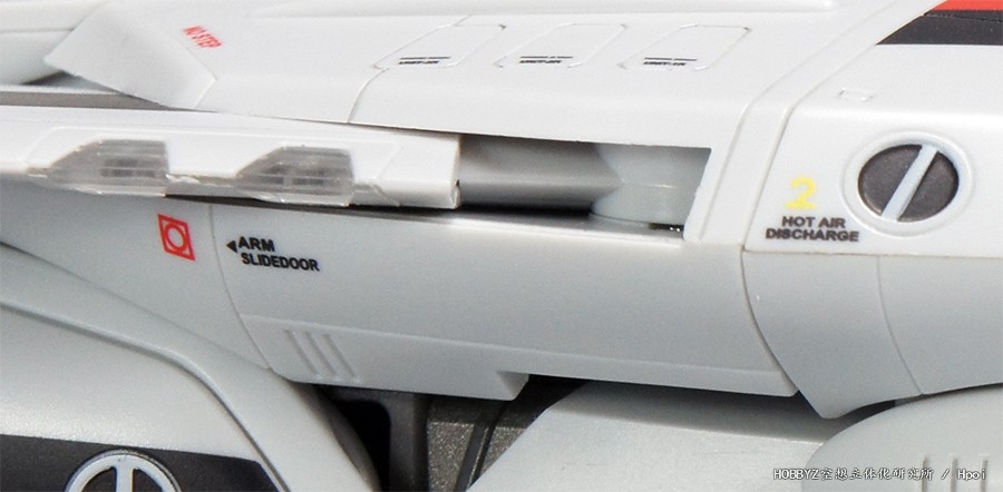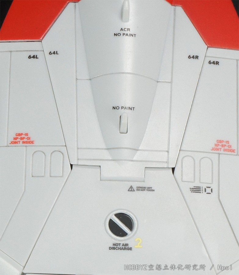 侧面的姿势调节喷嘴同样有挂钩和热气体警告。机翼下方标识,让人意外的不是机翼转动的标志,而是手臂变形时从内翻出部位的指示。
