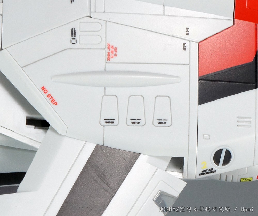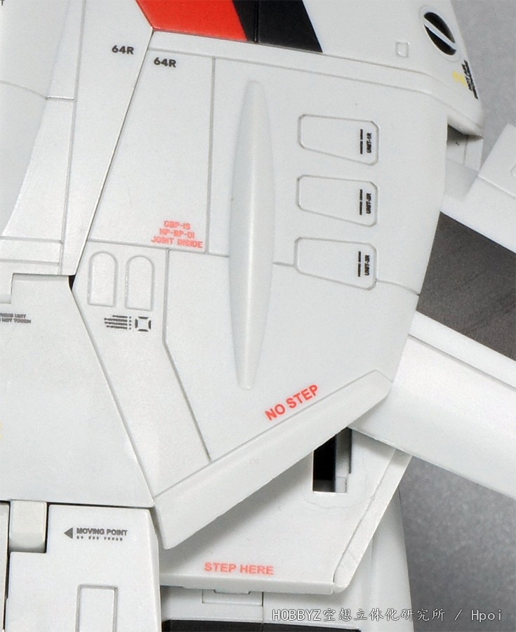 机身边缘有倾斜角度的部位不准站立,没有的地方可以站立这点是挺有趣的。另外这次通过标识解释的设定之一,就是机背上同样有SUPER PACK火箭背包用的接口(红色的GBP–1S NP-BP-01 JOINT INSIDE字样),可见背包是有支架连接在机背上,而不是单纯装在背包上的。