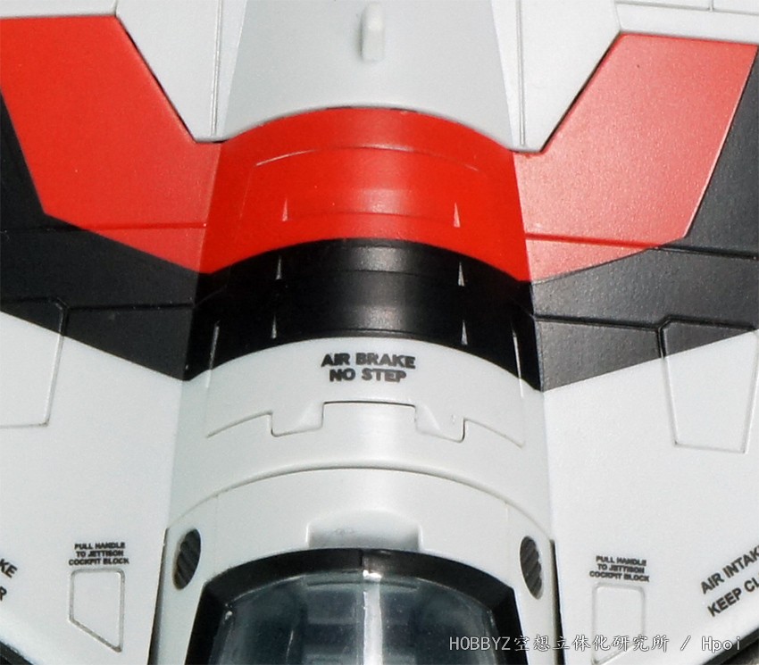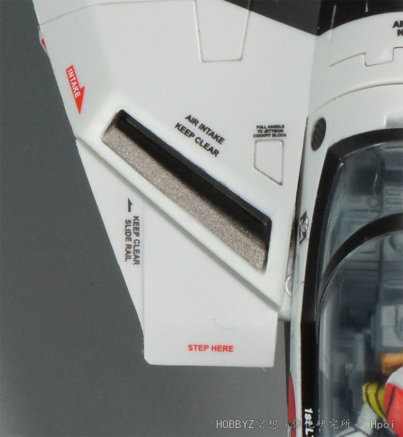 在机器人形态时,驾驶舱舱罩会被装甲板覆盖起来而且驾驶舱内部也会进行变形,因此在机体上面另行设置了外部逃生开关。梯形刻线上方的文字就是标示了这里面是机器人形态时弹射座椅的开关。在TV版VF-1J/A中这里使用的是和机头弹射座椅按钮一样的黄色箭头标志,VF-1S改成了全文字标识。在副进气口上方有进气口保持清洁畅通的标识。VF-1变形的时候机体上面整个板块需要进行移动,所以在副进气口前方标识出来了滑轨位置,这算是对机械设定的一个补充。