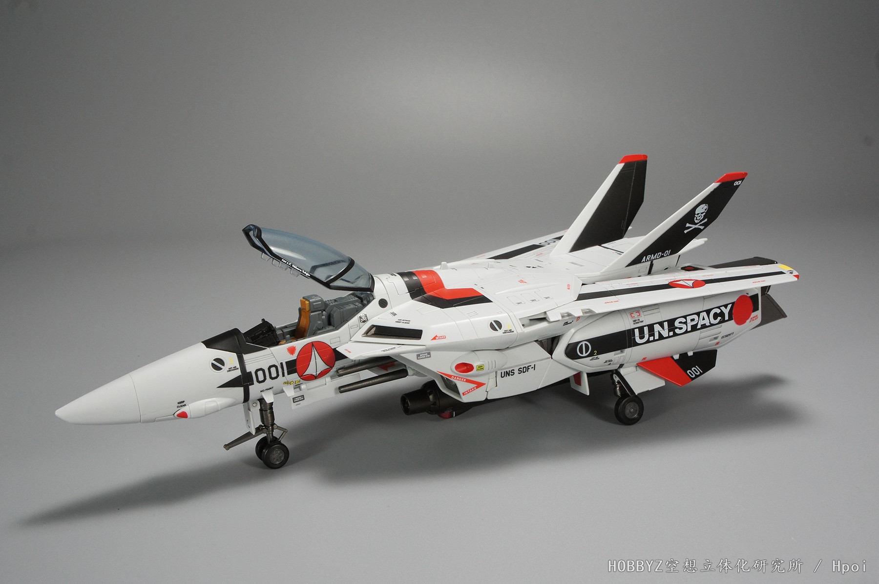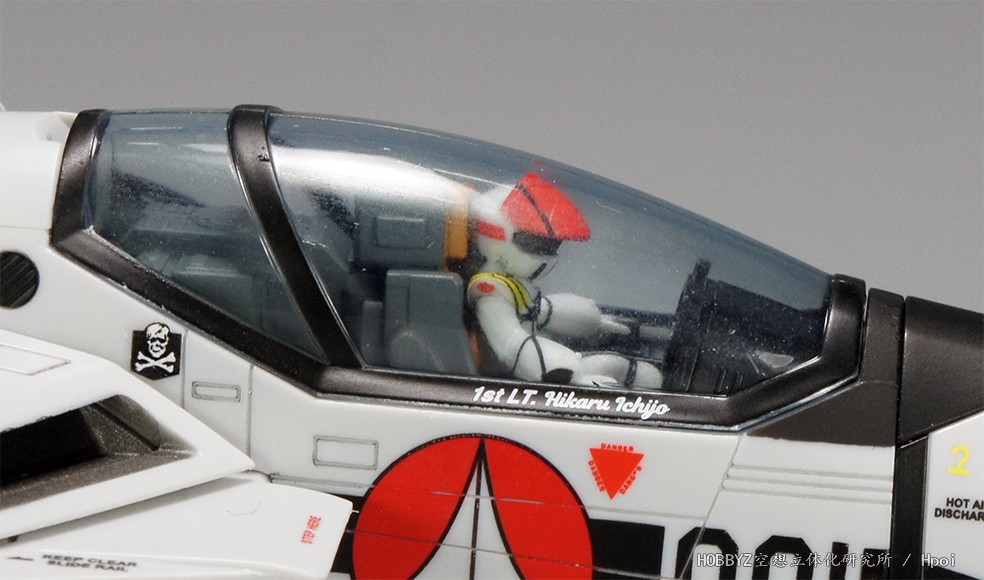 座舱框架上有驾驶员一条辉的名字,旧套件以及2.0的设计上,前缀都是“PILOT(驾驶员)”,而DX超合金参考了剧场版的设定图,前缀为驾驶员一条辉的军阶“中尉”,再前面则有其作为队长机位置的标记。和TV版的J和A型相比,这次剧场版VF-1S终于把逃生舱炸药的红色三角警告标志加上。但是驾驶舱后侧的骷髅依然欠缺,为所长自行加上。关于这点,所长在贴上水贴之后进行变形时,水贴因为变形过程中零件互相摩擦干涉而损坏,最后要对内部结构进行切削整型,所以不加应该是考量到磨损的问题吧。各位看官如果想加回骷髅标志,那就必须要留意一下零件干涉的问题了。