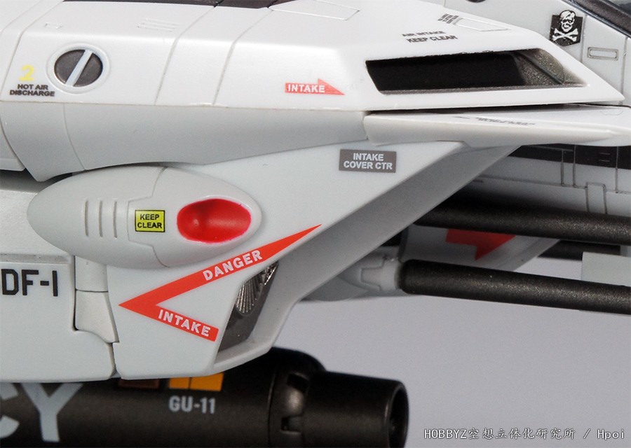 设定上VF-1各处设置的黑色孔是姿势调节喷嘴,同时上面的白色横梁还可以用来挂上钢索钩子以将机体固定在舰上,因此有文字的注意热气喷出以及黄色钩子标志。股关节突起的前方红色部分是探测器镜头而标示有保持清洁的字样。