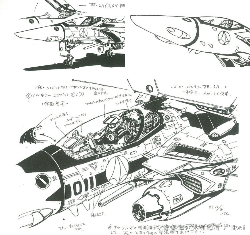 关于VF-1的机身标识设计,其实就和高达系列一样,最初的TV动画中其实几乎是没有的,而在剧场版《可曾记起爱》中,驾驶舱部位的特写镜头中,有比较详细的标识描写。