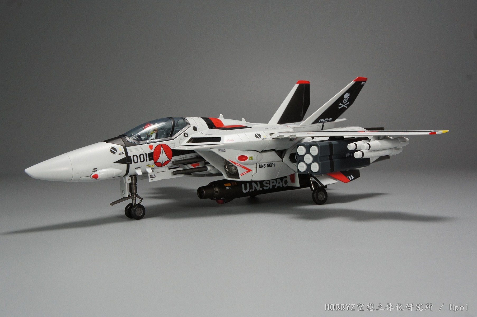 而BANDAI的DX超合金,从TV版的VF-1J公布之初,就将全印刷,以及由天神英贵新设计的标识作为一大卖点作为宣传。而根据天神老师所说,他是参考了2008年左右(剧中年代)的美国海军战斗机标识而重新设计的。和上面长谷川模型对比一下就知道,由于都是参考现实战斗机,所以DX超合金和2.0标识风格几乎一样。不过正是这些细化,以及对原机设和玩具机构进行了连接和解释,起到了对玩具画龙点睛的作用,我才会去花更多时间去研究这些标识包含的意义。