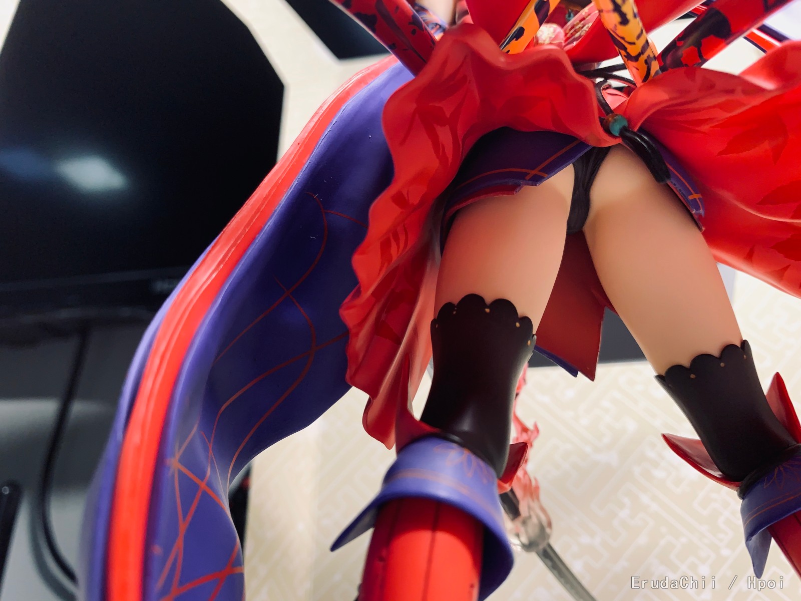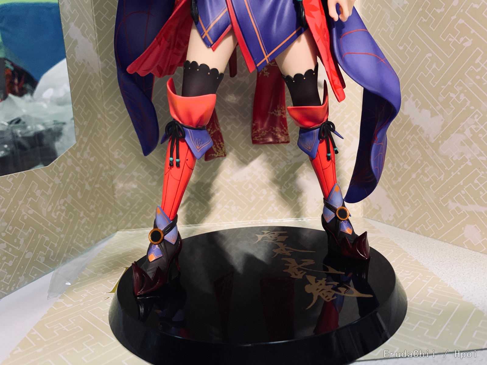 这块我怀疑是塑吸包装设计有缺陷,这次的包装里在两腿之间放了一大块占位用的塑吸支架,用来支撑两腿同时顶住后边带结的飘带,盖上盖子可将腿、飘带完全固定主。想法是挺好的,但是如果工厂打包时操作不当就会导致飘带脱落,因为那块占位的塑吸支架角度稍微有点不对就无法盖住盖子,如果强行盖住就会使后方飘带一直受力,脱落是早晚的问题,(别问我咋知道的,回盒的时候给我急出一身汗(ಥ_ಥ)