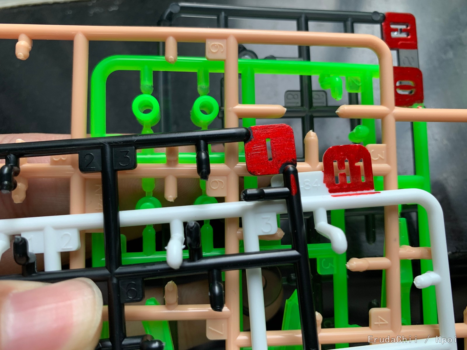 重新涂了几个不同底色的流道,注意这里没换笔头,用的是喷笔专用笔头 手涂 的,所以漆面不太光滑
