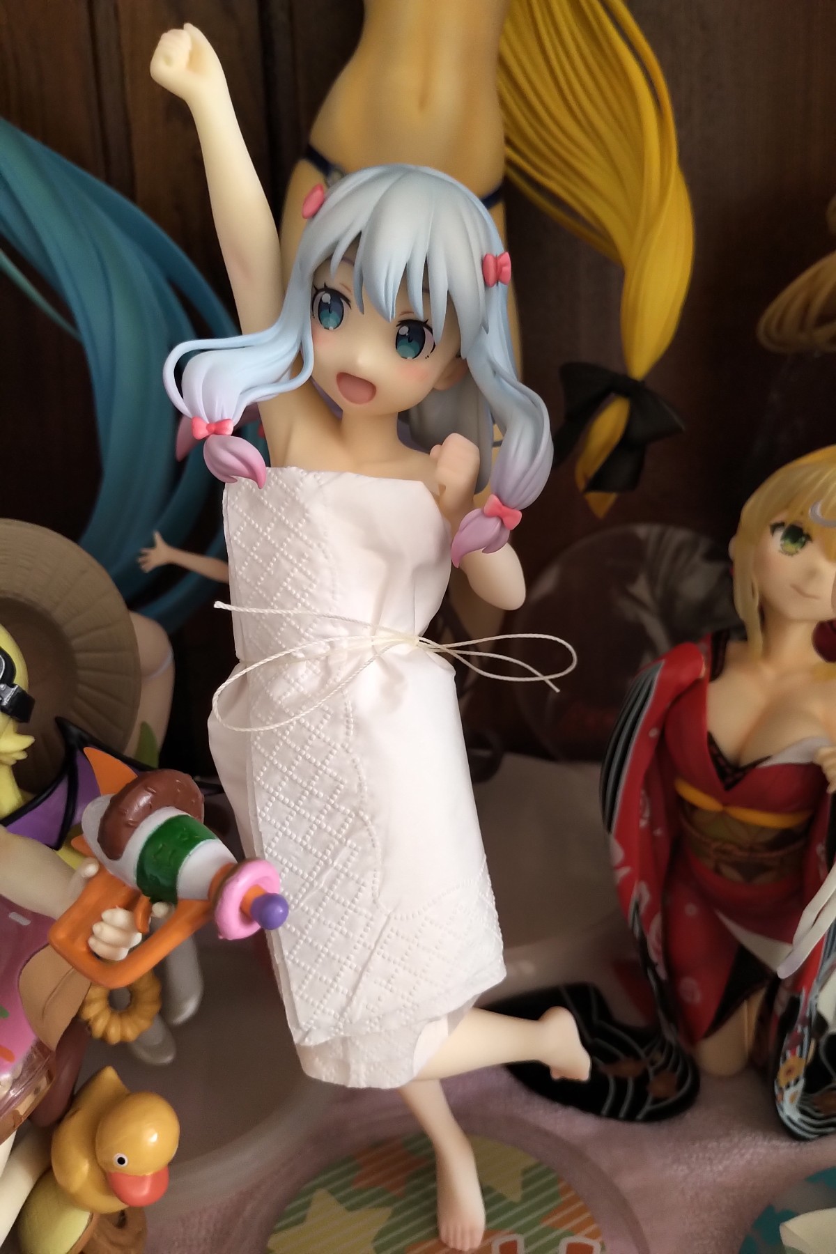 关于脱了之后怎么穿衣服这档事:把脑袋拔下来→穿上衣服→用吹风机吹热→摆好造型 其实用手握着衣服就行→迅速泡水里冷却→如果觉得缝很大就用白色的线给她衣服上系两圈固定→完成✅
