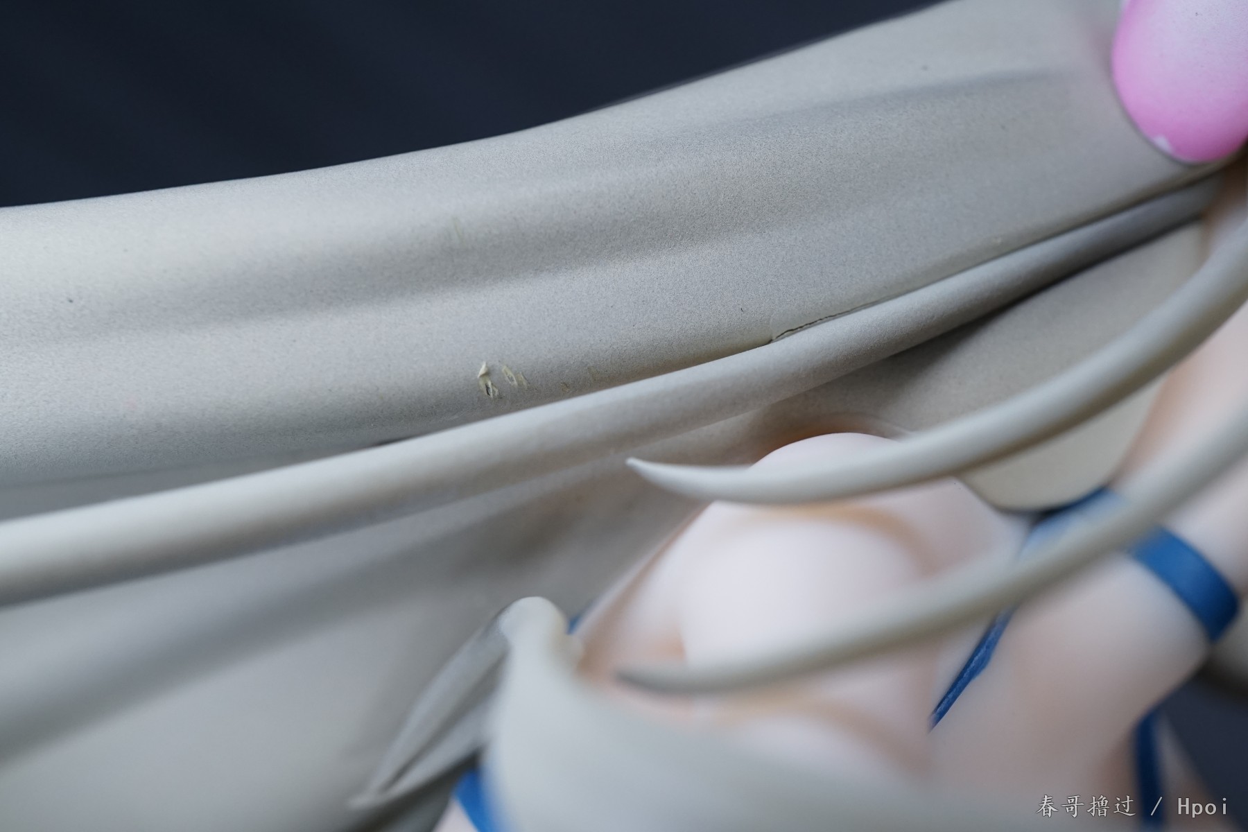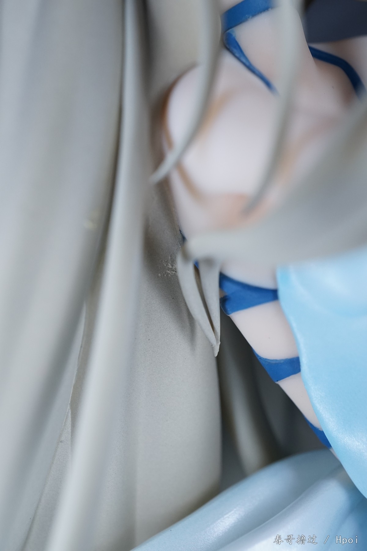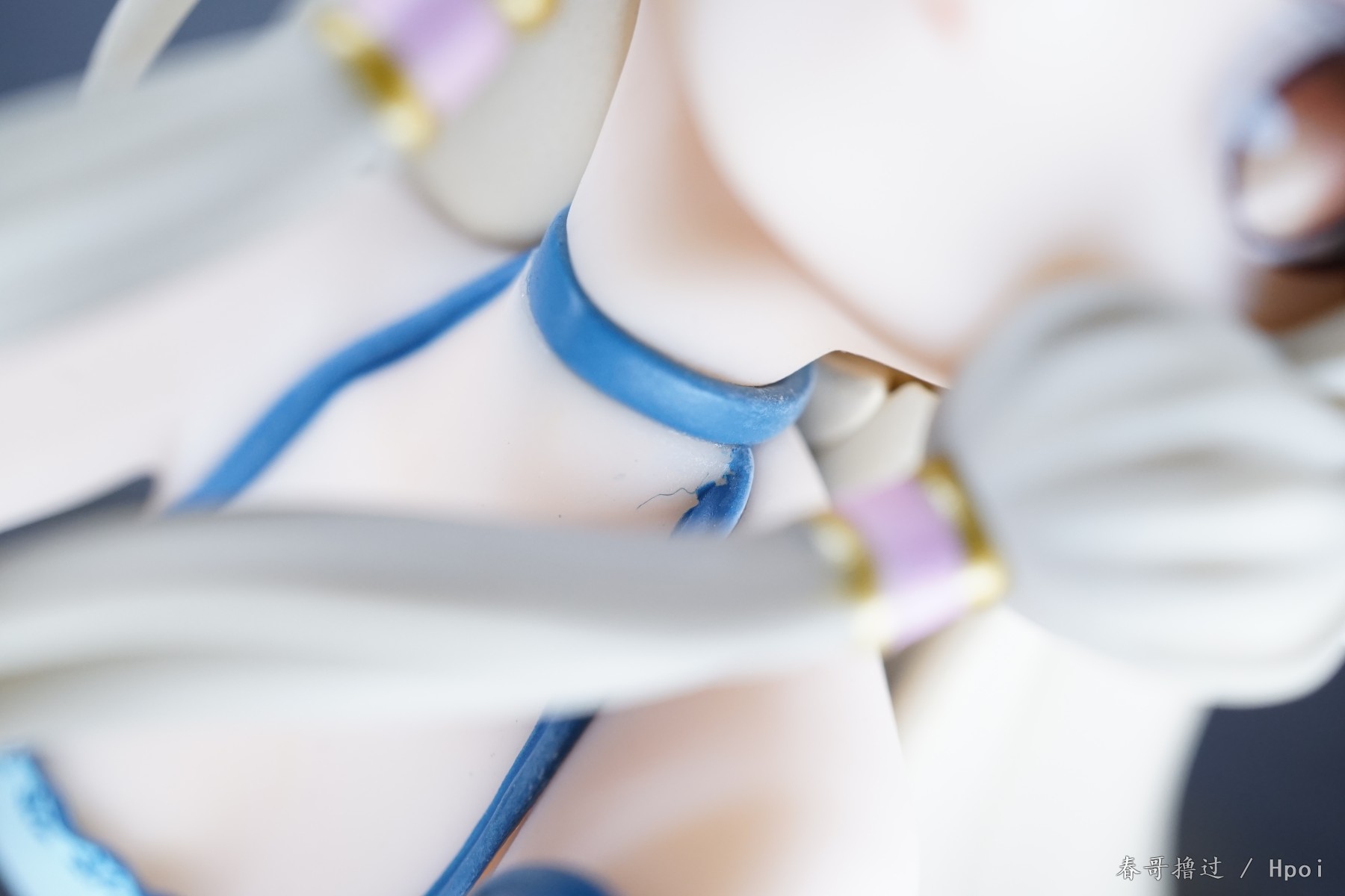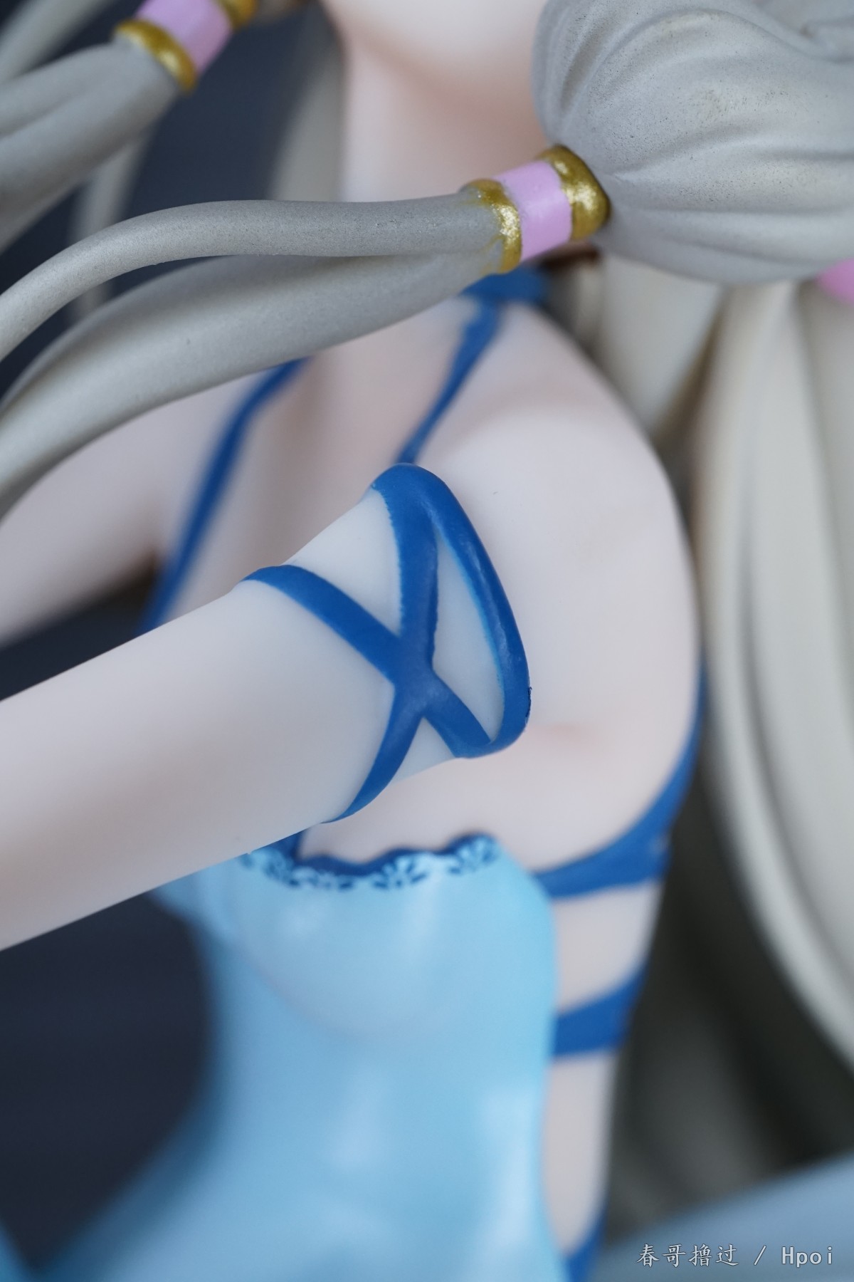 腿部的丝带、吊带裙的吊带,这些部位的粗糙和溢色就不说了,大家自己看看吧,唯一让我不解的就是,左臂的丝带,光线充足的环境下,丝带中间和周围一圈有比较明显的蓝色,就是一种淡淡的蓝色,不知道是怎么做到的。
