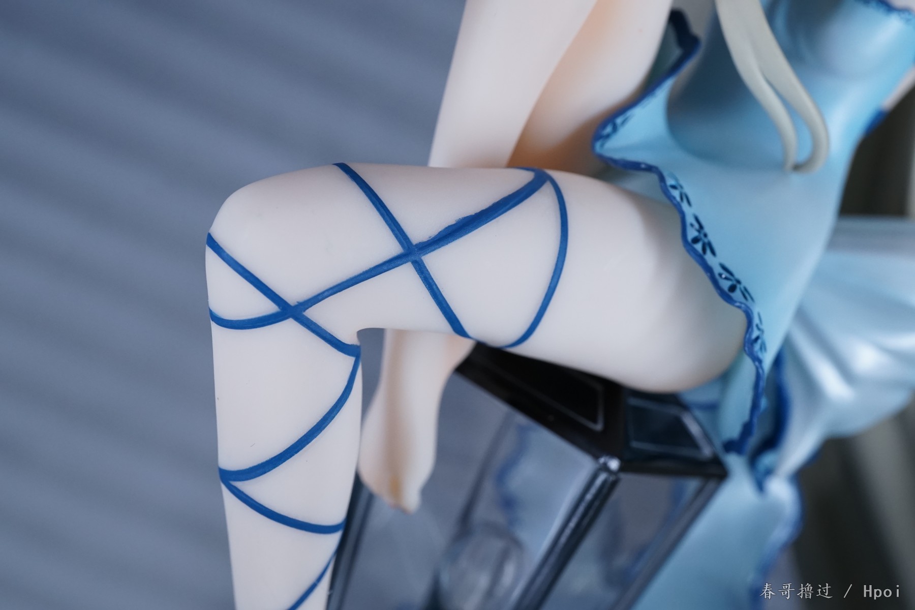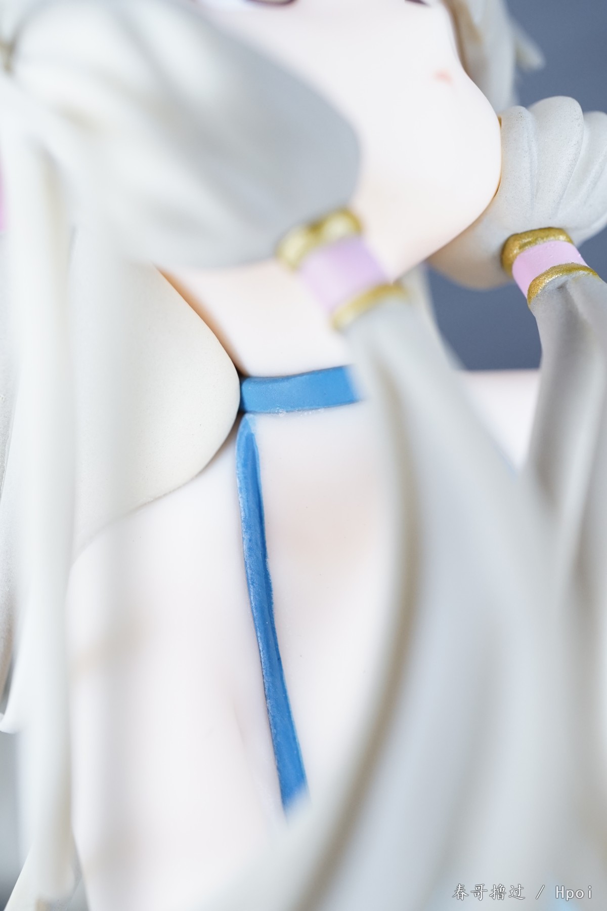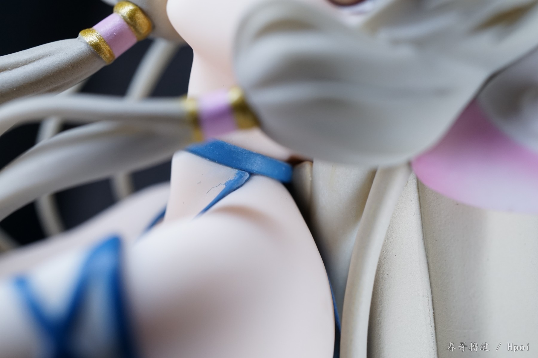 腿部的丝带、吊带裙的吊带,这些部位的粗糙和溢色就不说了,大家自己看看吧,唯一让我不解的就是,左臂的丝带,光线充足的环境下,丝带中间和周围一圈有比较明显的蓝色,就是一种淡淡的蓝色,不知道是怎么做到的。