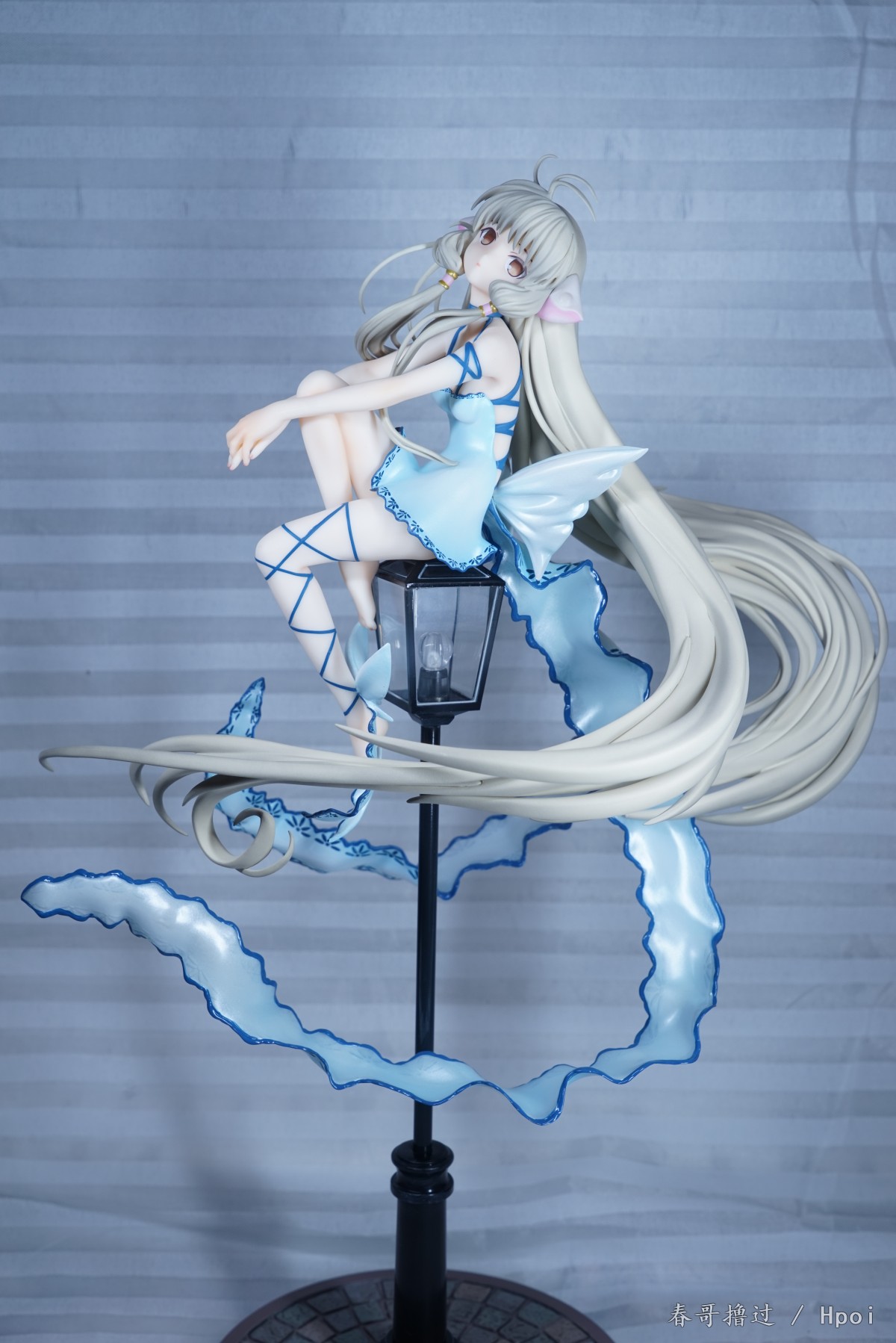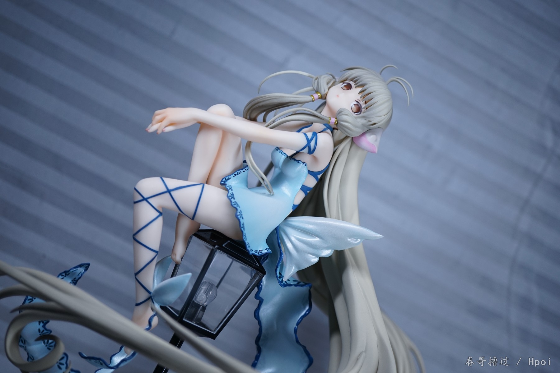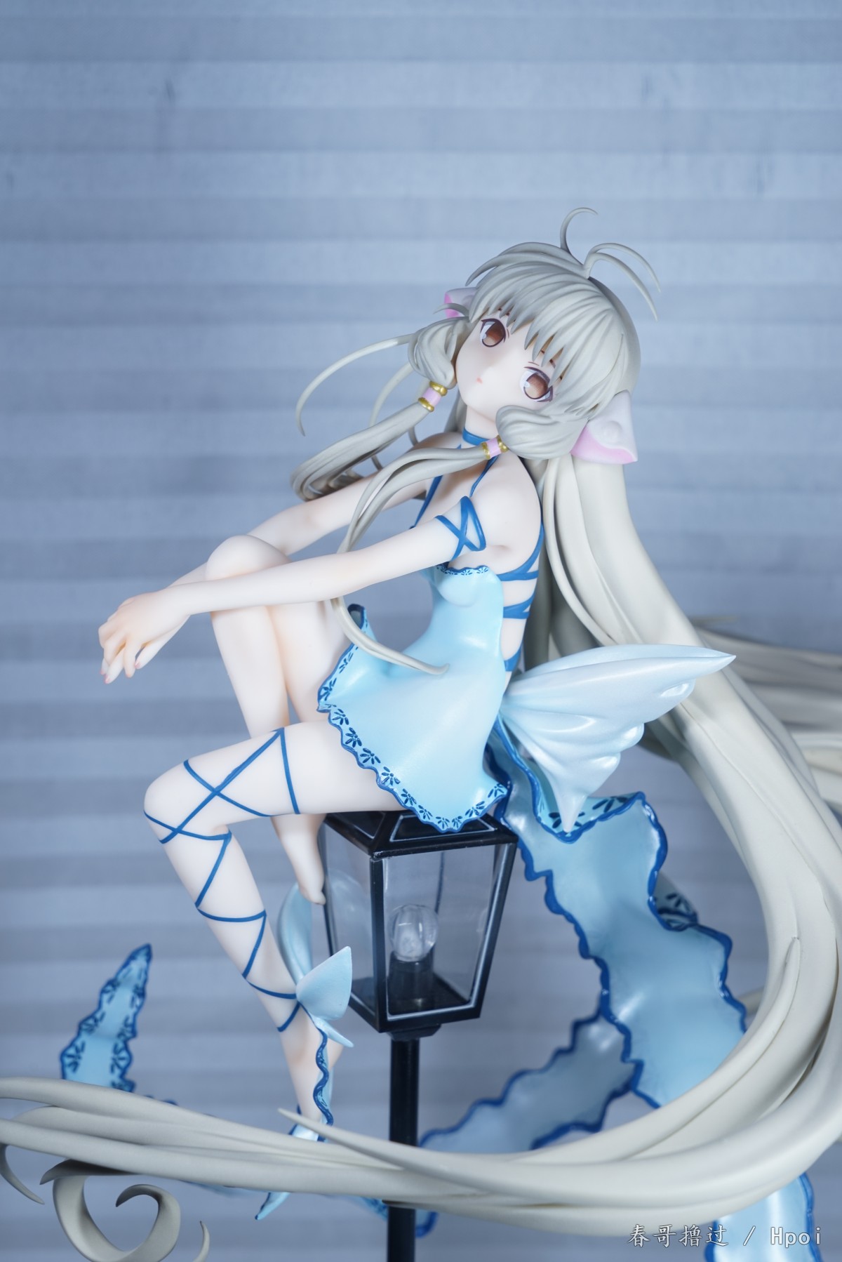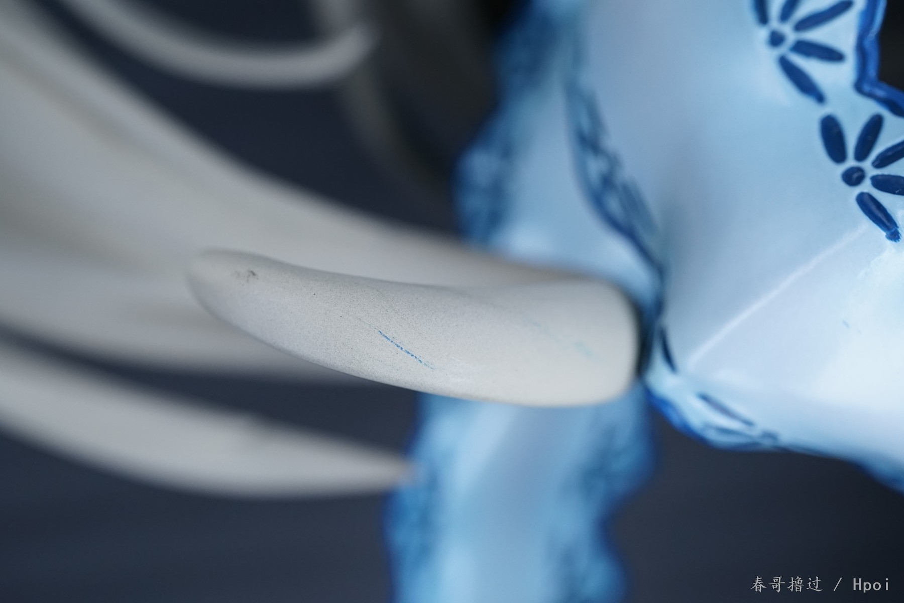腿部的丝带、吊带裙的吊带,这些部位的粗糙和溢色就不说了,大家自己看看吧,唯一让我不解的就是,左臂的丝带,光线充足的环境下,丝带中间和周围一圈有比较明显的蓝色,就是一种淡淡的蓝色,不知道是怎么做到的。