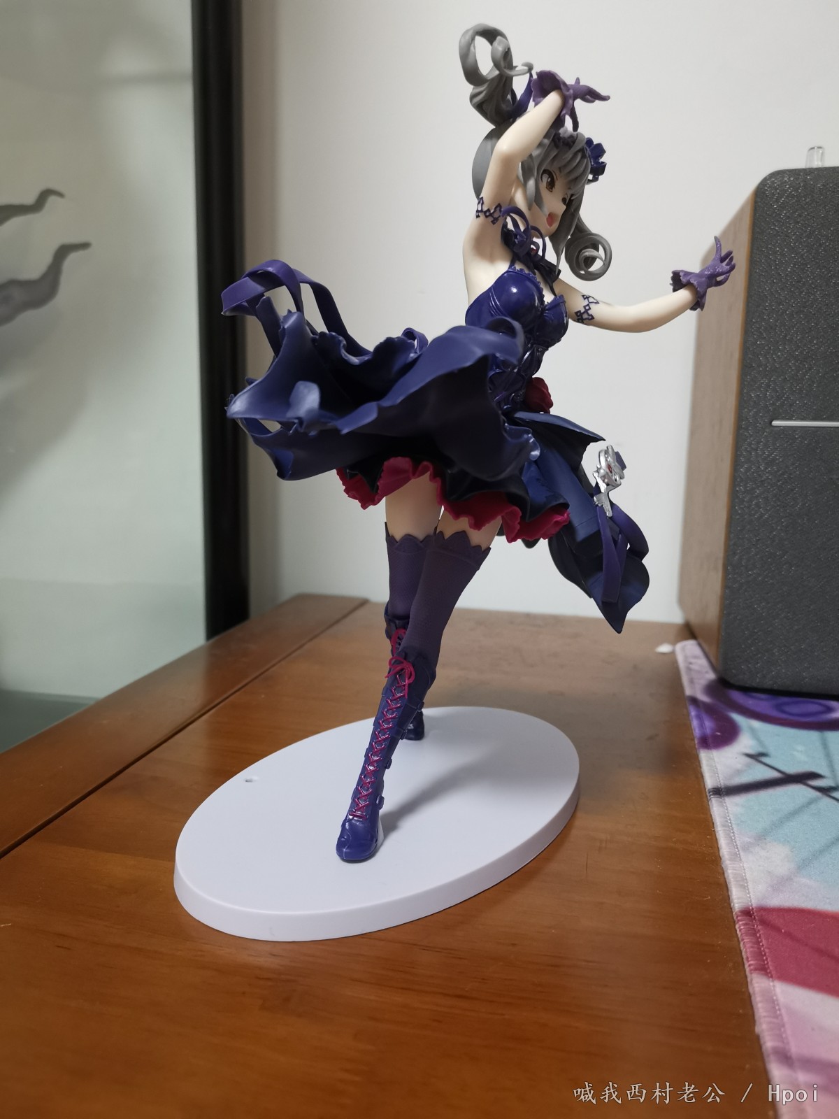 (刚装好是倾斜的,不过有个支架撑在裙子侧面,而且腿是软材料的,能扶回来2333,顺带一提两脚的底座插槽间距也大了不少,但是由于腿是软的也可以强行拉大一点)