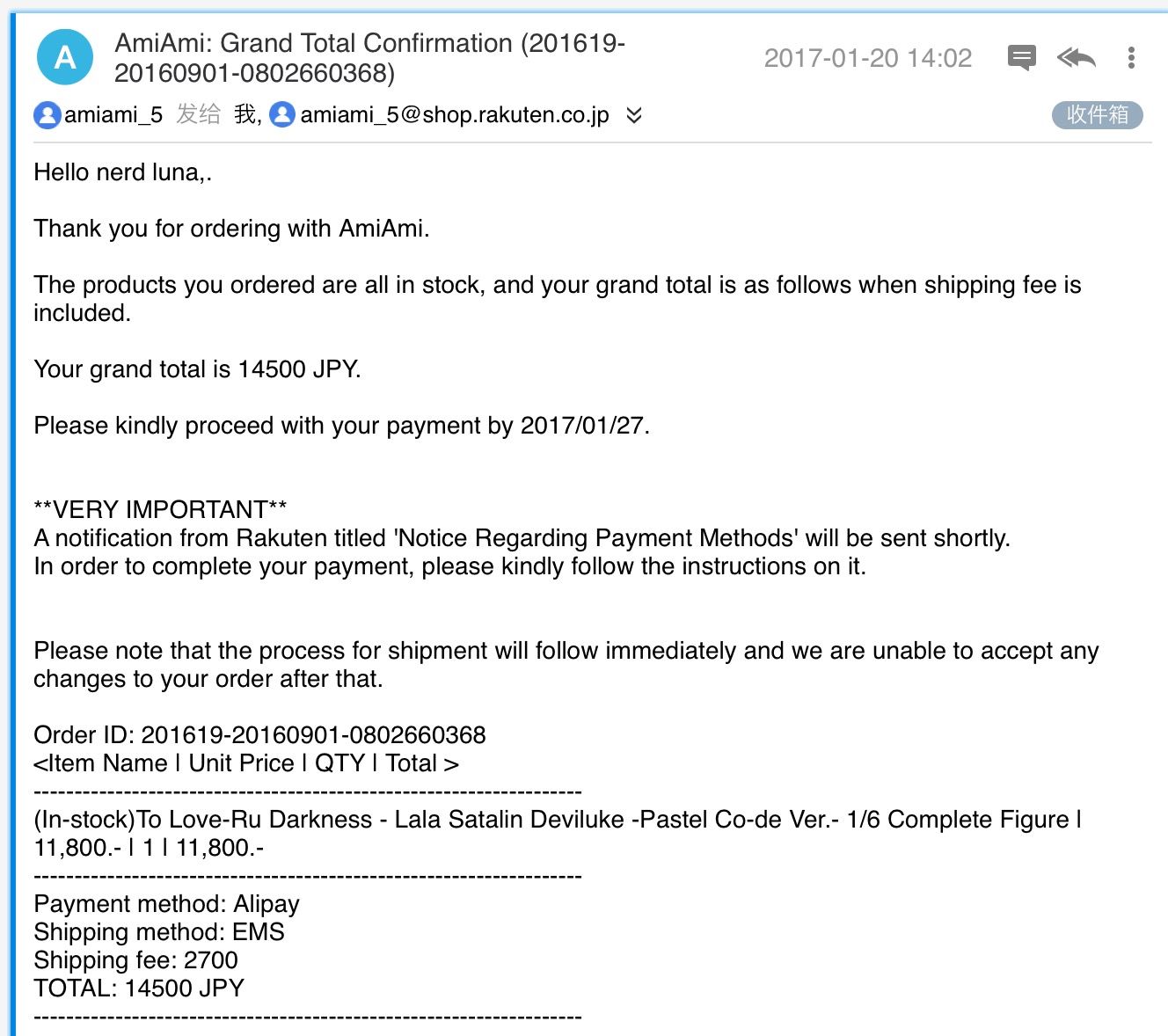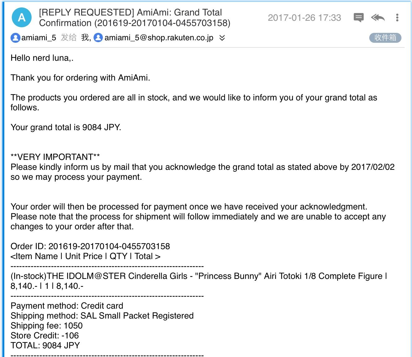 b. 如果是信用卡,会先收到含有费用明细的确认邮件。确认没问题,直接回复邮件即可,之后会收到支付成功,准备配送的邮件。剩下的,等收货吧。