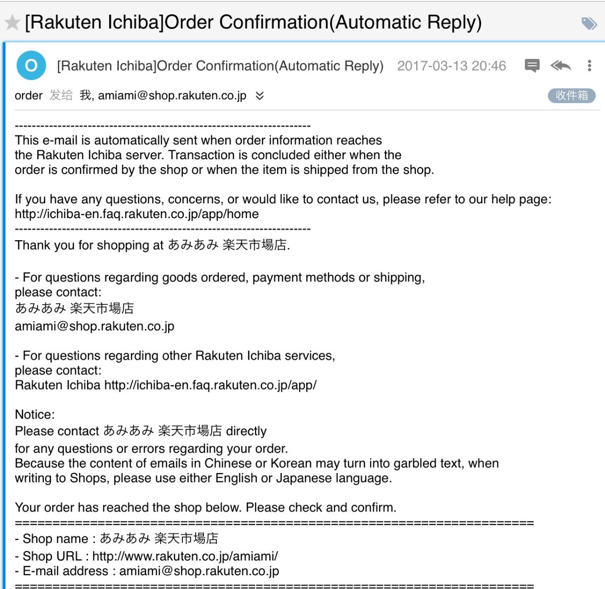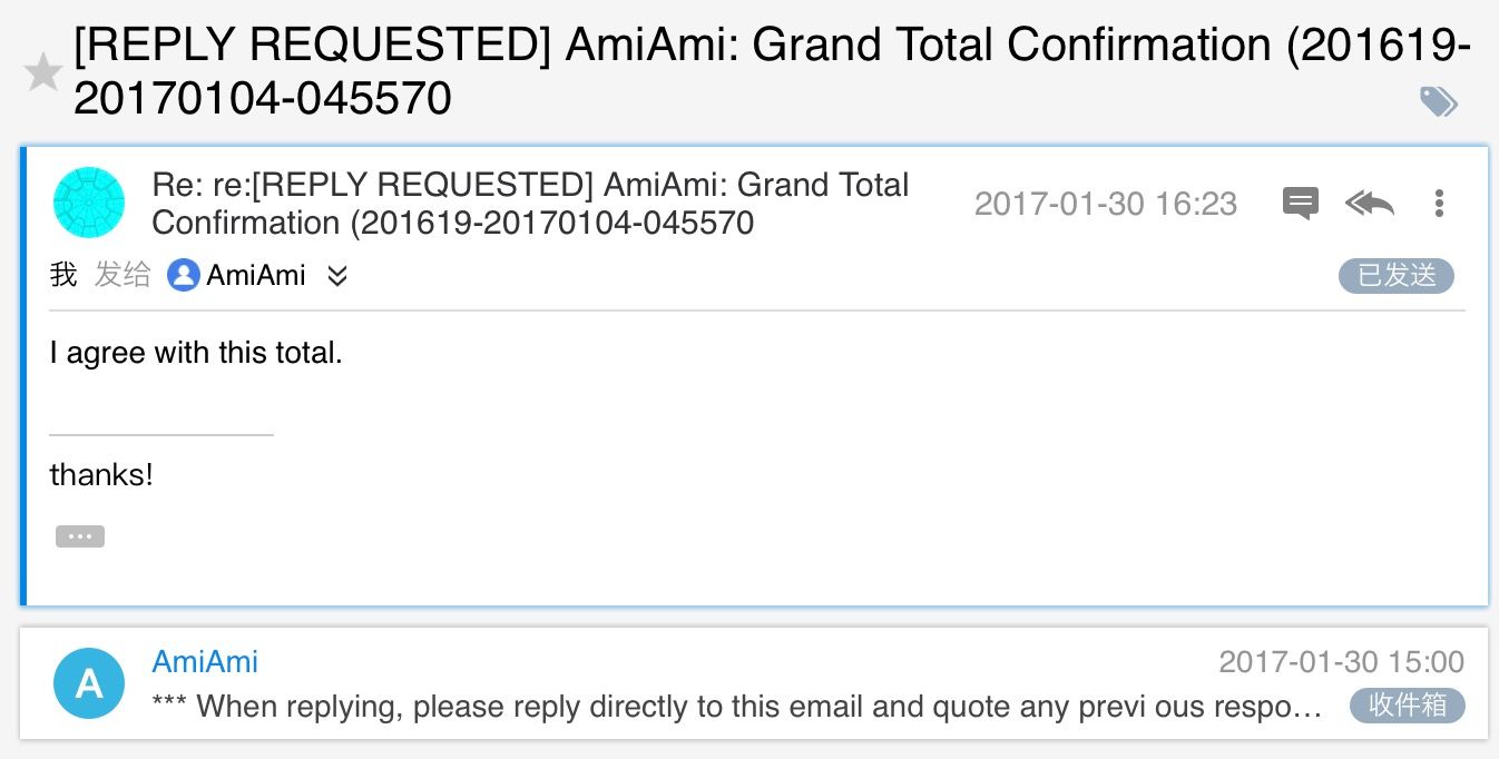 上面的都是amiami发货的,其他商家发送的邮件内容可能有差别,不过流程都差不多。