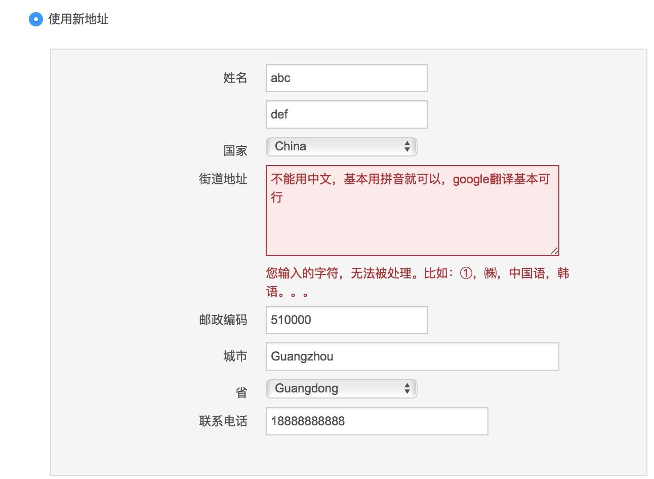 常规操作,不多说,这里提一下地址,只能用英文字母,基本用拼音可以。麻烦的可以先用google翻译,然后在自己调整一下。