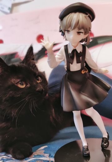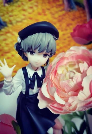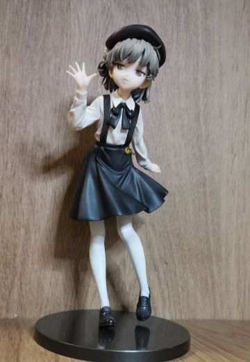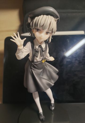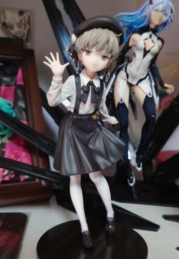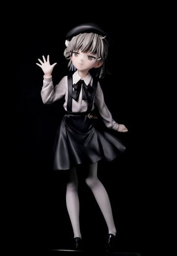 外觀是一位小學生少女,皮膚蒼白且灰色頭髮,左眼有顆淚痣,整體服裝及形象都傾向灰色色調。