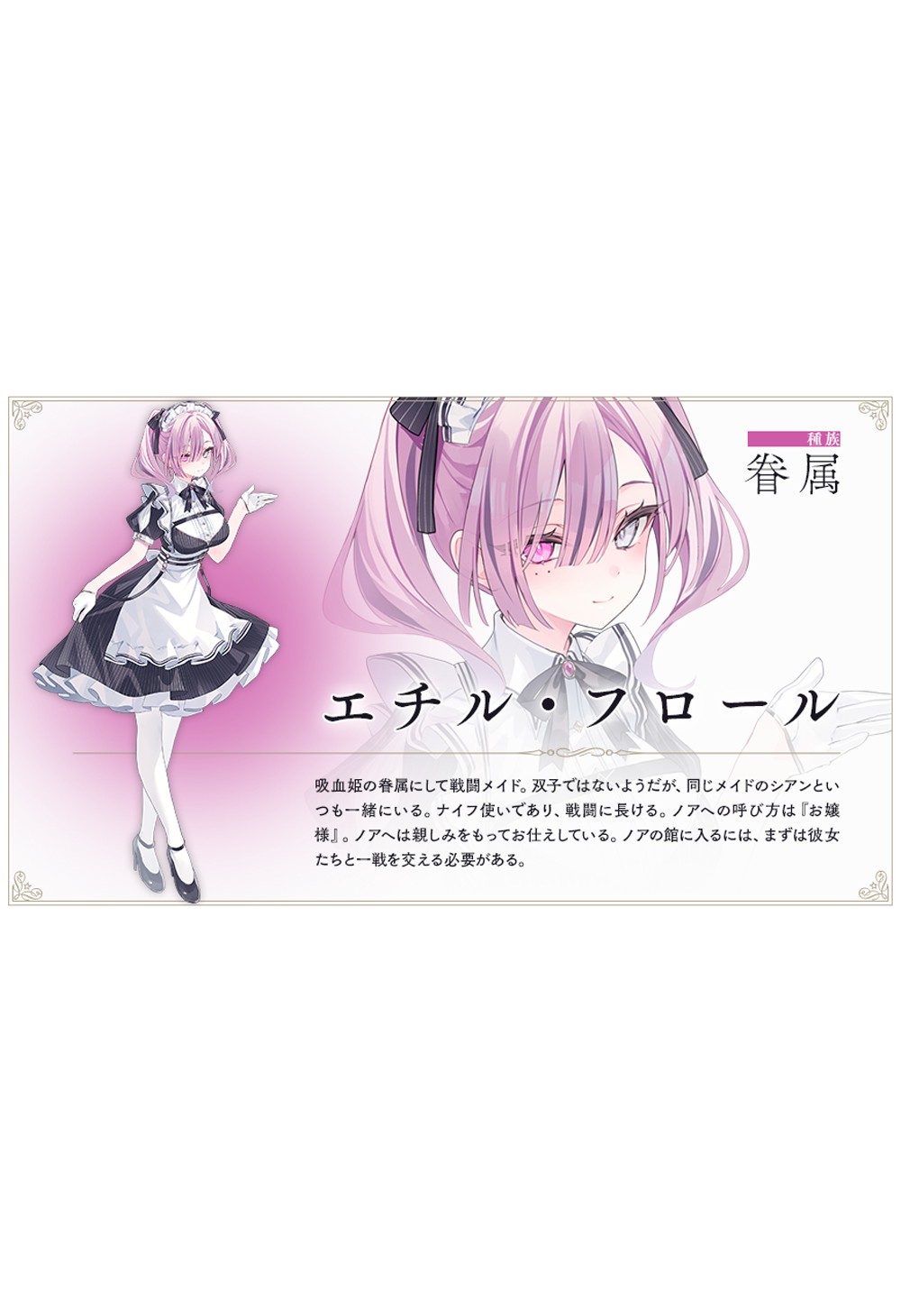 吸血姬的眷属兼战斗女仆。虽然并不是双胞胎,但总是和同样身为女仆的希安在一起。使用匕首,擅长战斗。称呼诺娅为“大小姐”。亲近地侍奉着诺娅。要想进入诺娅的宅邸,必须先与她们交战一番。