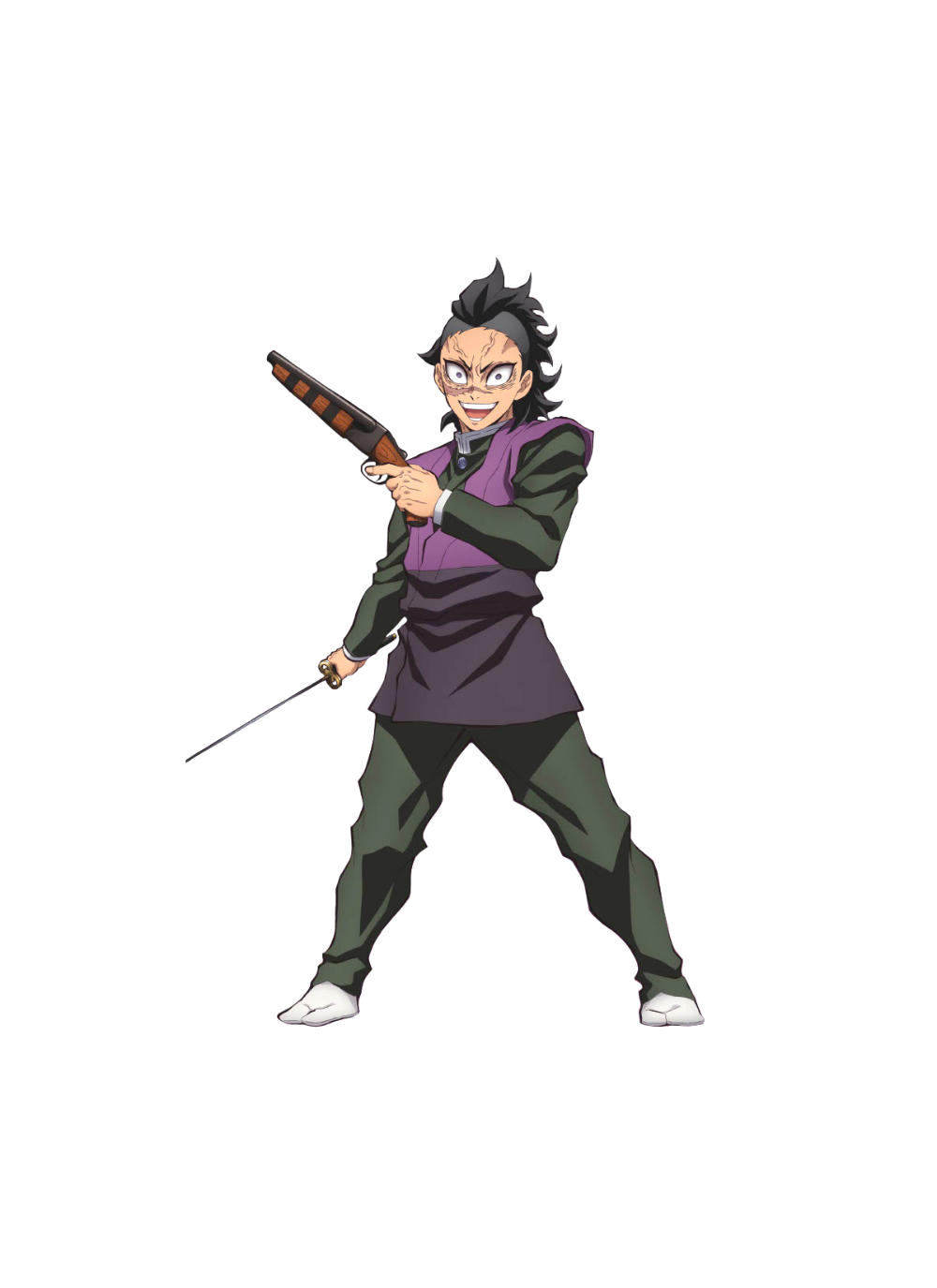 留着深色鸡冠头,左脸有一道延伸至鼻头的伤疤,是过去被鬼化的母亲攻击所留下的。武器为一把日轮刀,还配有一把火绳枪。体能方面差劲也无法使用呼吸,但其强大的咬合力和特殊的消化器官,让他拥有将鬼吃掉后让自身体质短暂变成鬼的特异“味觉”,吃的鬼越强再生能力与力量就提升的越多,是为了更接近柱而使用的苦肉计,在鬼杀队中为难得一见的奇才,缺点是会被弥豆子的血鬼术给波及。