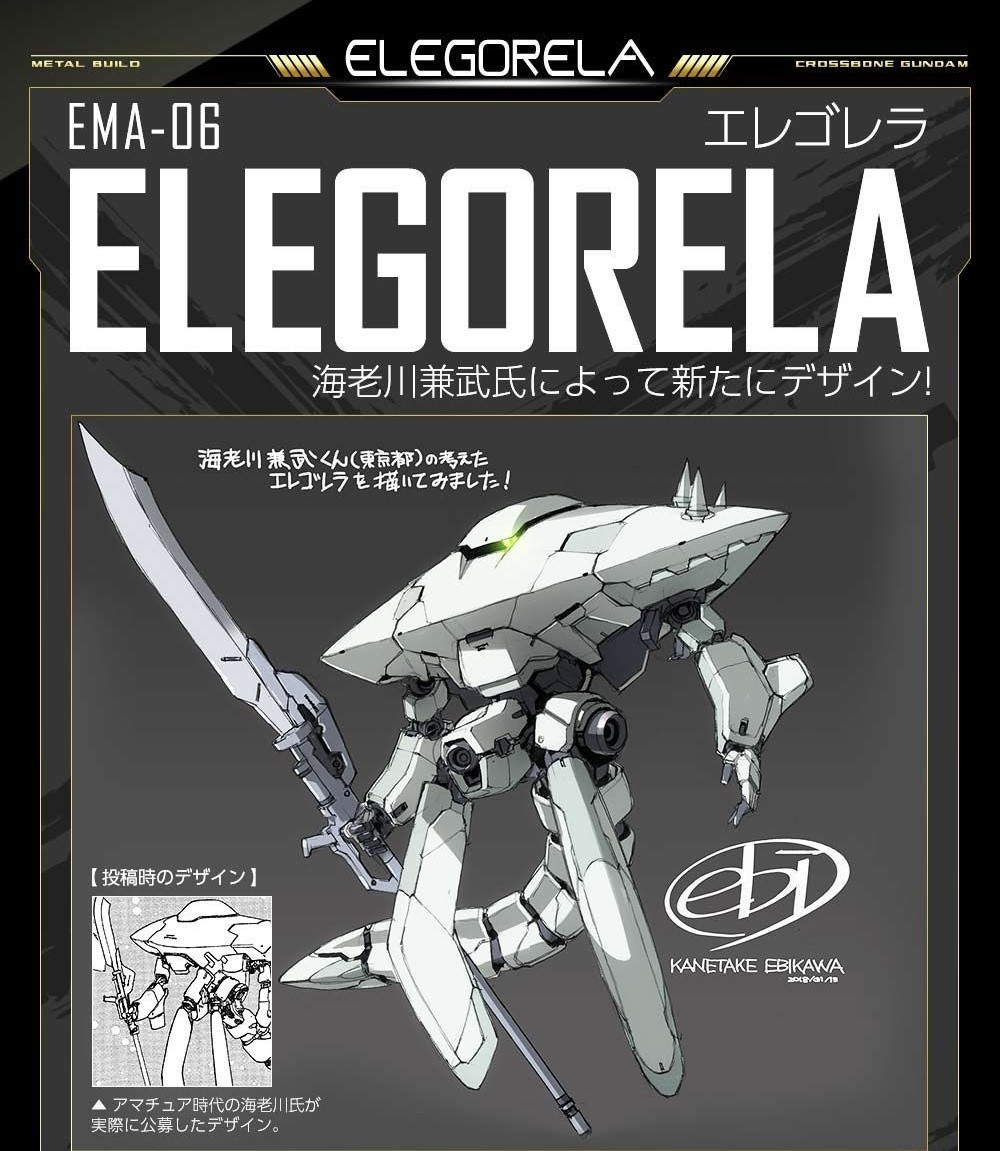 EMA-06 埃尔格里亚(Elegolea)是由木星帝国开发的一款可变式MA,其主武器是一门位于胯下的、在MA和MS形态下都能使用的光束加农炮。此外,埃尔格里亚还安装有三门位于MA形态是鼻子部位的MEGA粒子炮,以及一柄在MS形态下使用的长柄武士刀“剃刀”。此外,埃尔格里亚也可以利用远程计算机进行无人操控。