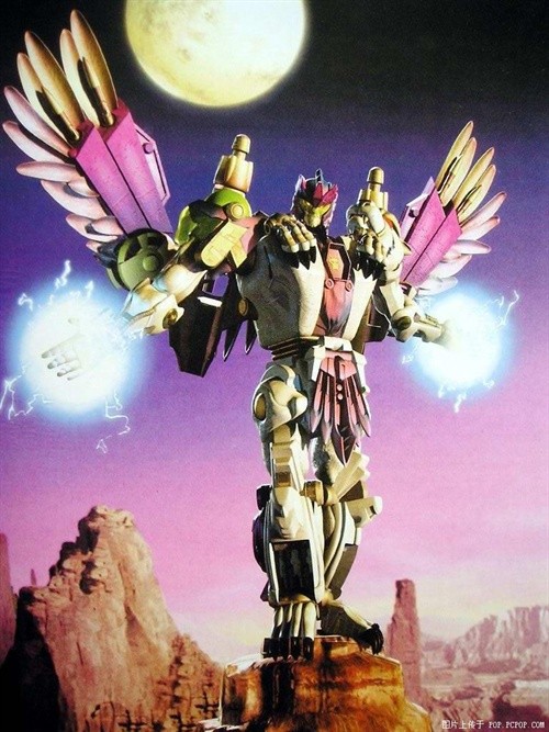 虎鹰勇士来自动画《变形金刚:超能勇士》,高度进化种族「沃克人」融合了飞箭勇士和白虎勇士,由此用以阻止霸王龙威震天的「虎鹰勇士」诞生。被狼蛛勇士抓获后,最终驱使沃克人的影响脱离躯体并使两位勇士的火种得以真正融合,最终化身为虎鹰勇士。不再受沃克人控制的虎鹰勇士同巨无霸并肩作战。具备强大的火力的TA,虽登场较少但因强大的实力而留下深刻印象,最后在只身对抗霸天虎飞船「报应号」时英勇就义。