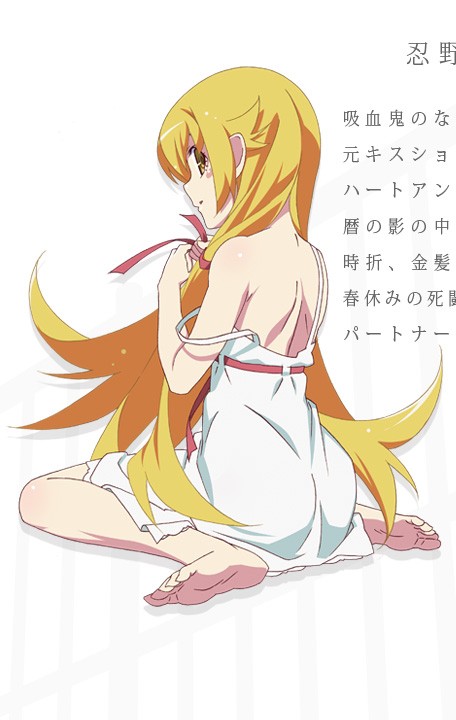 忍野 忍,原キスショット・アセロラオリオン・ハートアンダーブレード (Kissshot Acerolaorion Heartunderblade),铁血的、热血的、冷血的,传说中的金发美女吸血鬼,怪异中的怪异,怪异之王。有着欧洲贵族女性的外表,高大而性感的身材。在遇到阿良良木历时,在世已超过五百年(实际上接近六百年),处于全盛期,能力极其强大,按照埃匹索德的说法,可以毁灭地球三次。