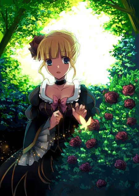 外观是金色头发的少女,身穿华丽黑色礼服,头戴红色玫瑰花状发饰,有着一双深蓝色的眼睛,以及外国人般的姣好身材。