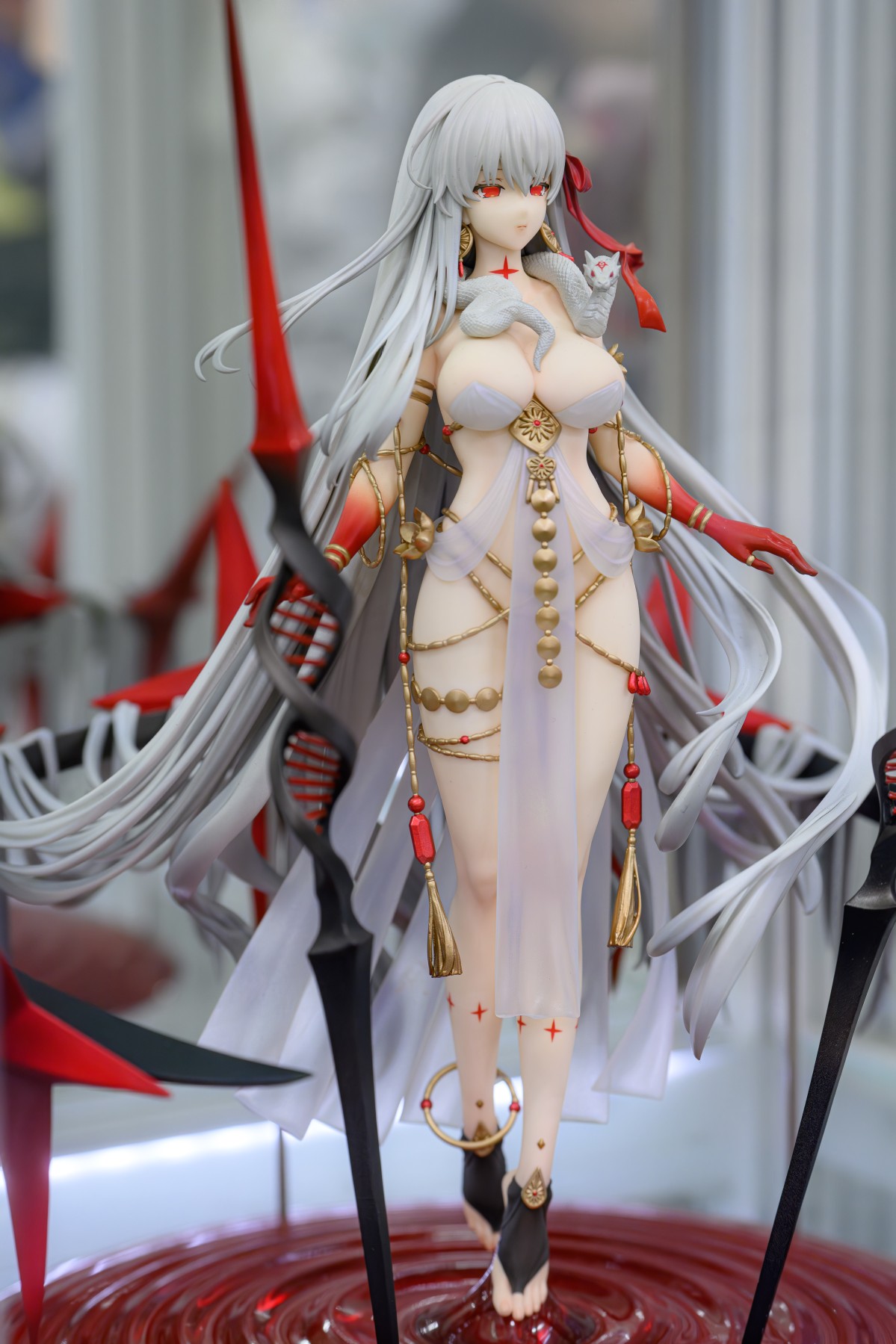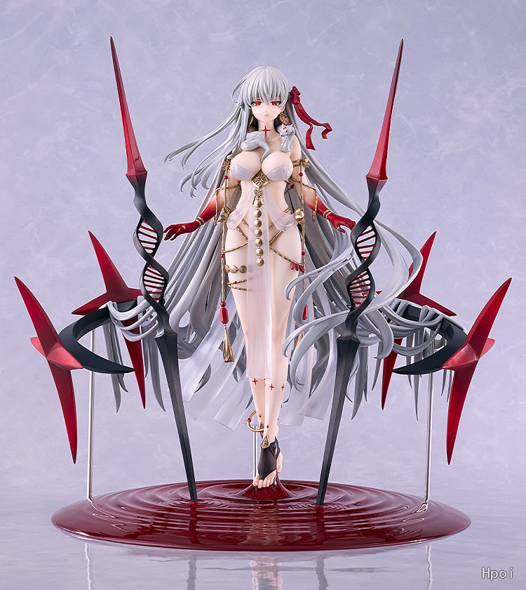 出自超人氣手機遊戲《Fate/Grand Order》,Archer職階的從者「杜爾迦」化身為1/7比例模型。將「虛數羅針內界 平面之月」登場時的靈基第一階段姿態製成模型。忠實重現極具震撼力的神授兵器與絕佳的身材比例。大膽奔放的服裝、裝飾全身的飾品和描繪出美麗線條的後部髮型等都相當吸睛。台座以原插畫為意象,打造出水面的樣式。敬請將神秘的終極殲滅女神帶回家鑑賞吧。