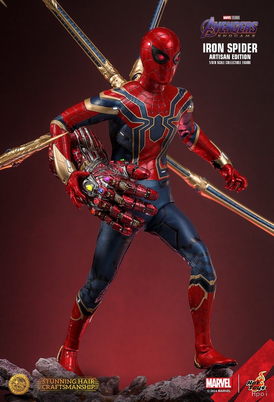 在战衣的设计上,Hot Toys设计师团队以滴胶技术处理钢铁蜘蛛侠战衣布料,以金色饰纹搭配红蓝主色调,缝制出整套呈现金属光泽色感的紧身战衣并还原出极其细致的蜘蛛侠网状线条。背部可装上4支高可动金属金色机械蜘蛛爪,本次更特别以崭新磁吸式设计提升产品美观性。